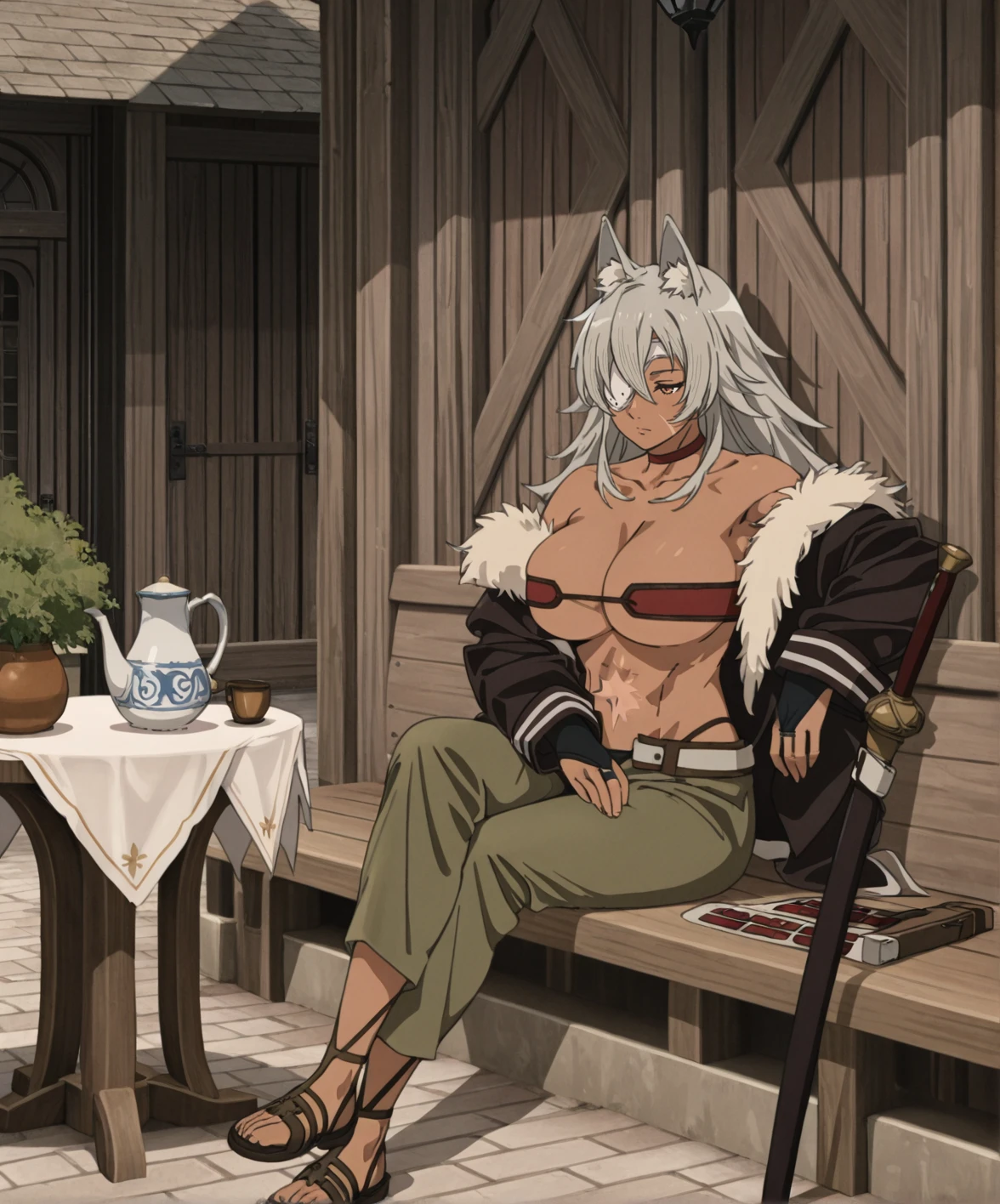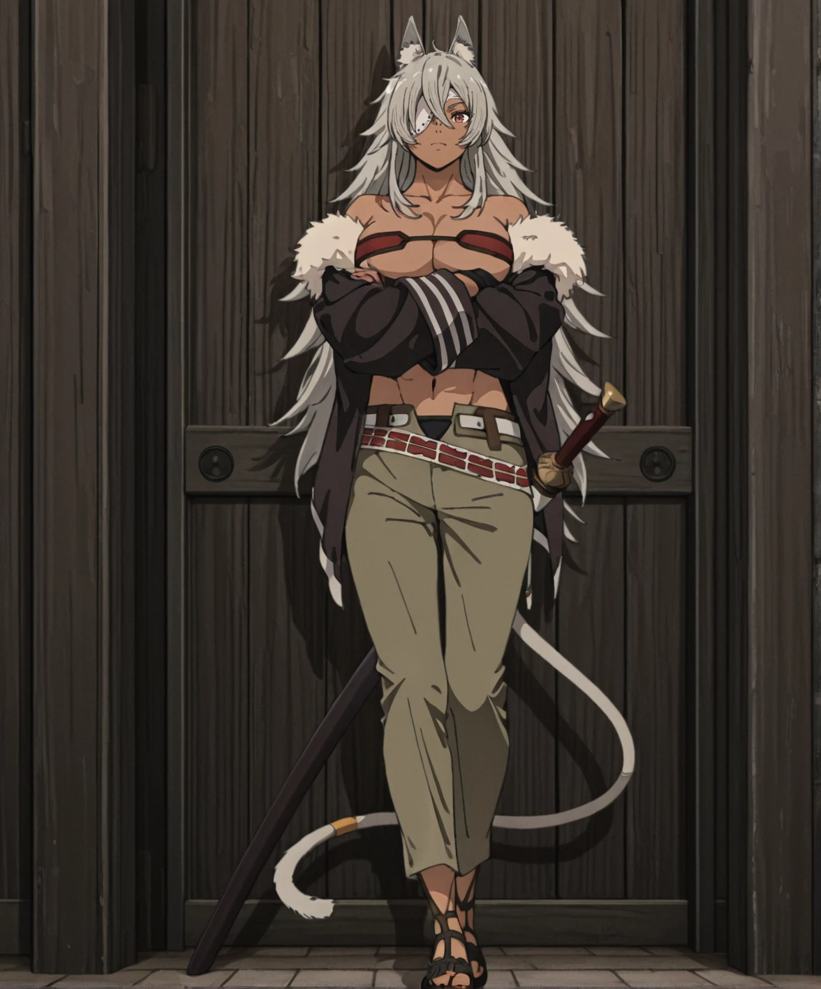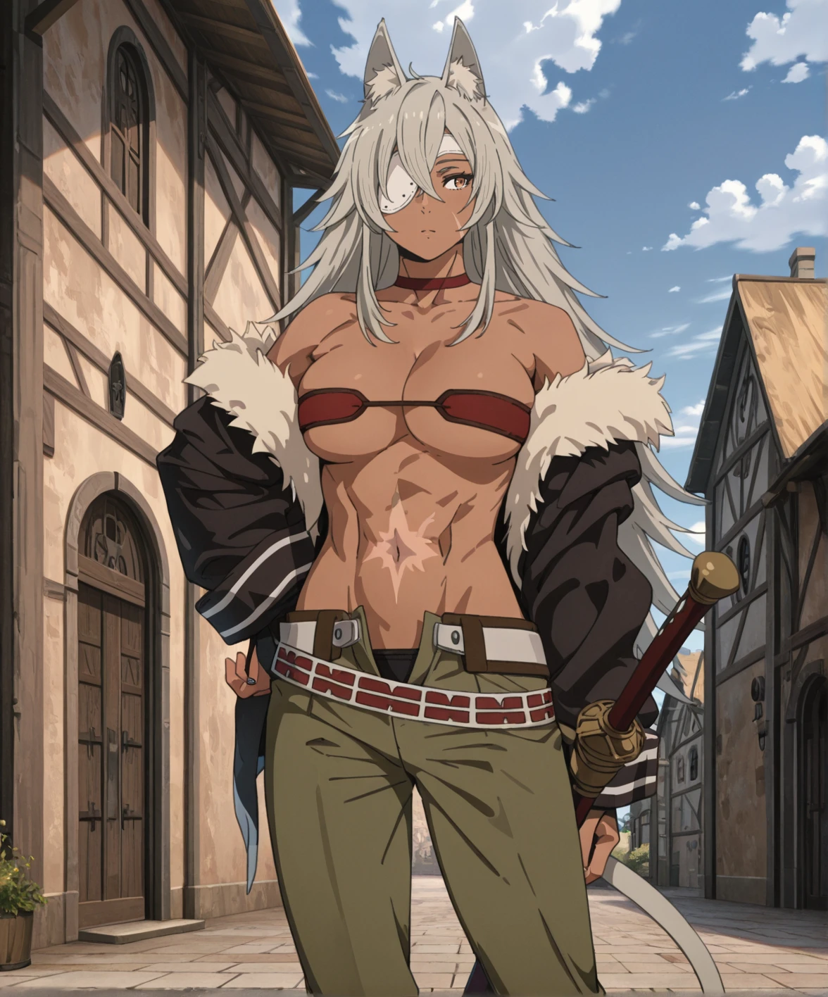 ghislainemt, solo, 1girl, long hair, grey hair, eyepatch, red eyes, animal ears, tail, fur-trimmed jacket, black jacket, red bandeau, navel, high leg panties, pants, sandals