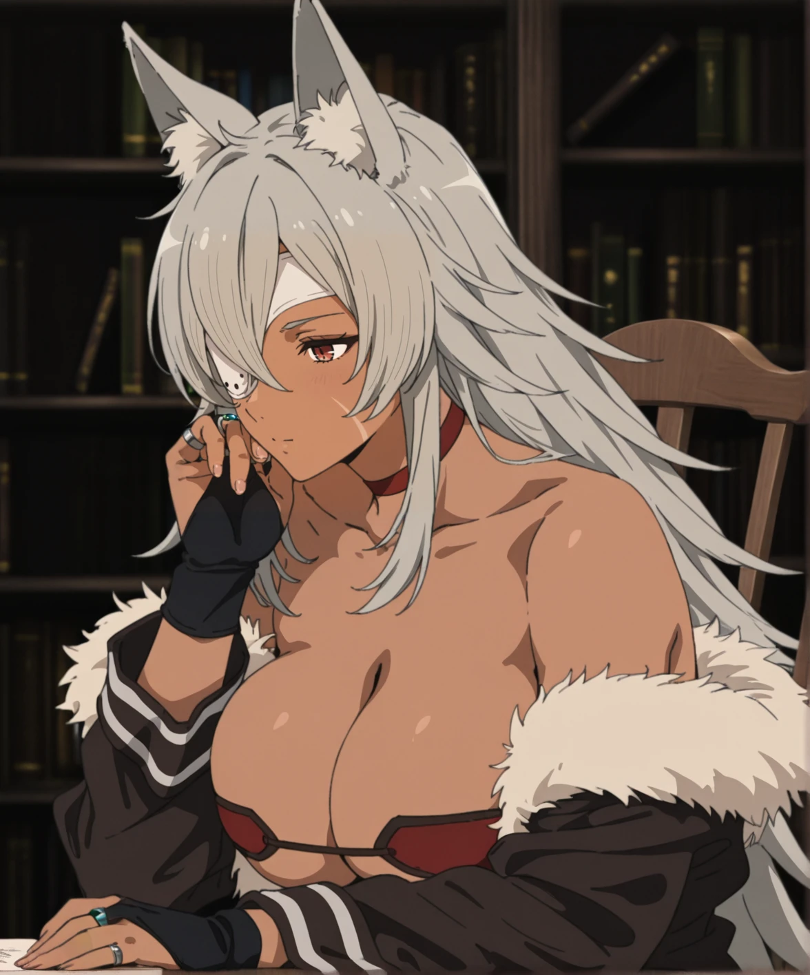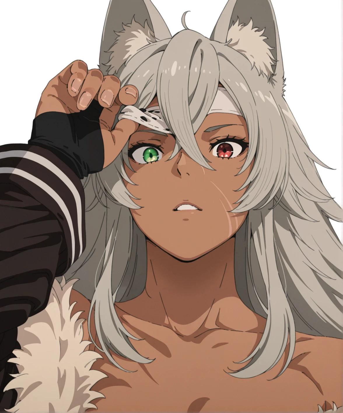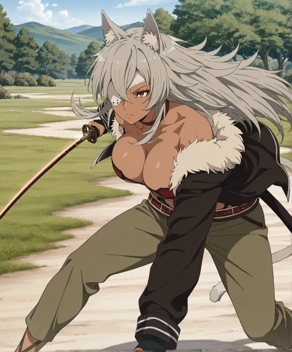 ghislainemt, solo, 1girl, long hair, grey hair, eyepatch, red eyes, animal ears, tail, fur-trimmed jacket, black jacket, red bandeau, navel, high leg panties, pants, sandals