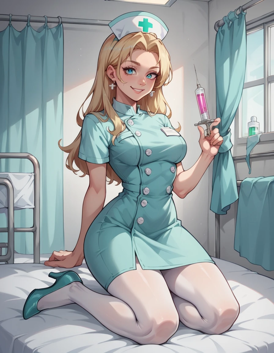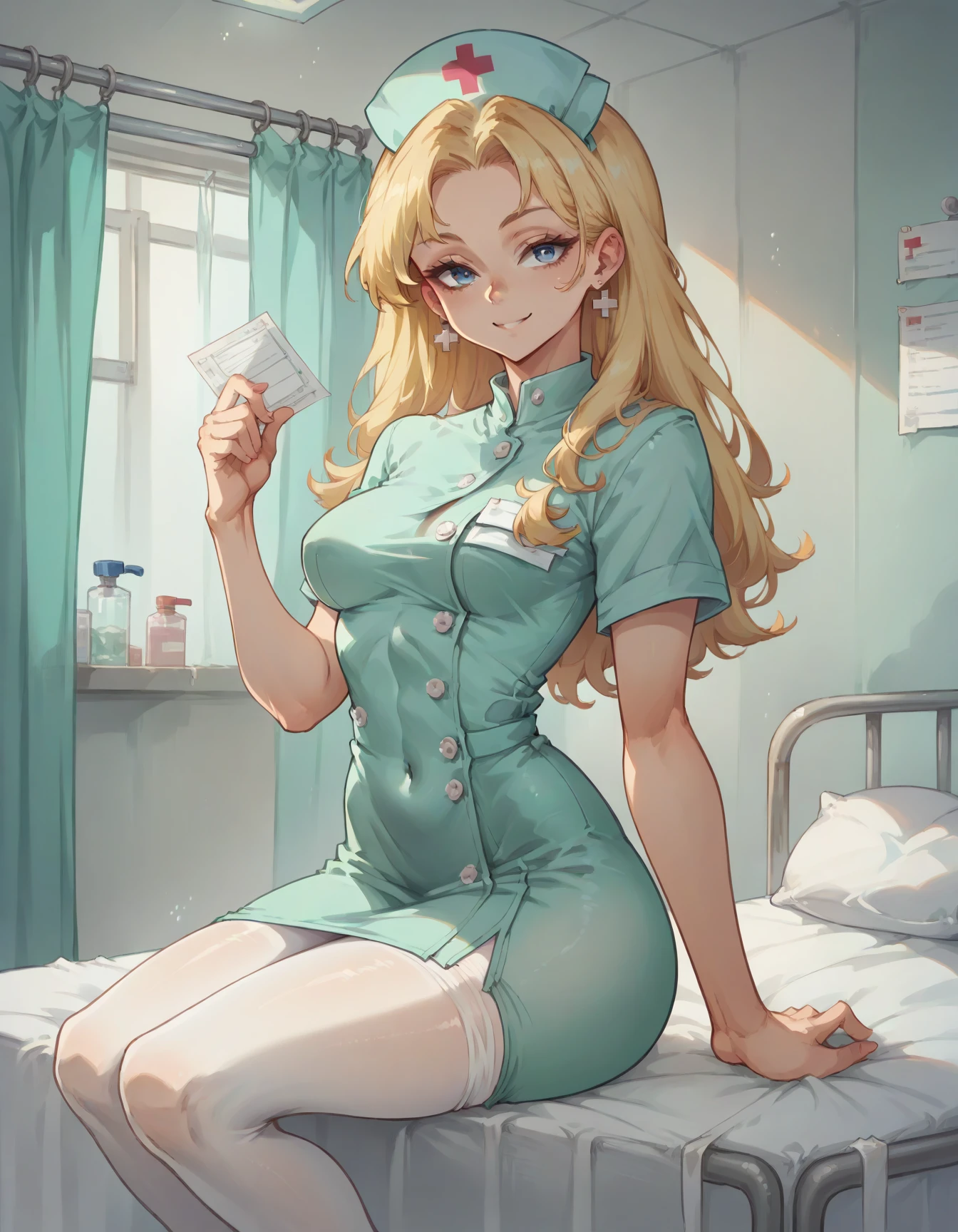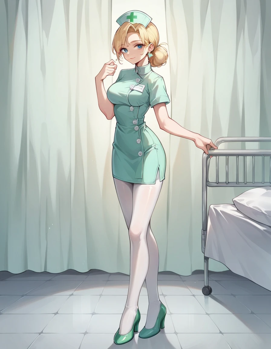 hud_nrse_vintg, white nurse cap, white pantyhose, mint green dress, white buttons, short sleeves, jewelry, earrings, breasts, mint green high heels