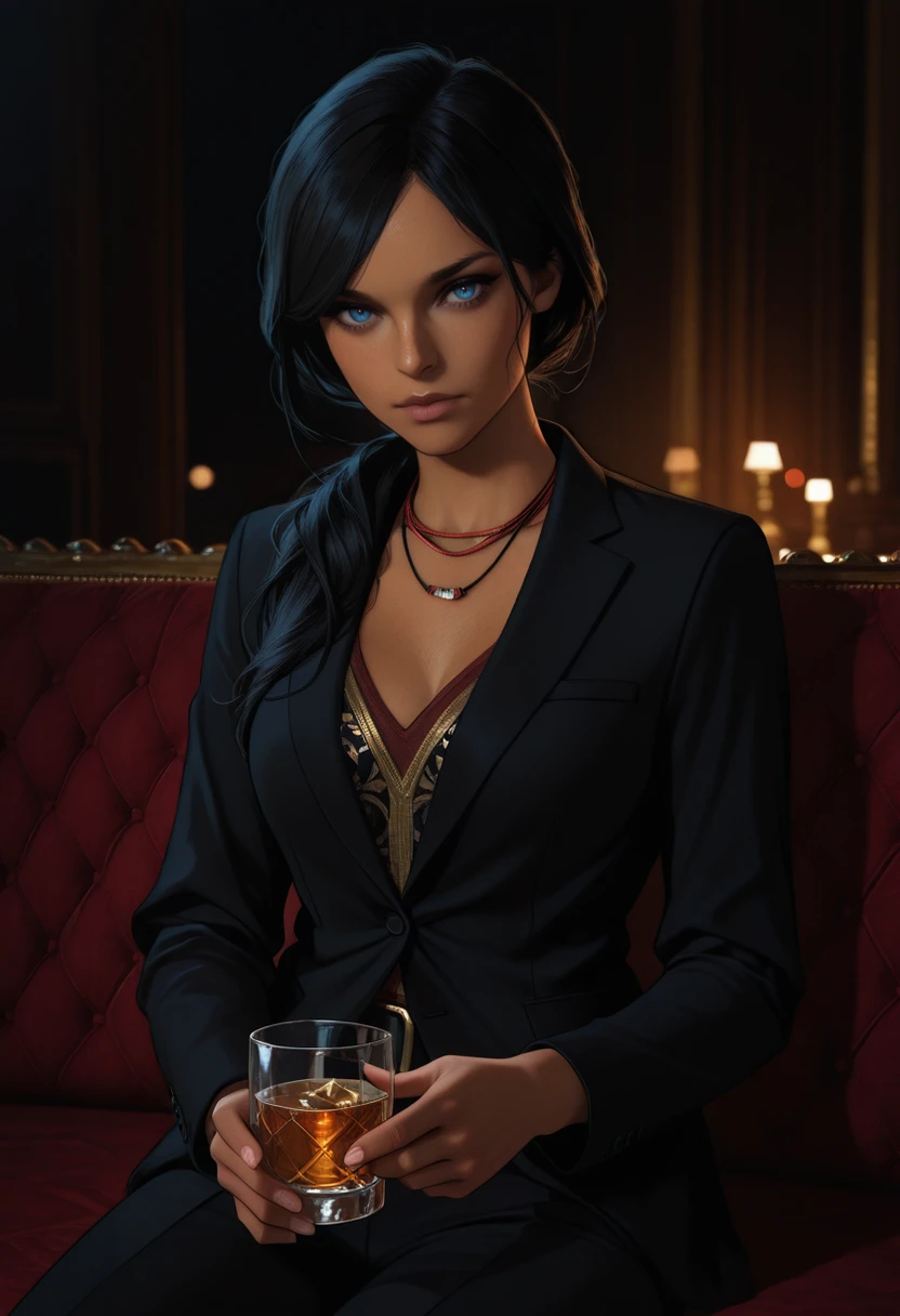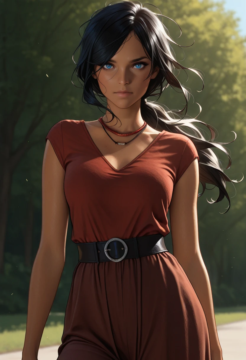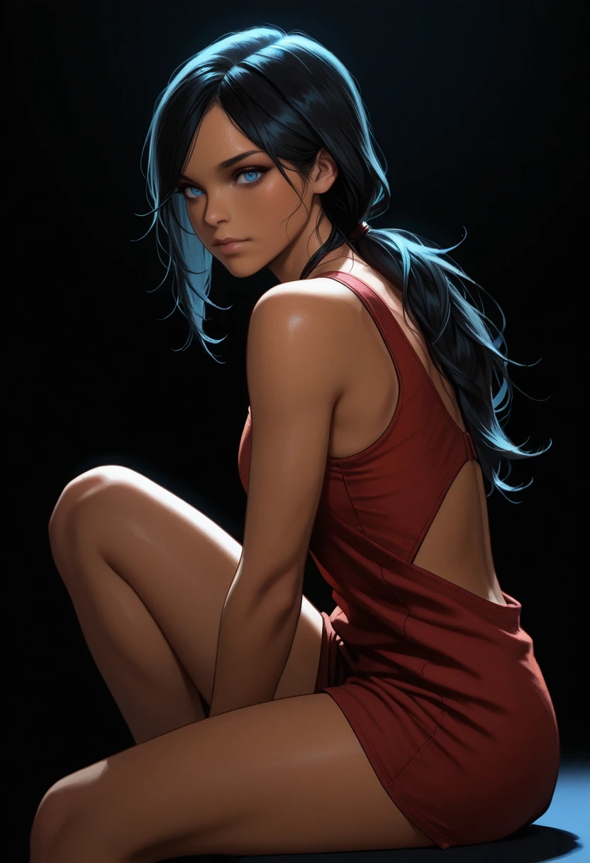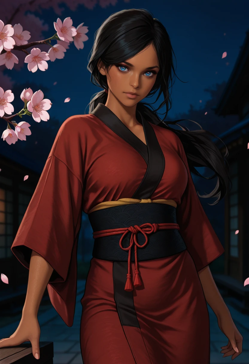 UncChloe, 1girl, black hair, long hair, low ponytail, blue eyes, dark skin