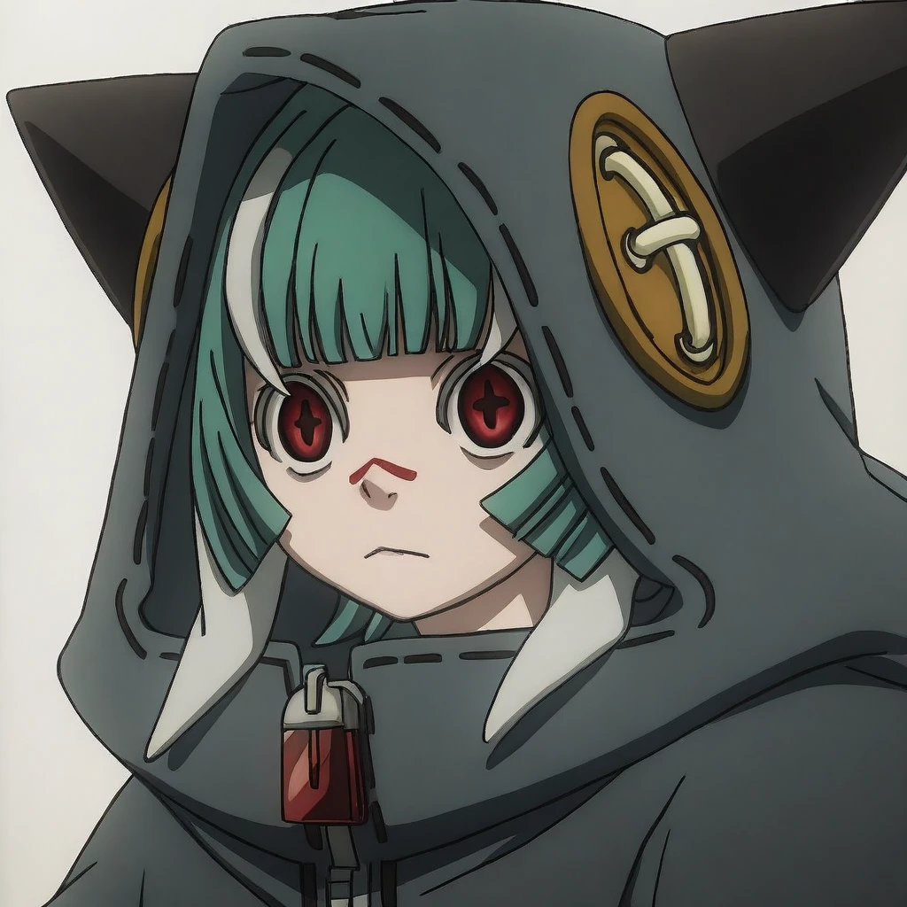 animal hood, animal ears, buttoned hood, cross-shaped buttons round buttons, cross-shaped round buttons, zipper pull tab, zipper, hood up, hair peeking from hood,