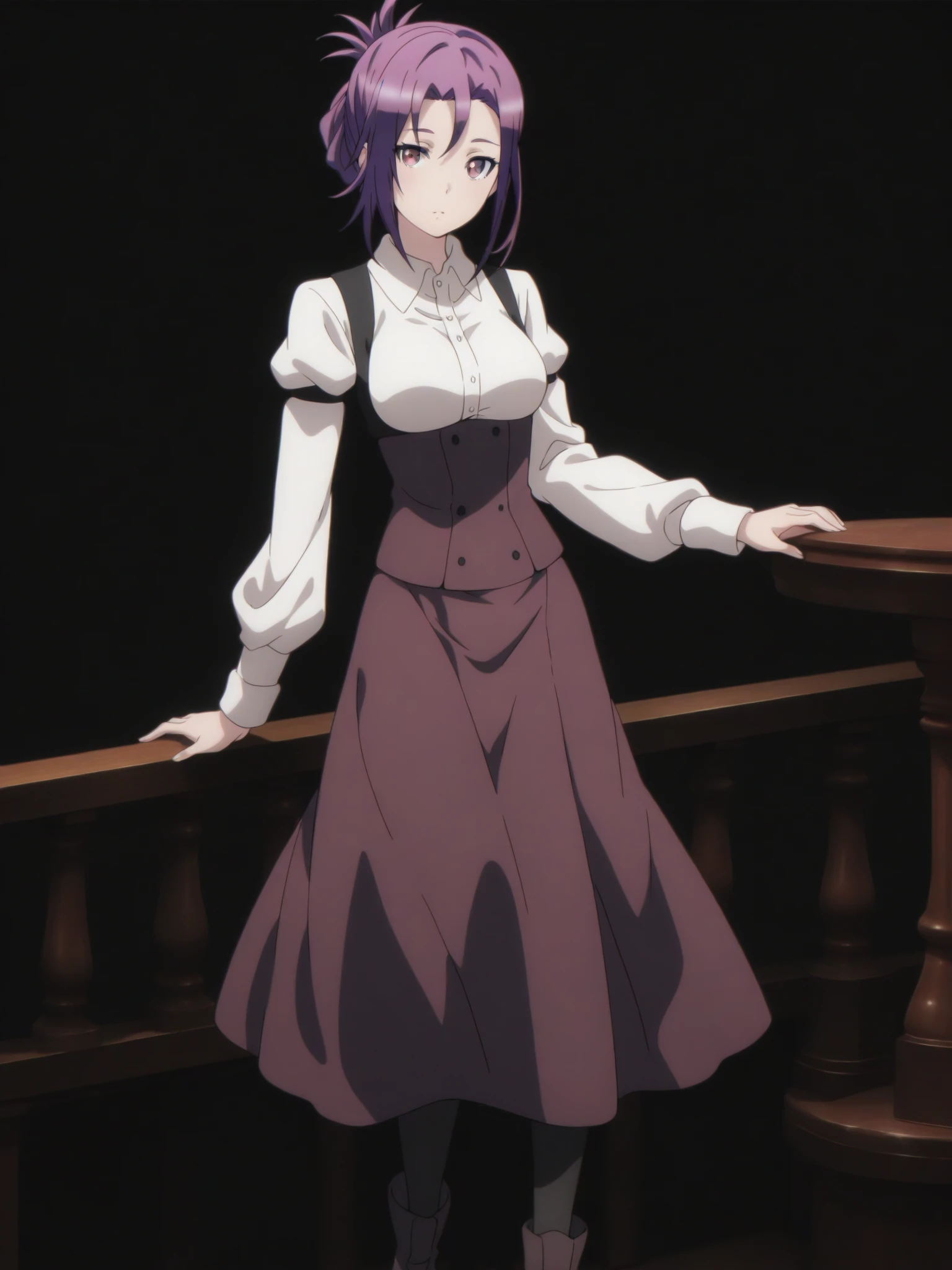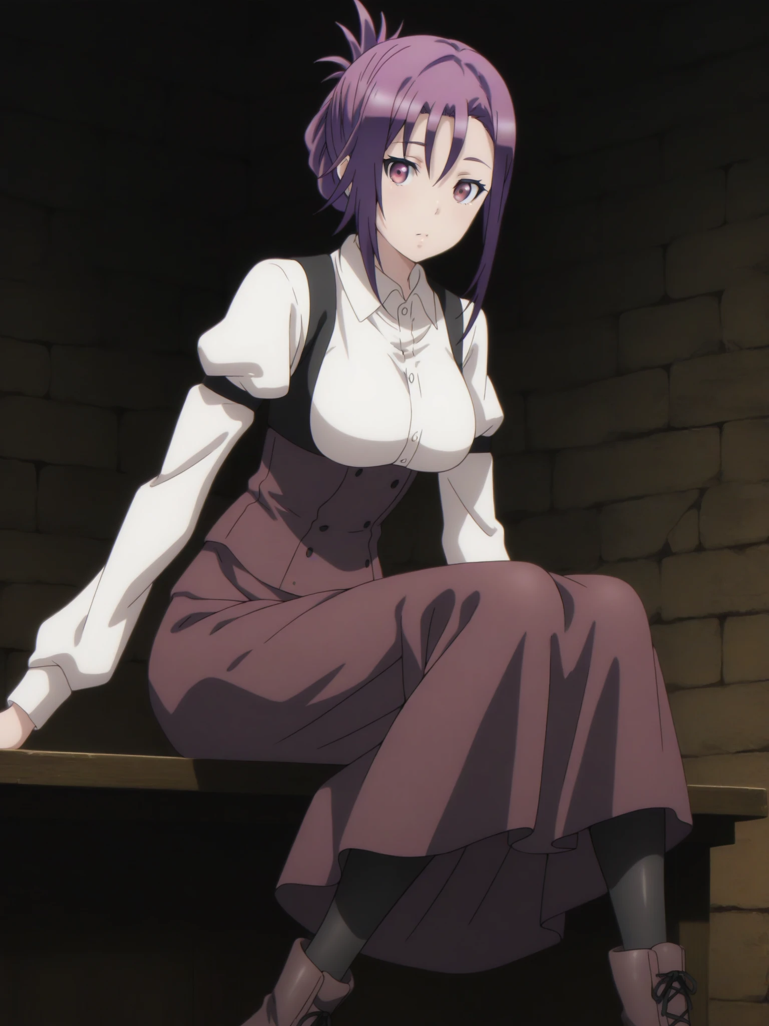 Clothes: (white collared shirt, long sleeves, underbust vest, long skirt, black pantyhose, ankle boots)