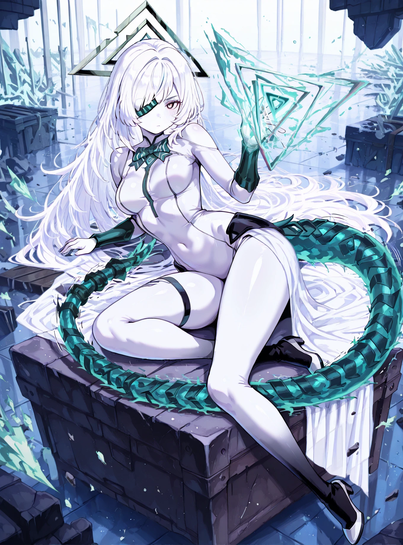 amnedia, tail, 1girl, long hair, bangs, eyepatch, white hair, white ears, white skin girl ,body suit, white footwear, white bodysuit