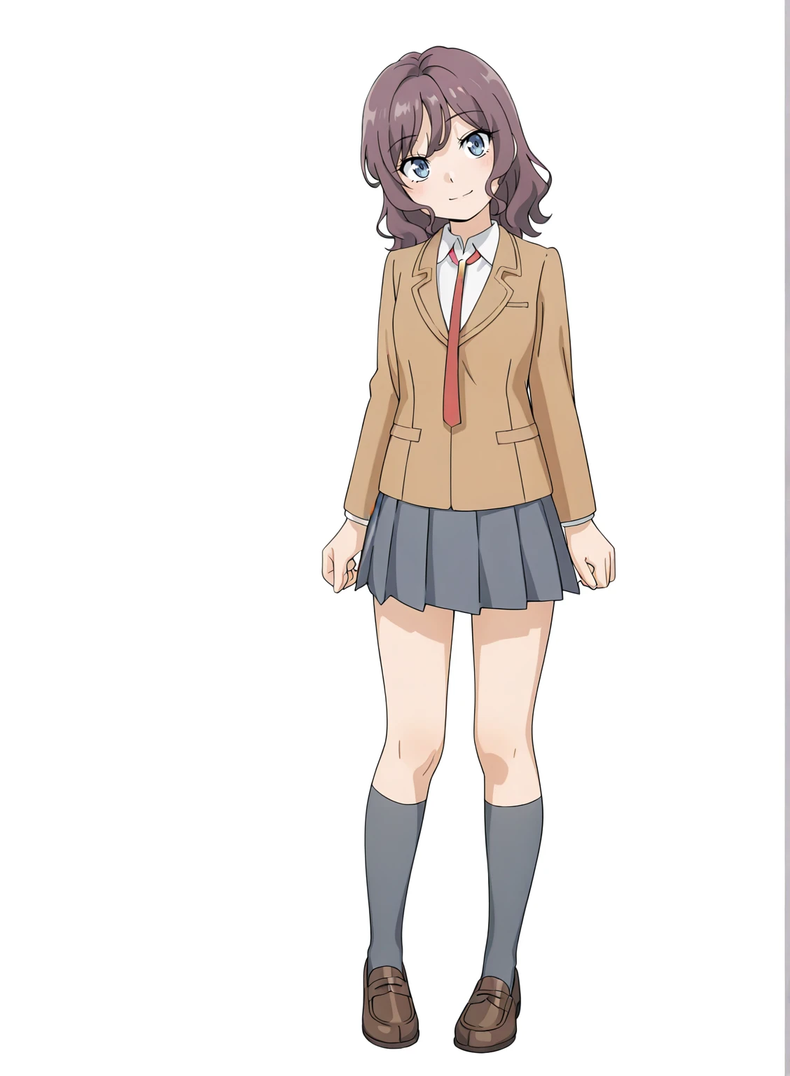 school uniform, brown jacket, blazer, white shirt, collared shirt, red necktie, pleated skirt, grey skirt, grey socks, kneehighs, brown footwear, loafers,