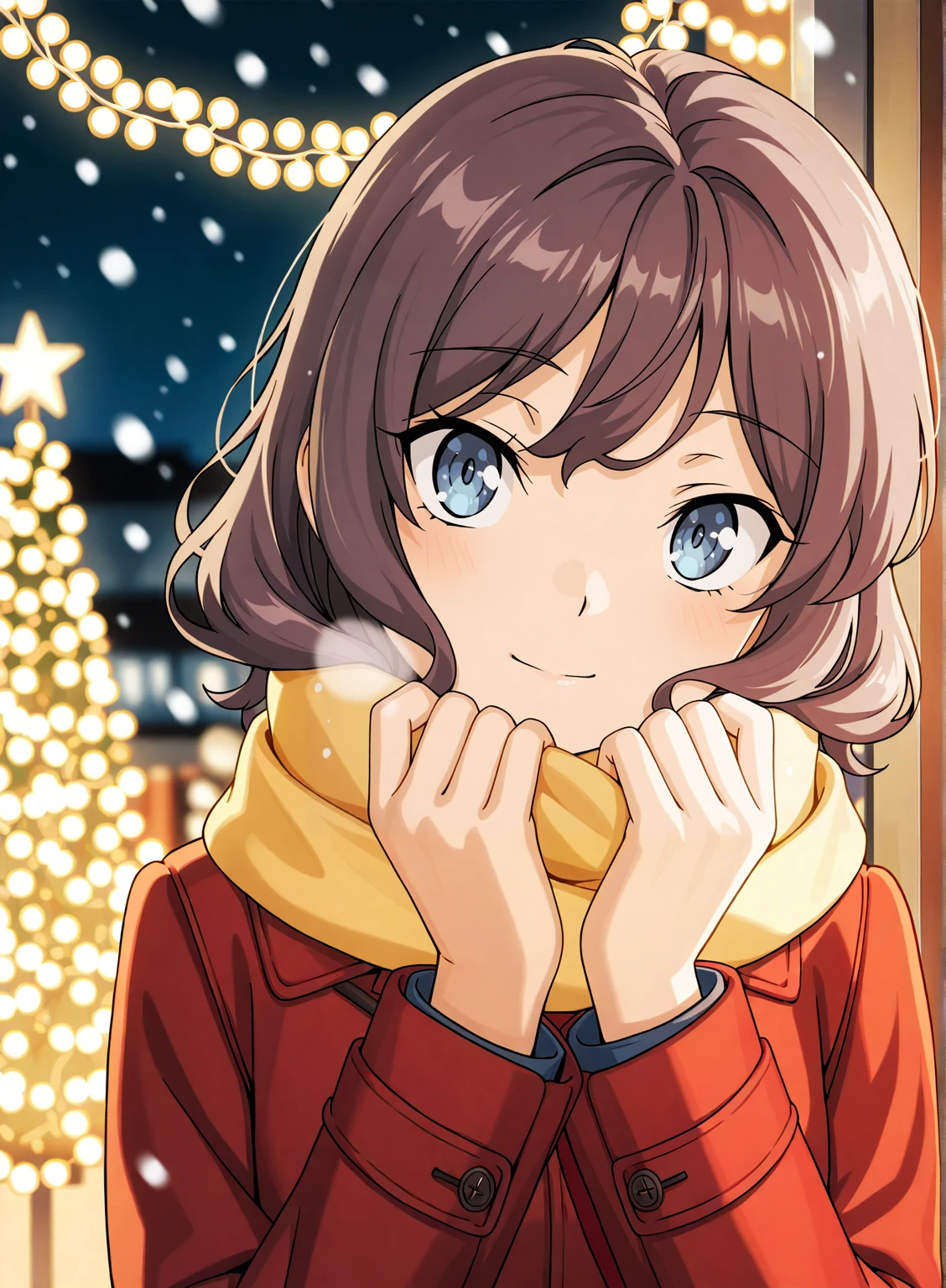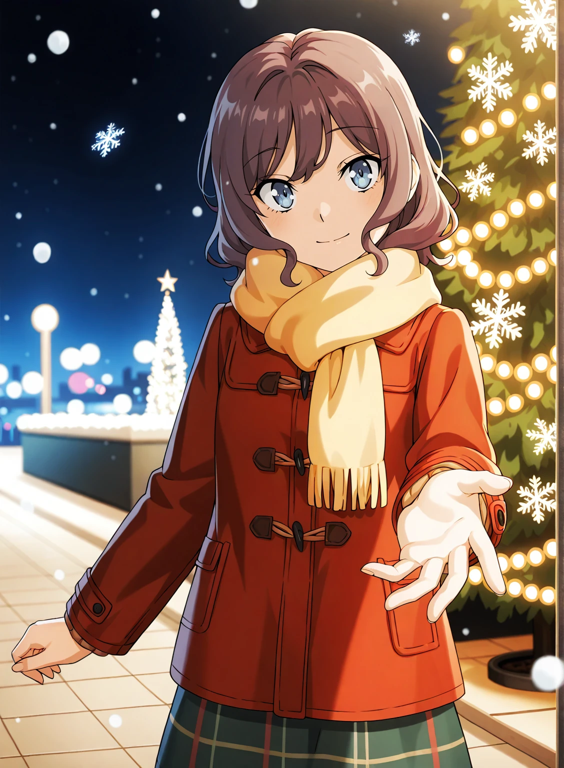 yellow scarf, red coat, long sleeves, green skirt, plaid skirt