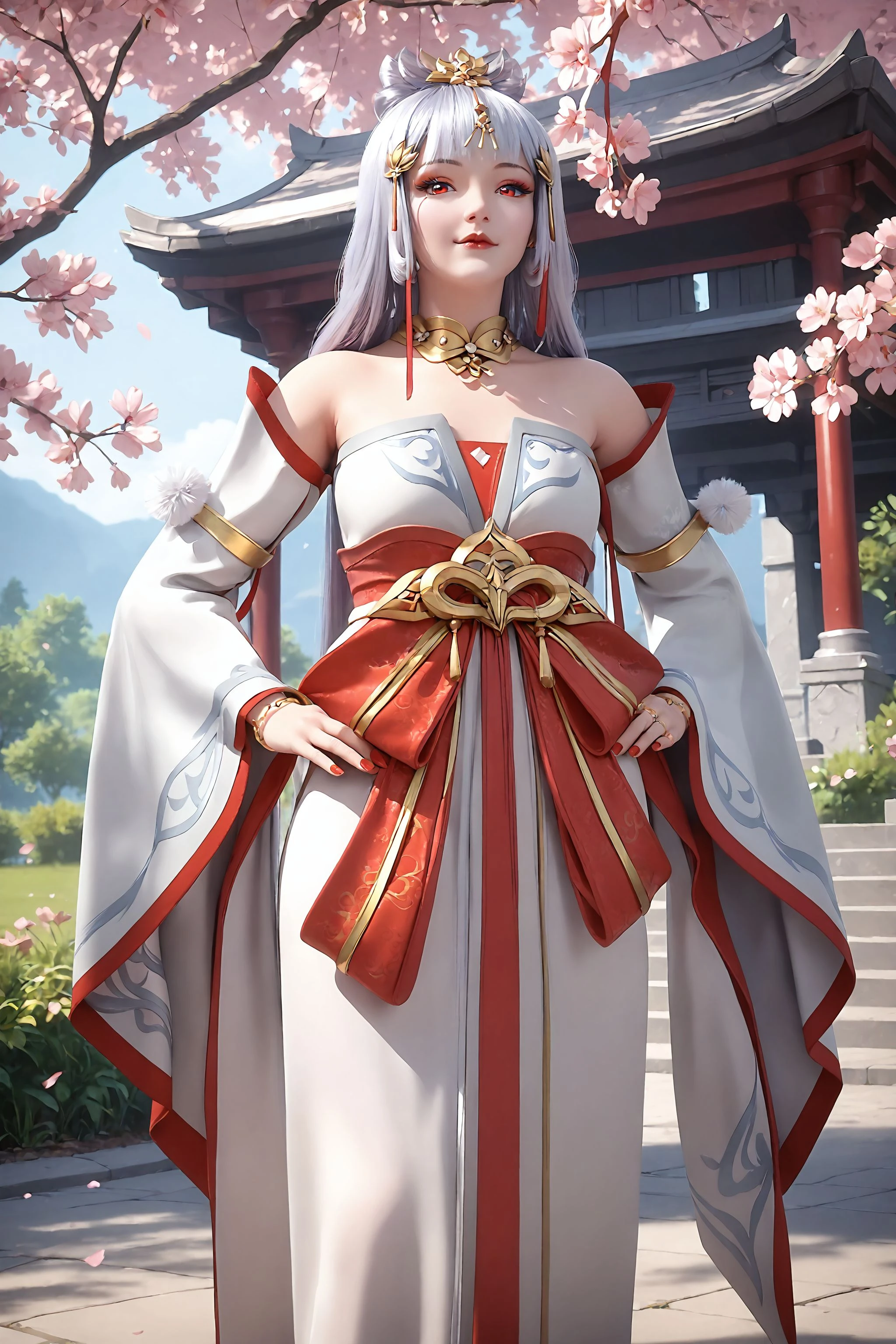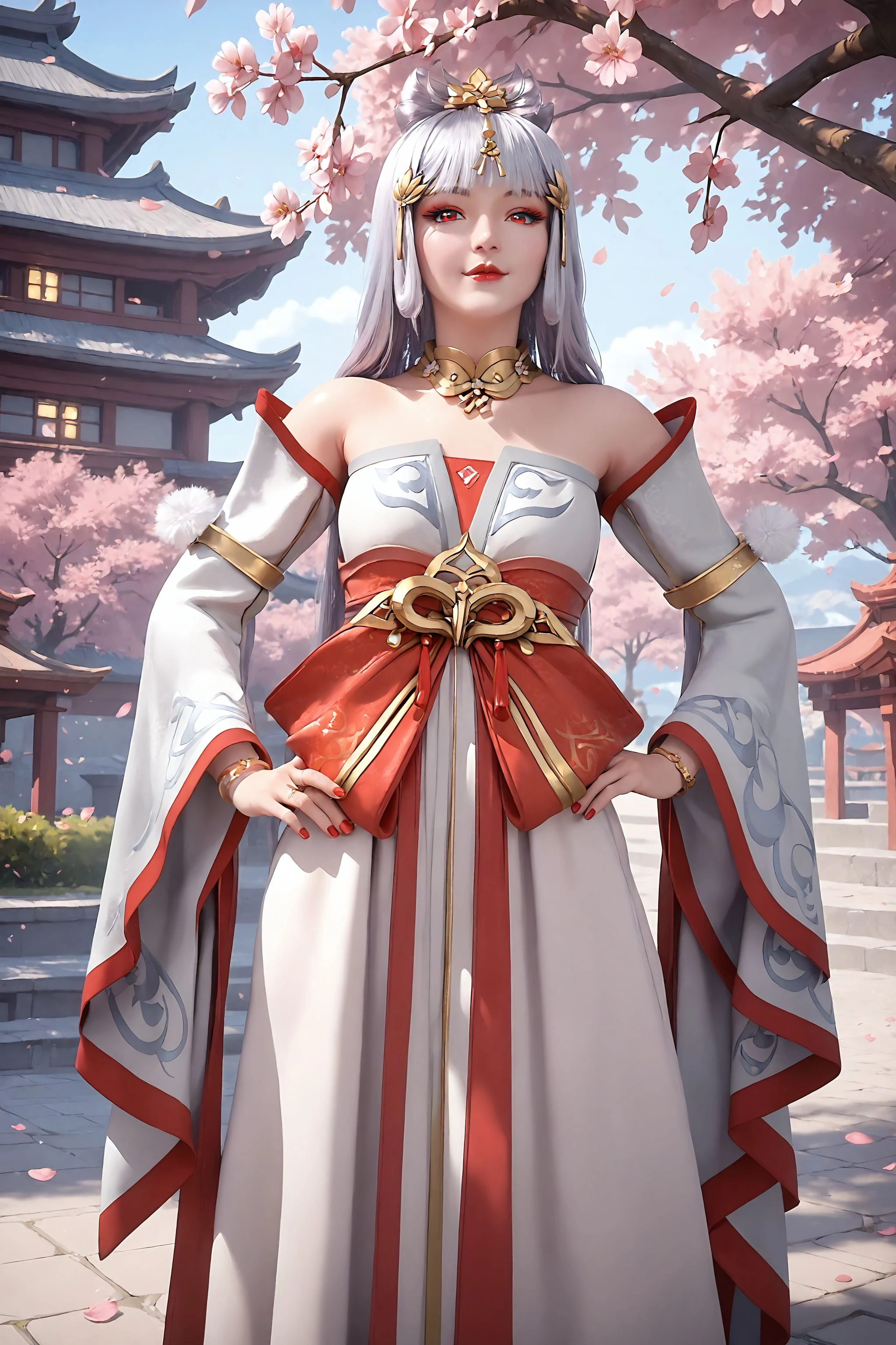 1girl, solo, red eyes, hands on own hips, long hair, hair ornament, jewelry, bracelet, detached sleeves, wide sleeves, dress, nail polish, makeup, necklace