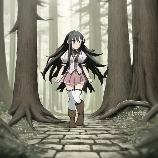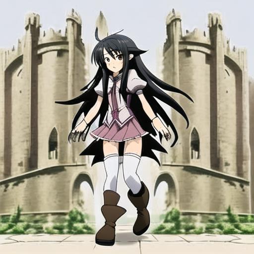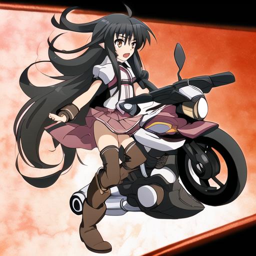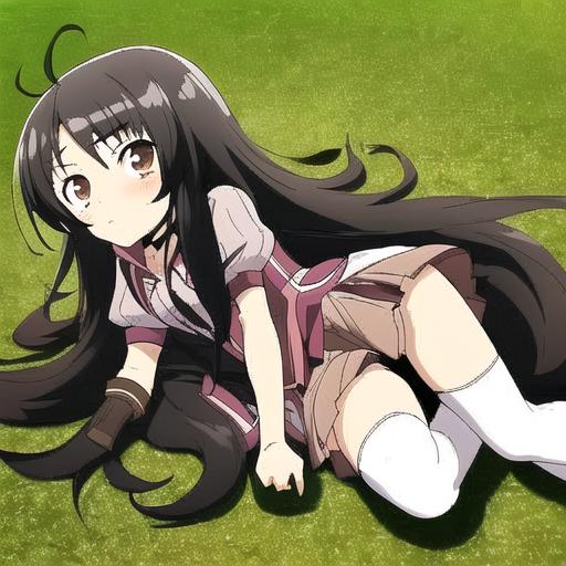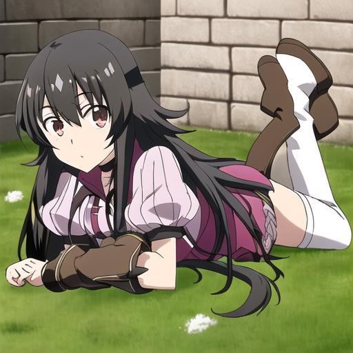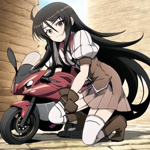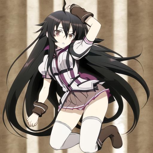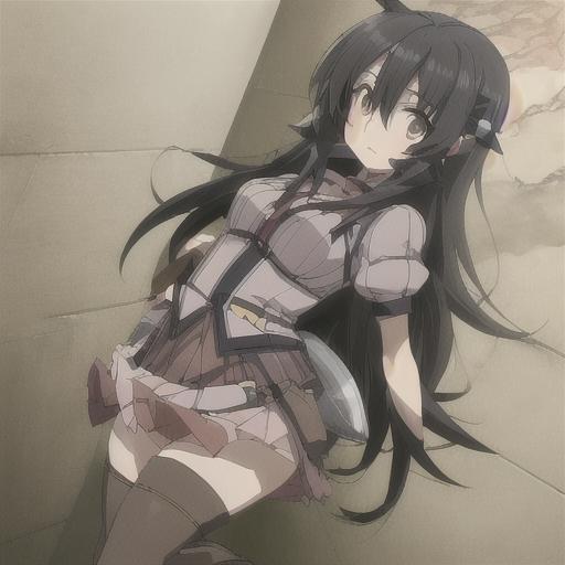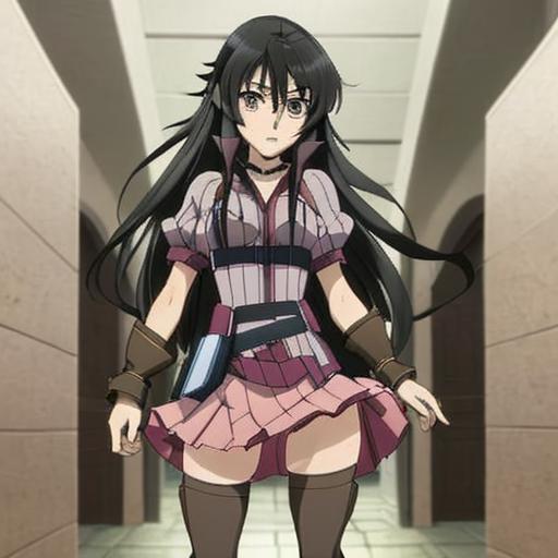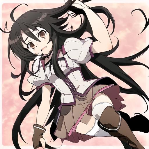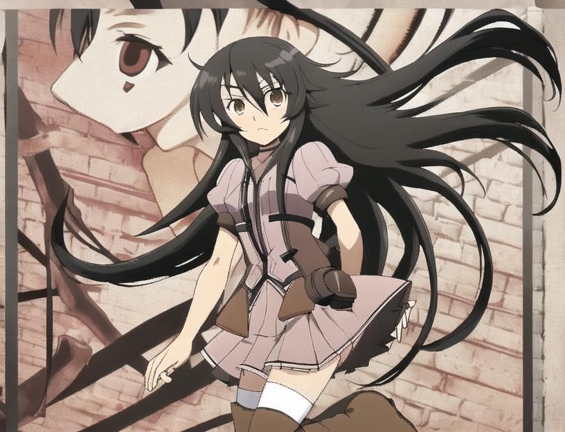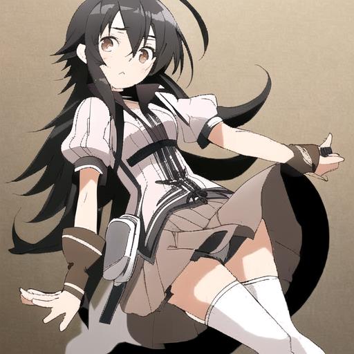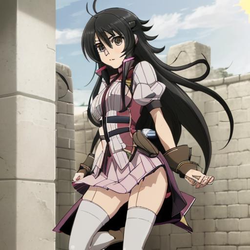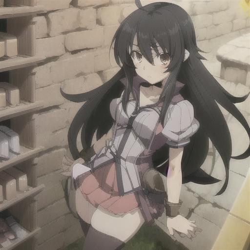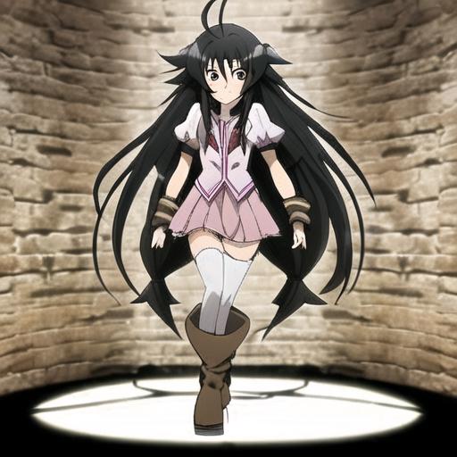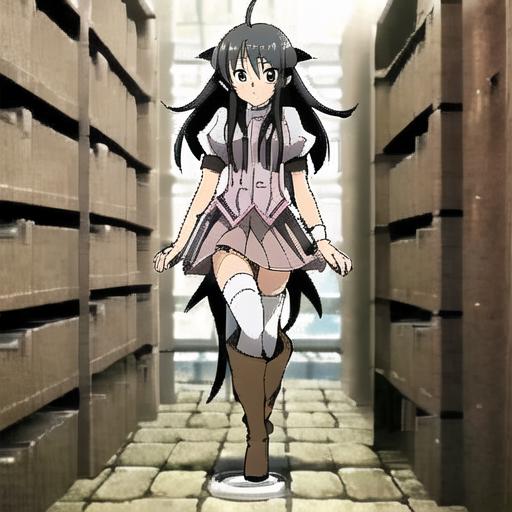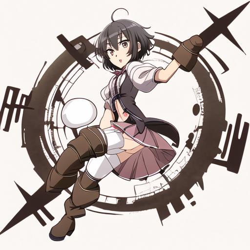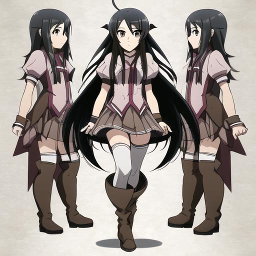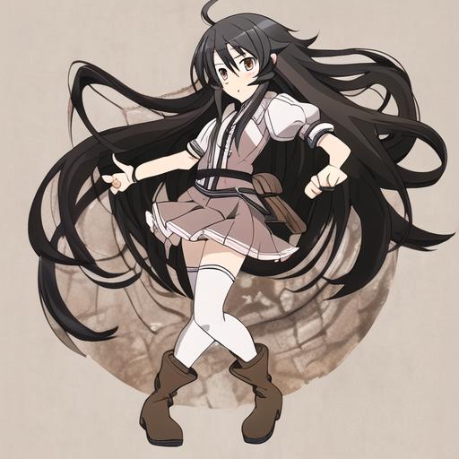 Adeltrud Walter,long hair,black hair,brown eyes,miniskirt,white THIGHHIGHS,brown boots,short sleeves