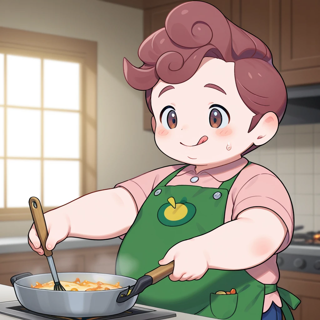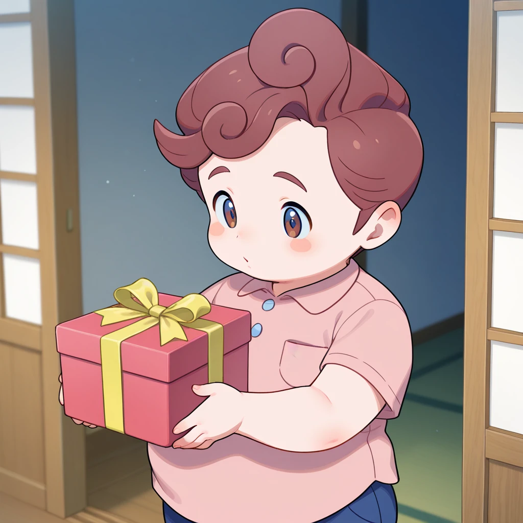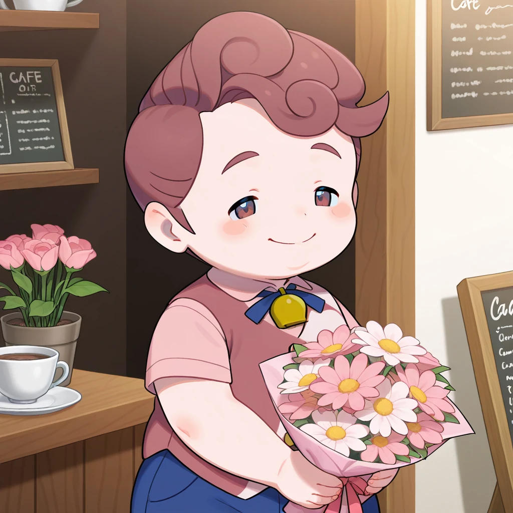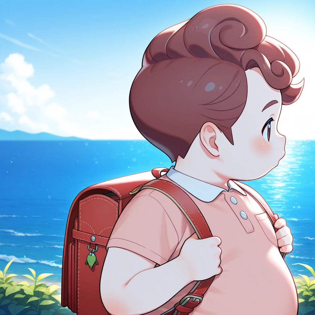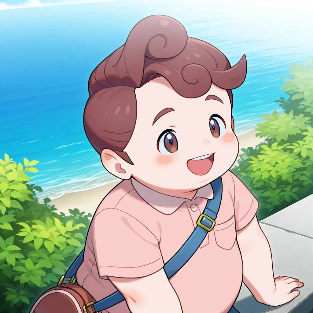 chubby_face,young, short male,solo,neck_bell, (pink shirt), two-tone vest, blue_shorts, pink_socks, brown_shoes,