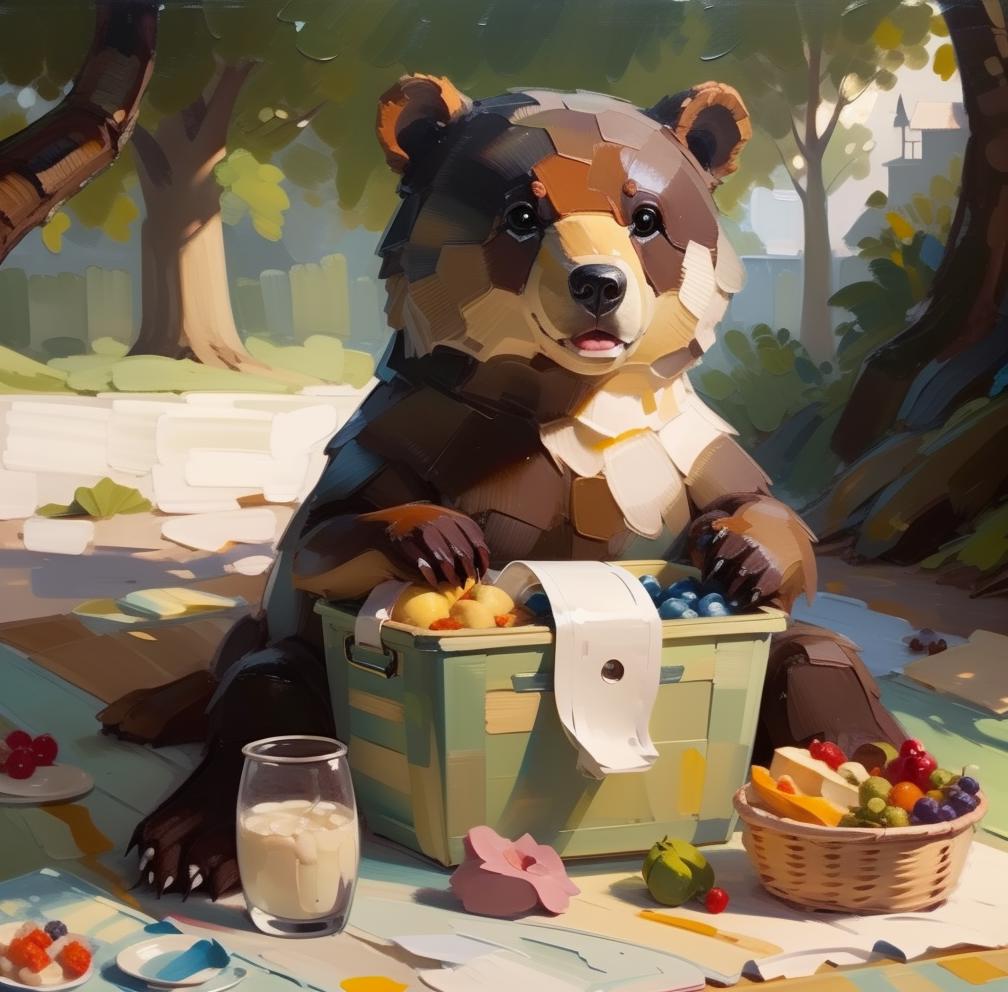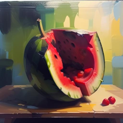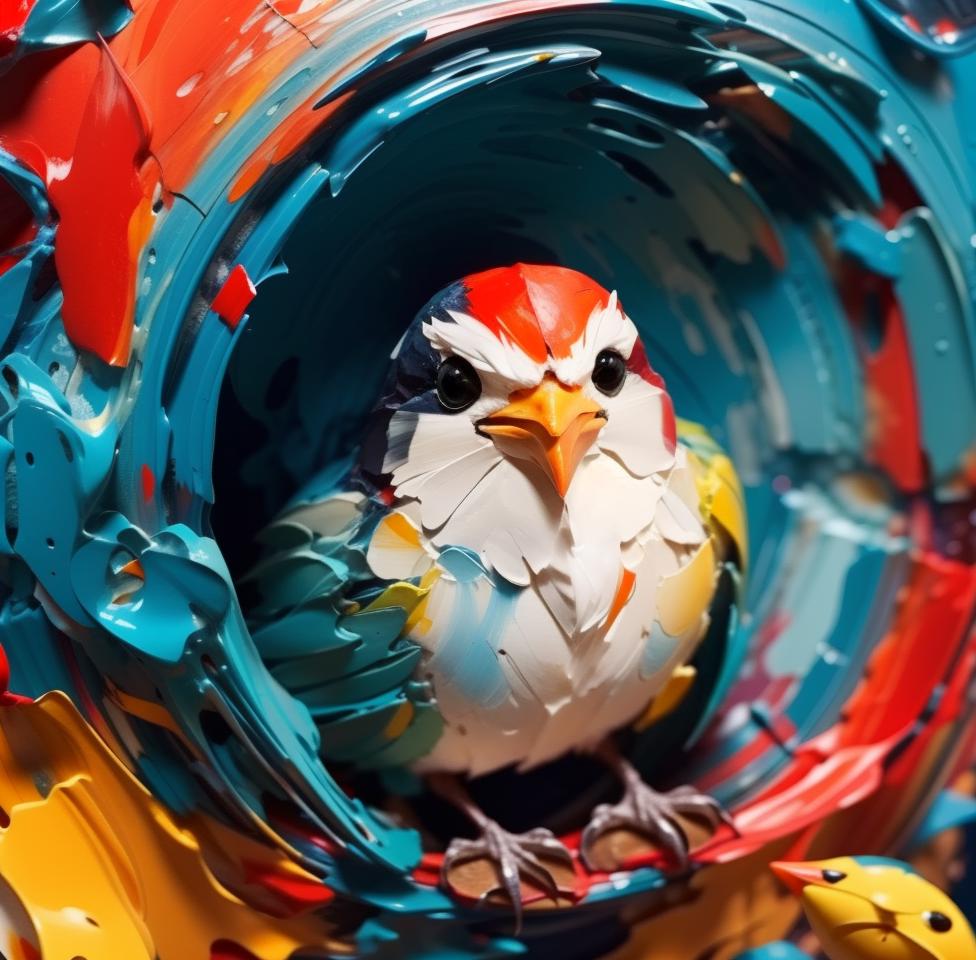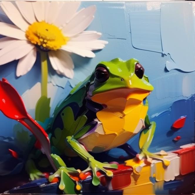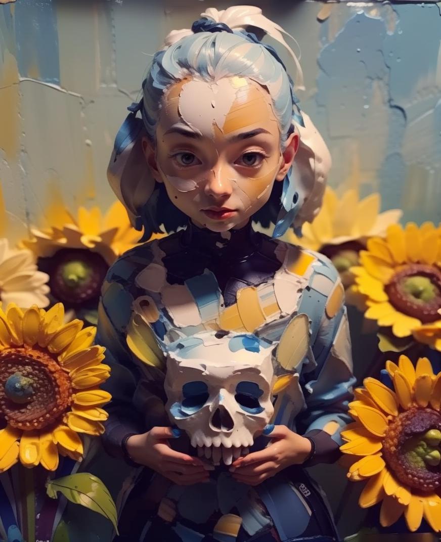 The model draws with thick colors in the style of impasto painting