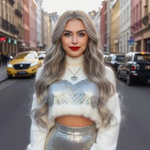Woman with long, wavy silver blonde hair and a heavy makeup look, including fake lashes, winged eyeliner, and filled in brows, wearing an extremely fluffy cropped sweater, smiling and looking at the camera, showing well-arranged white teeth, vibrant red lipstick on lips, green eyes, with a background of a busy street with cars and buildings