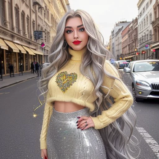 Woman with long, wavy silver blonde hair and a heavy makeup look, including fake lashes, winged eyeliner, and filled in brows, wearing an extremely fluffy cropped sweater, smiling and looking at the camera, showing well-arranged white teeth, vibrant red lipstick on lips, green eyes, with a background of a busy street with cars and buildings,