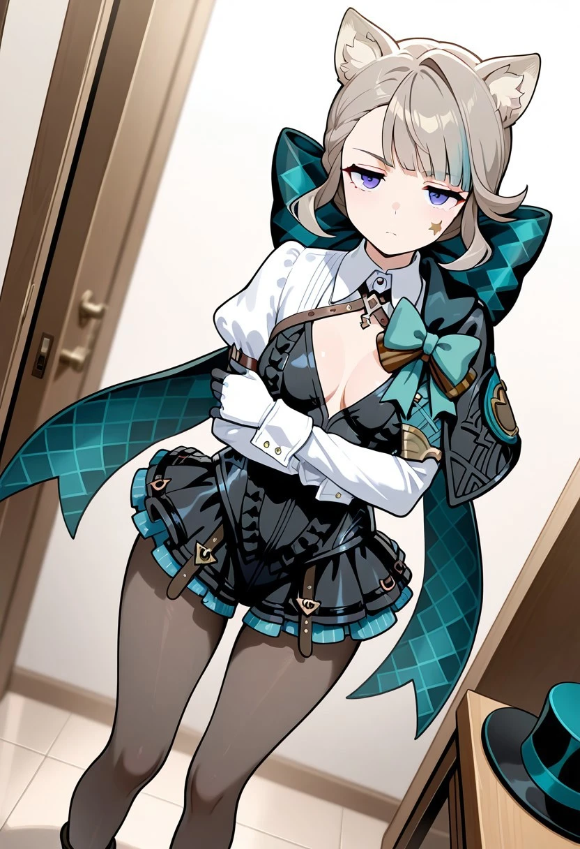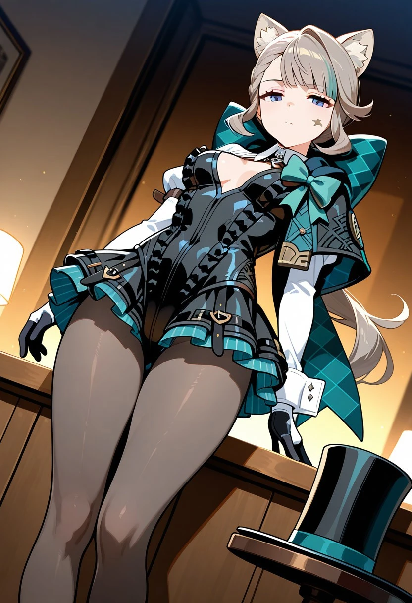 bow, green bow, hat, leotard, long sleeves, miniskirt, pantyhose, skirt, top hat