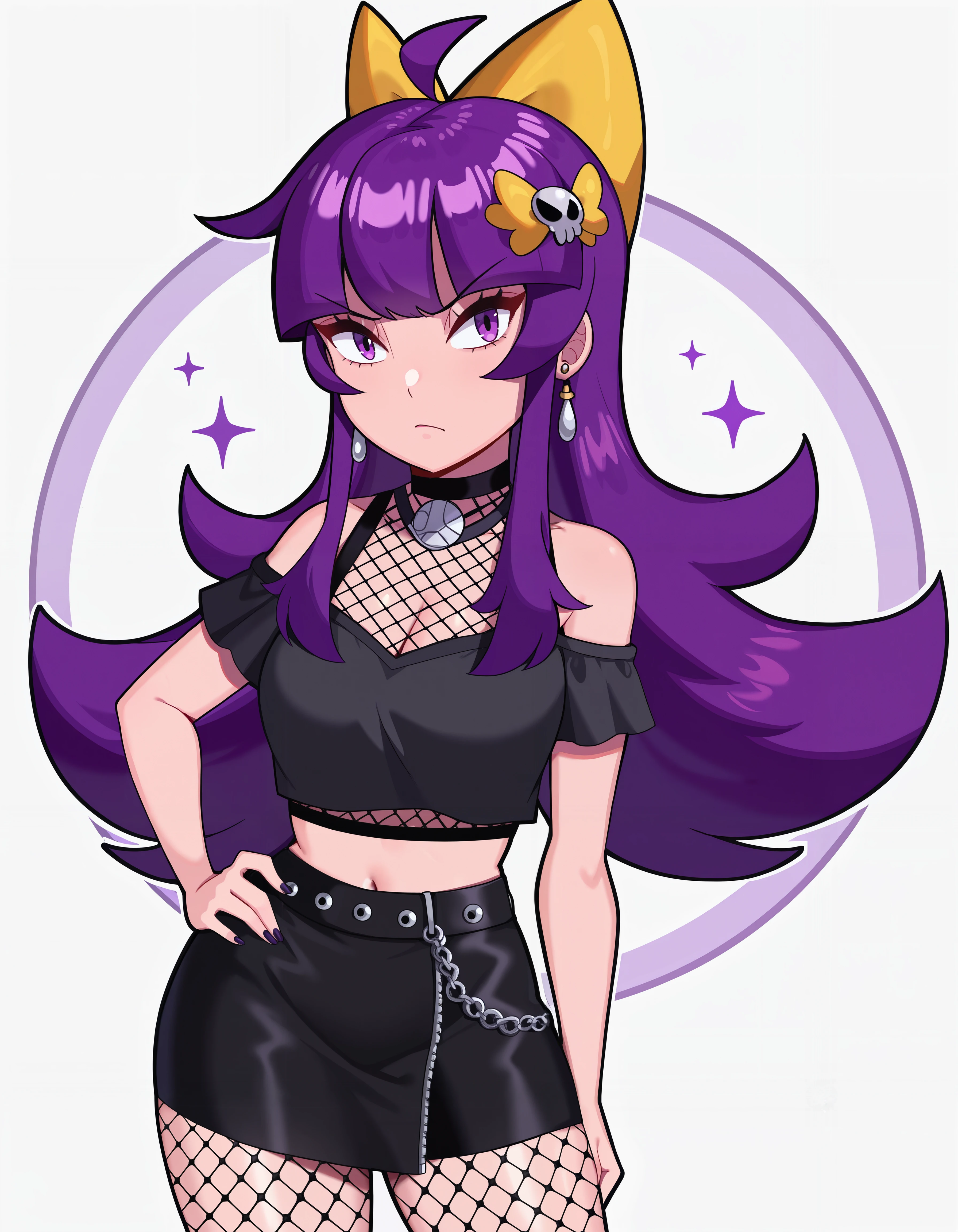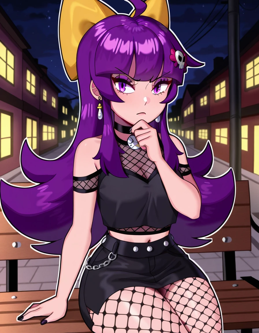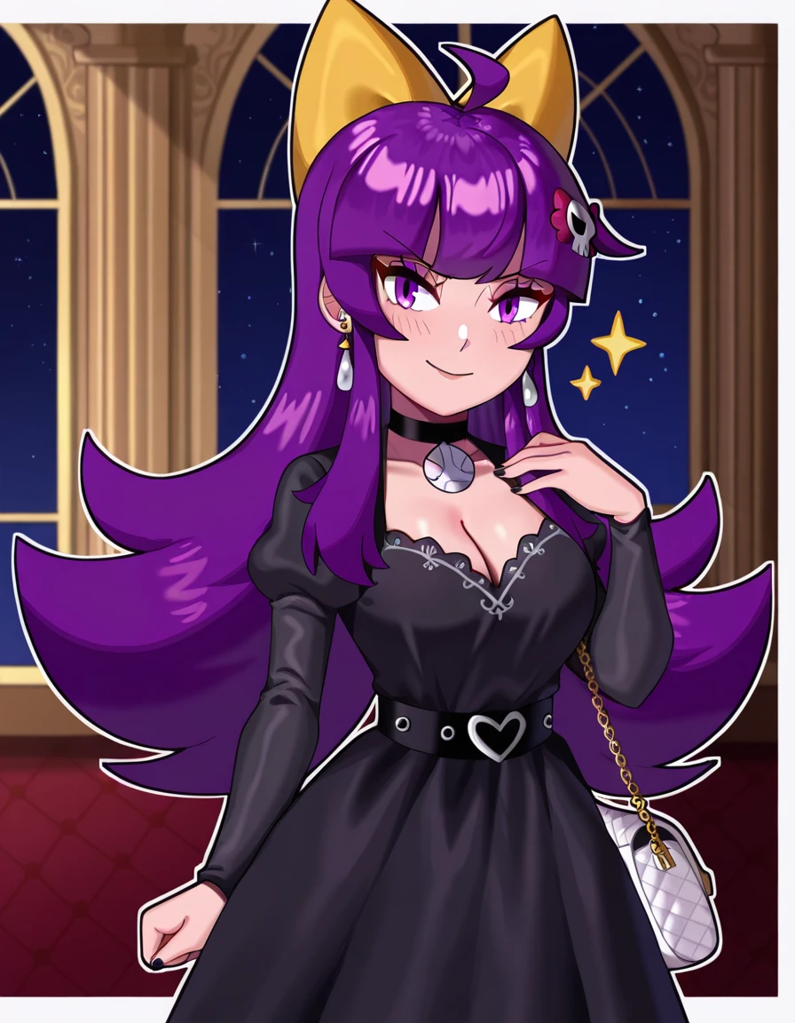 violentine (sarukaiwolf), sarukaiwolf, medium breasts, purple hair, purple eyes, long hair, goth, yellow bow, hair bow, hair ornament, black choker, necklace, circle necklace, earrings