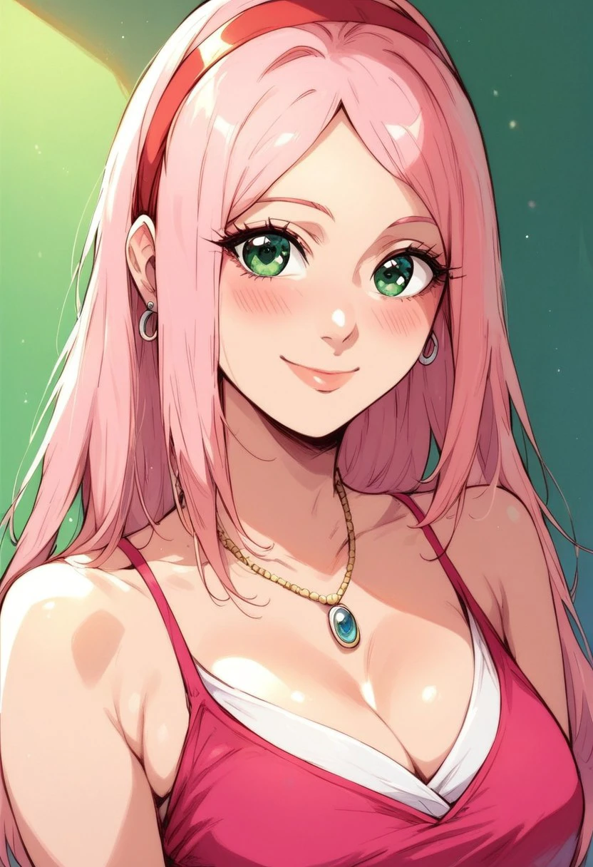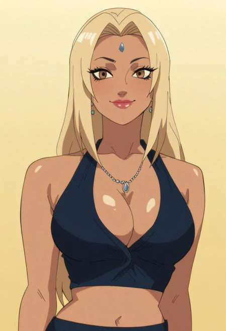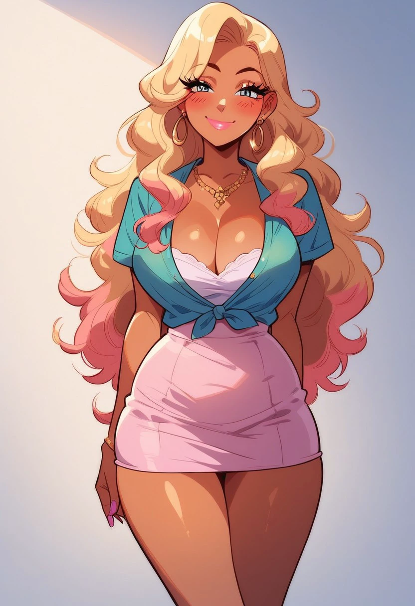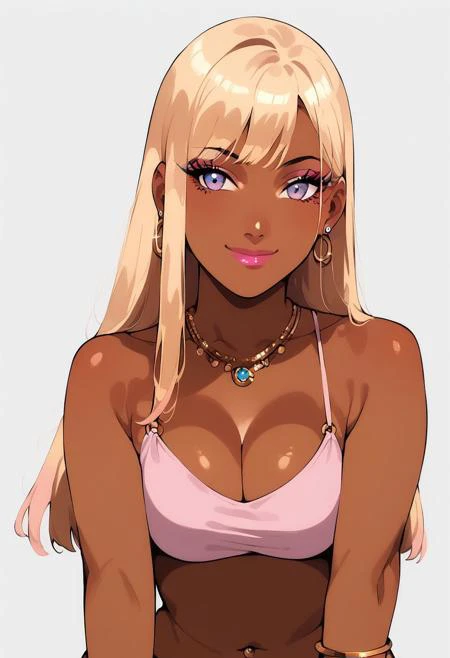 gyarufication, breasts, 1girl, jewelry, cleavage, smile, gyaru, bangs, earrings, dark skin, nail polish,bracelet