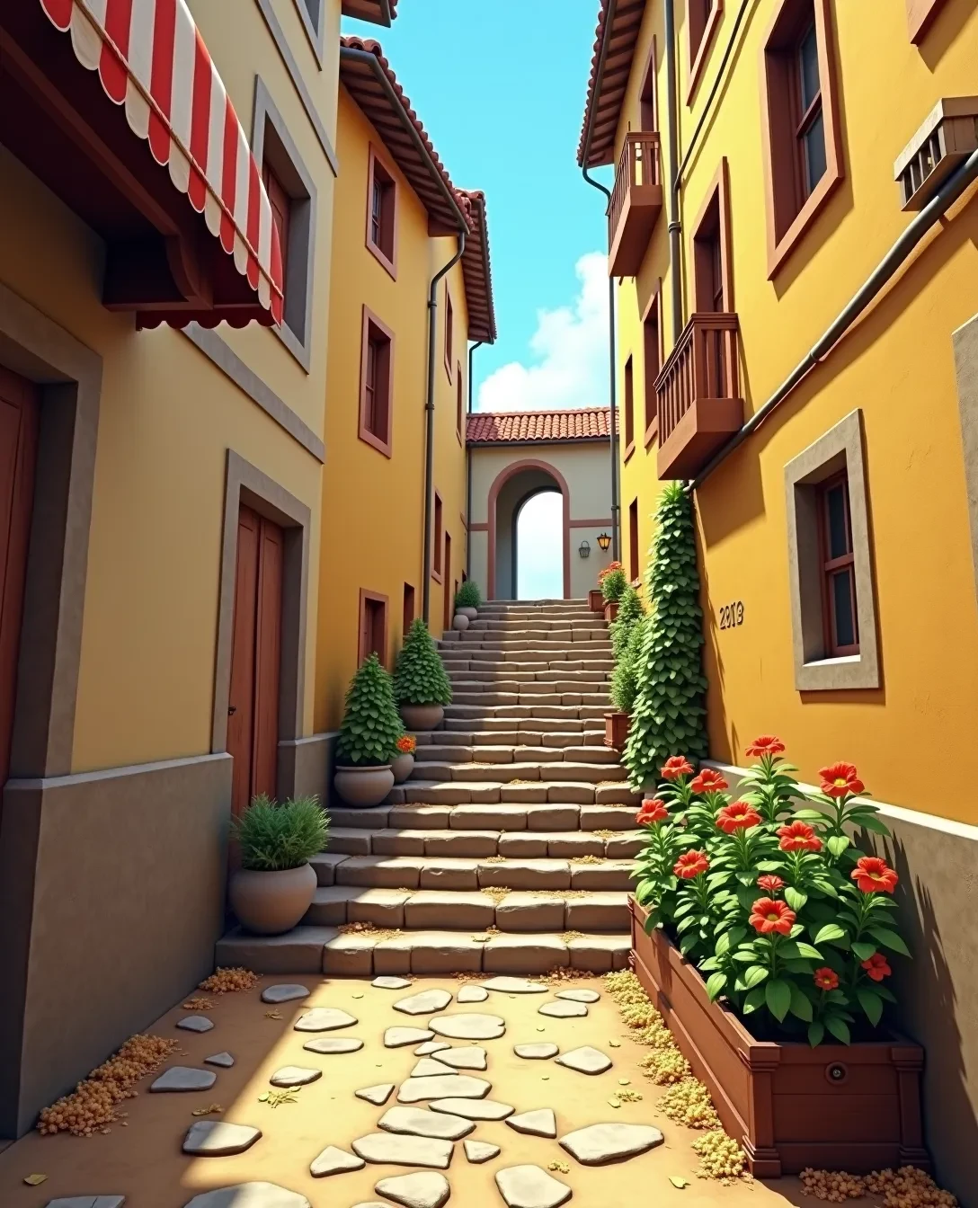 Steps rise through a worn-out neighborhood. Sunlight warms faded walls marked with graffiti. Above, the blue sky softens harsh edges. This alley could house both silence and fire.