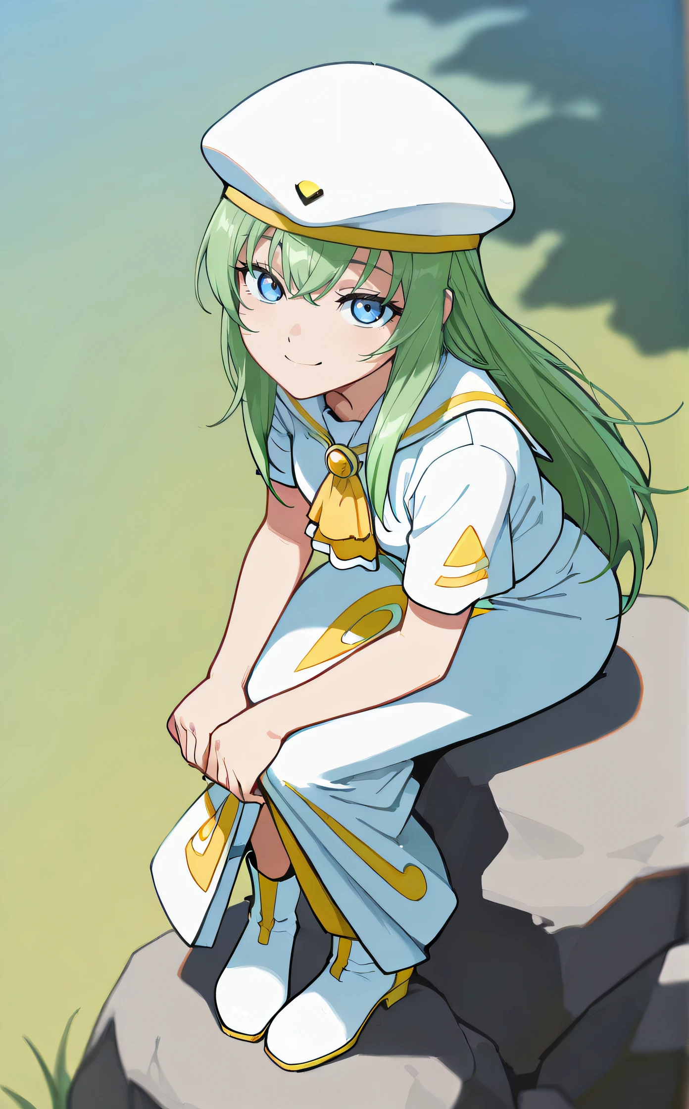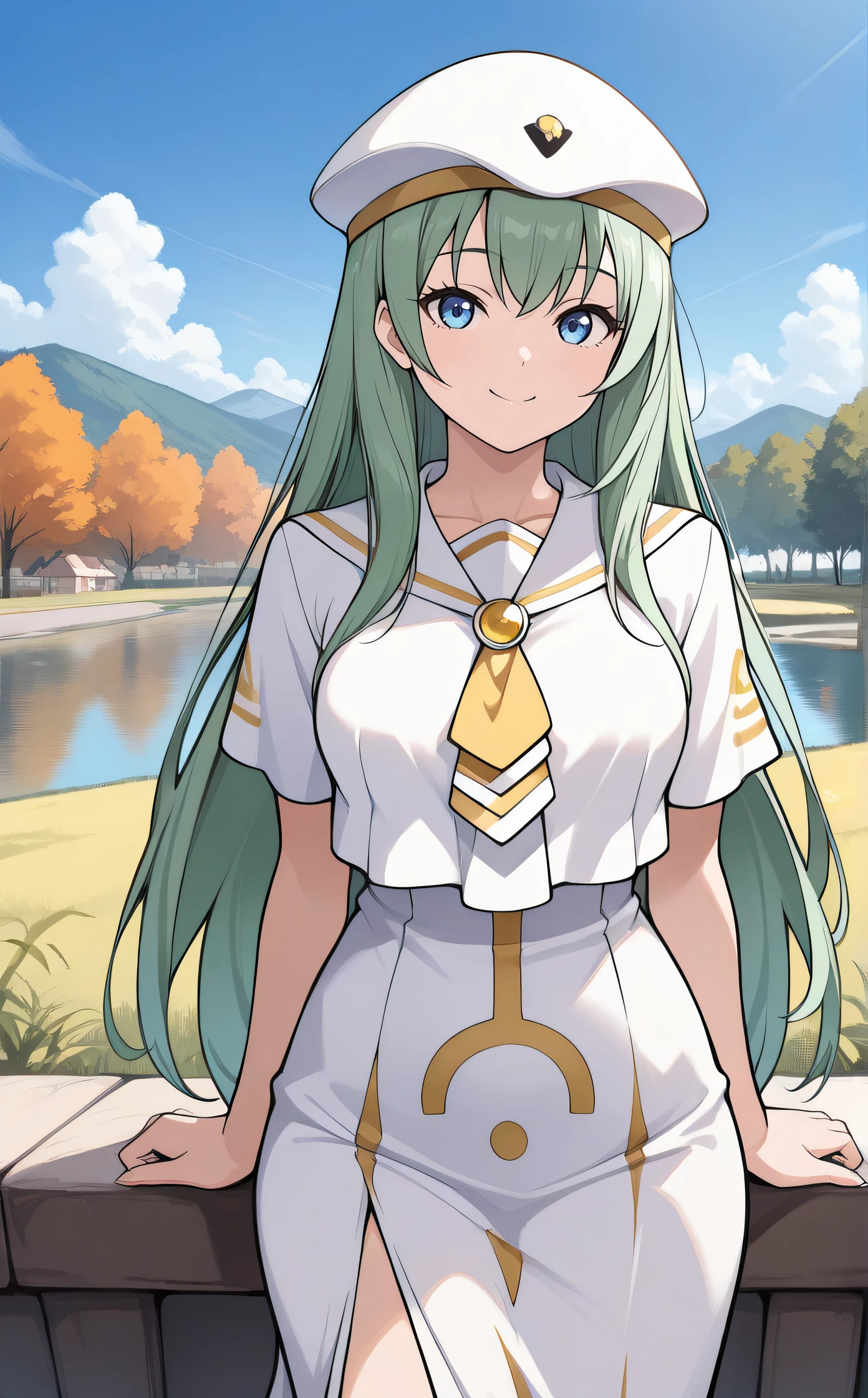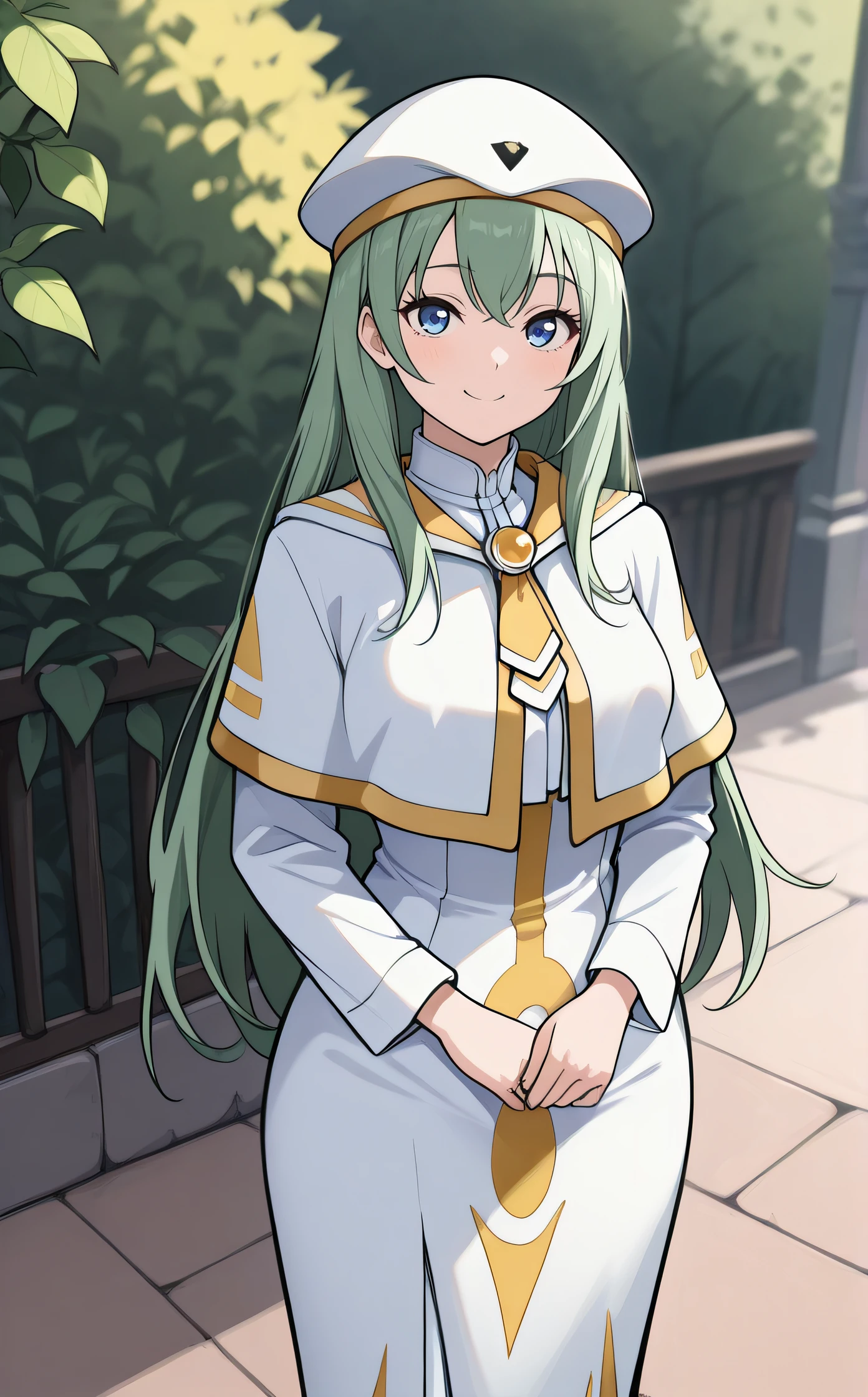carroll, white beret, yellow ascot, brooch, short sleeves, long dress, side slit
