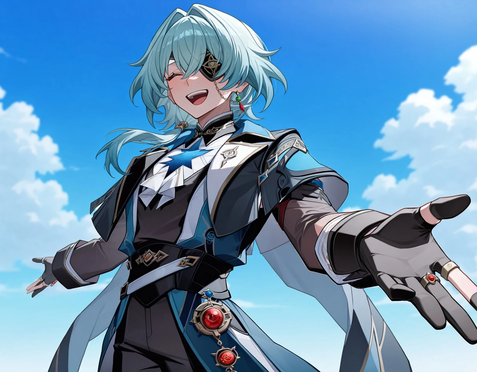 🖌 Main Prompts:“an8xa”“green hair”“long hair”“bangs”“jewelry”“eyepatch”“hair between eyes”“earrings”“one eye covered”“ring”“glove”“low ponytail”“long sleeves”