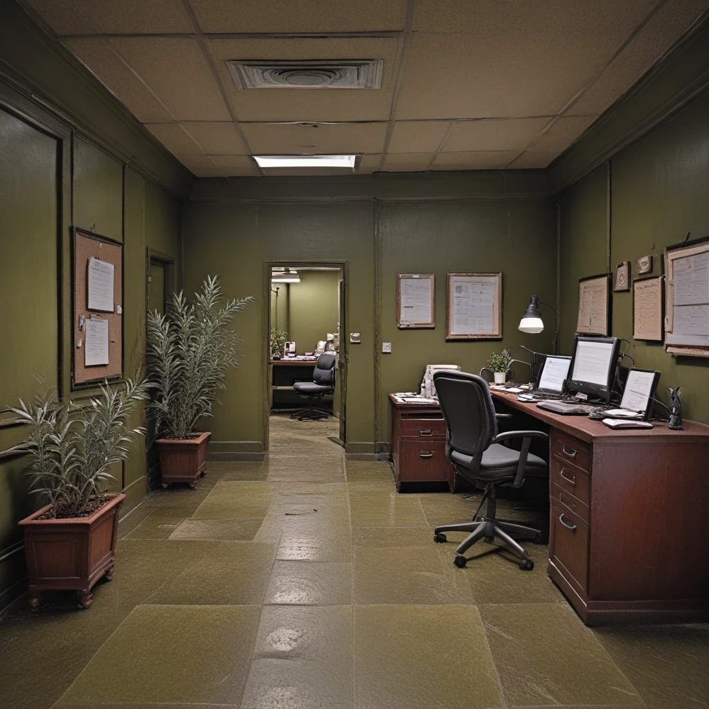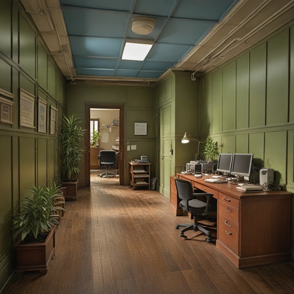 This is an Anime LoRA of an abandoned creepy wasted olive green office building. It can be used for images about liminal spaces and creepy scenes.