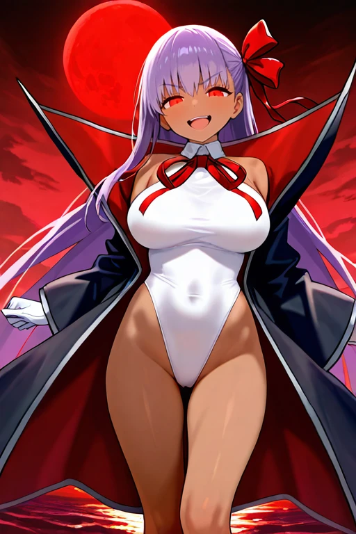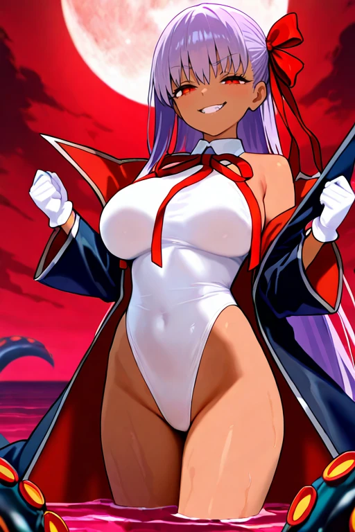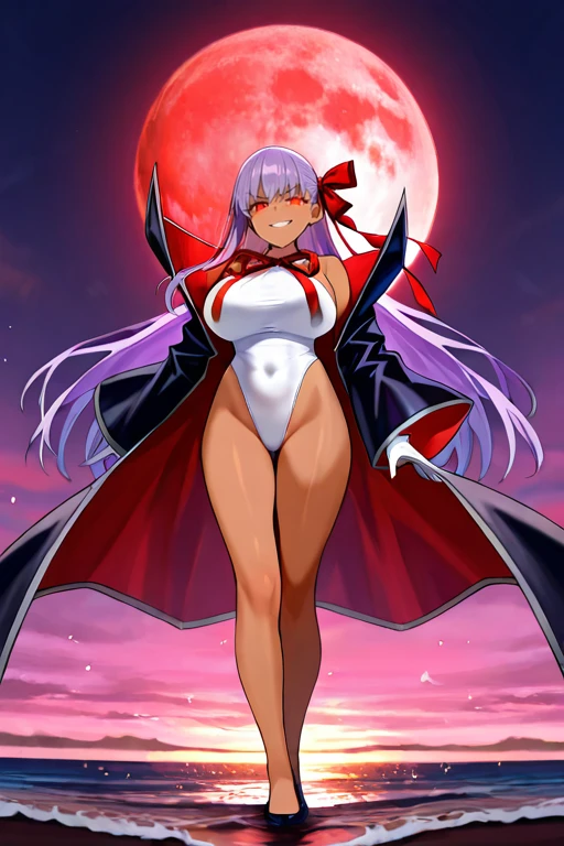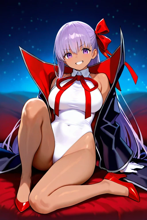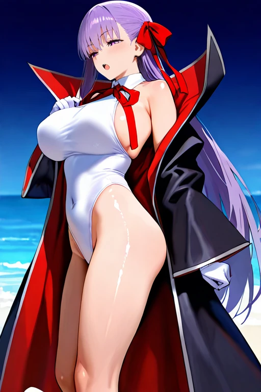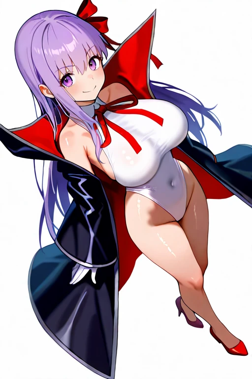 large breasts, bbbbdef, bare shoulders, leotard, white one-piece swimsuit, highleg, neck ribbon, bare legs, white gloves, popped collar, black coat, high heels, red footwear,