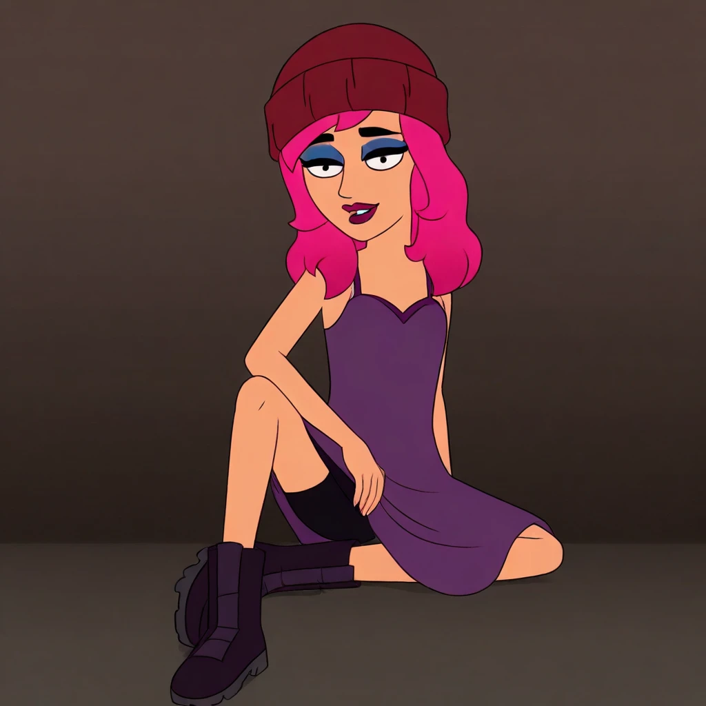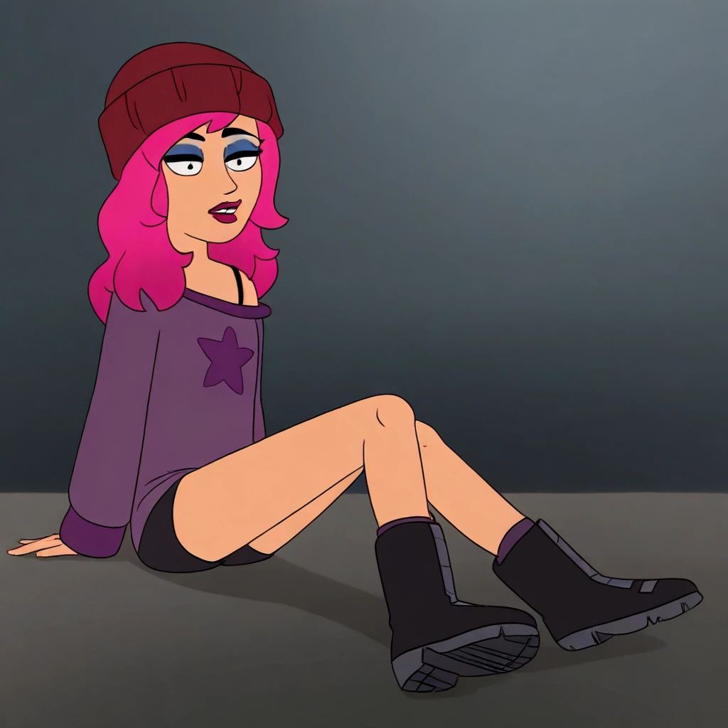 1girl, solo, Khaleesi, dark pink beanie, pink hair, eyeshadow, black eyes, black eyebrows, dark pink lipstick, off the shoulder purple top,long sleeves, black mini shorts, black boots,