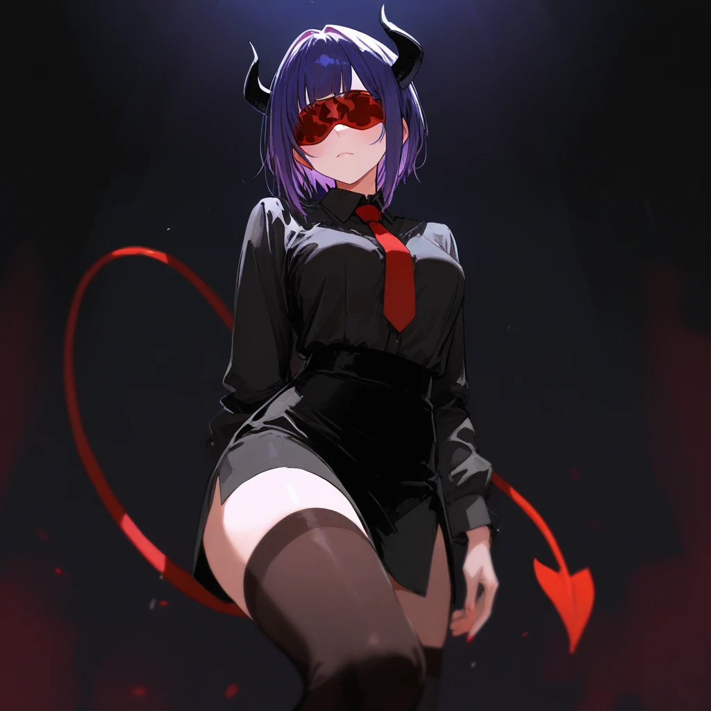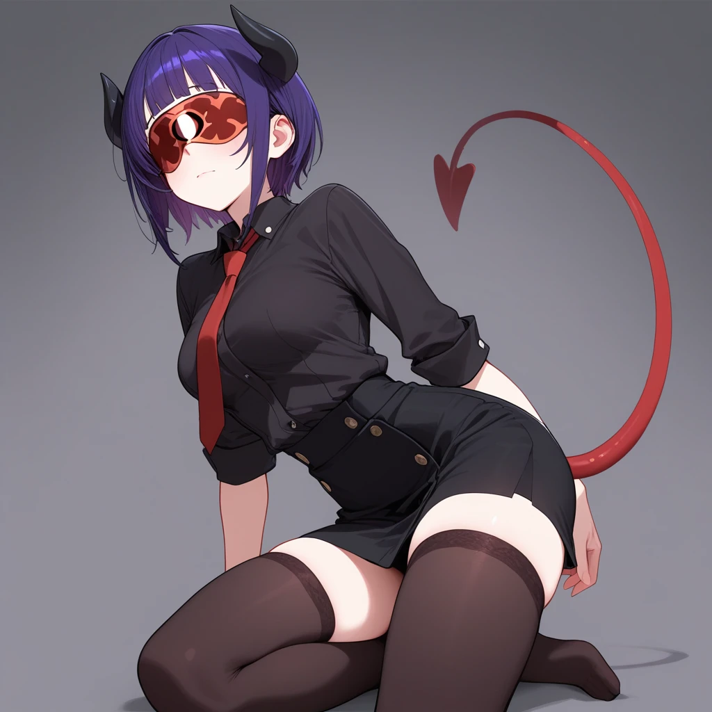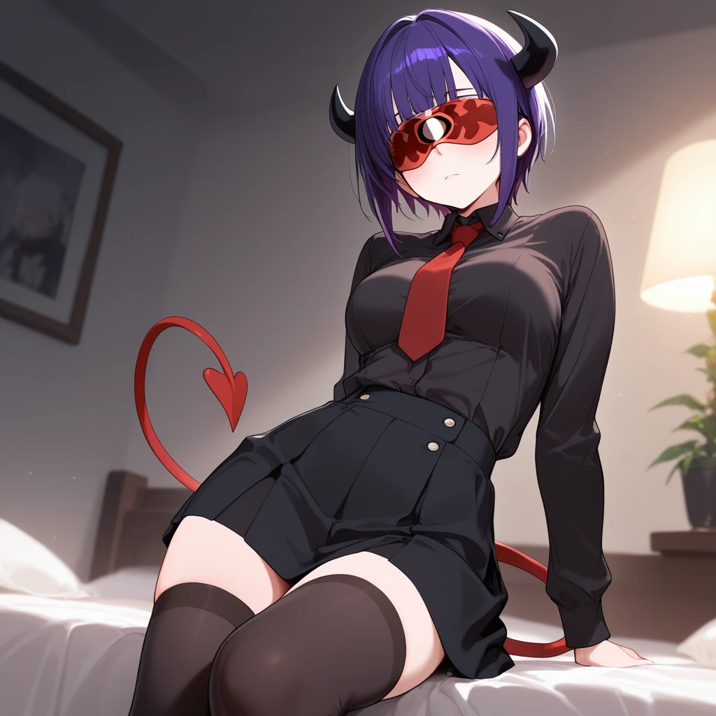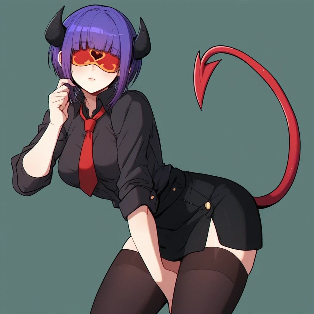 1girl, demon girl, demon horns, demon tail, short hair, purple hair, medium breasts, blindfold,
