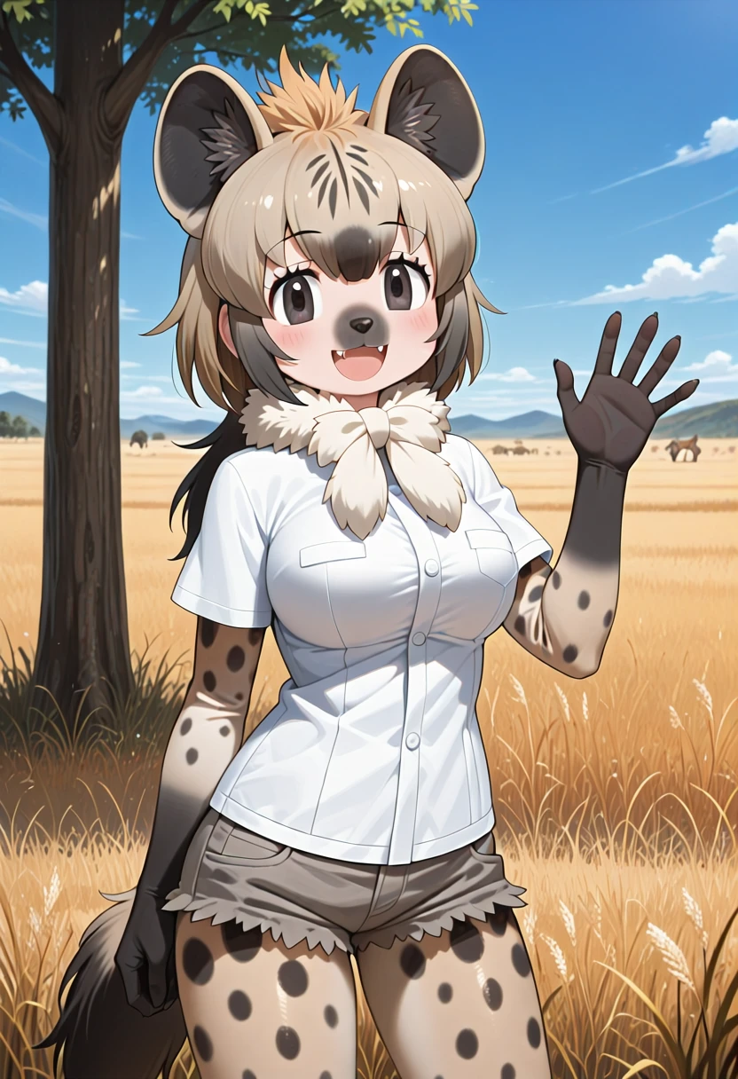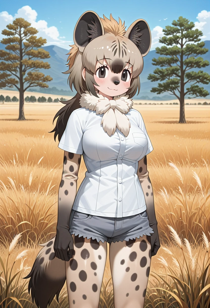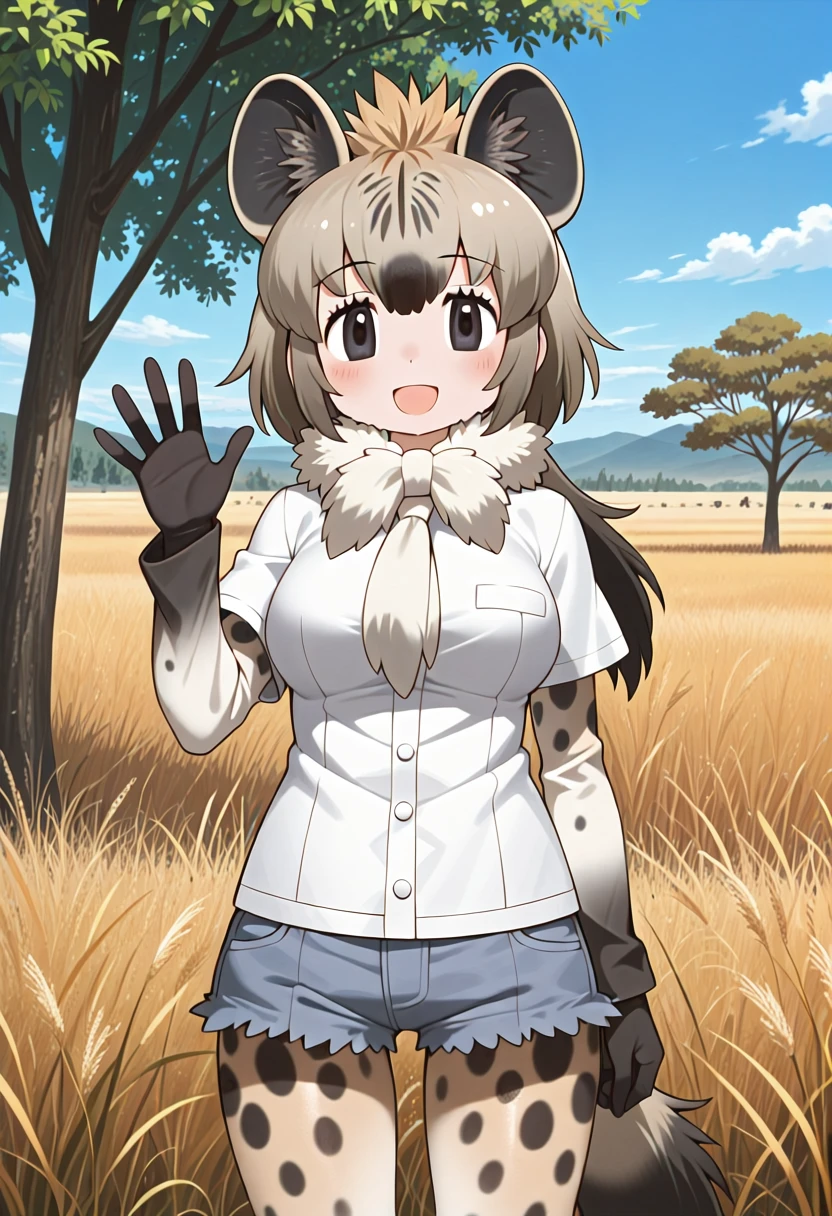 prompts: 1girl, spotted hyena \(kemono friends\), long hair, grey hair, black hair, brown hair, multicolored hair, black eyes, animal ears, animal print, tail, hyena ears, hyena girl, hyena tail, spotted tail, white shirt, t-shirt, buttons, pocket, fur scarf, fur collar, short sleeves, long sleeves, short over long sleeves, layered sleeves, black gloves, denim shorts, short shorts, grey shorts, cutoffs, pantyhose, pantyhose under shorts, print pantyhose, shoes