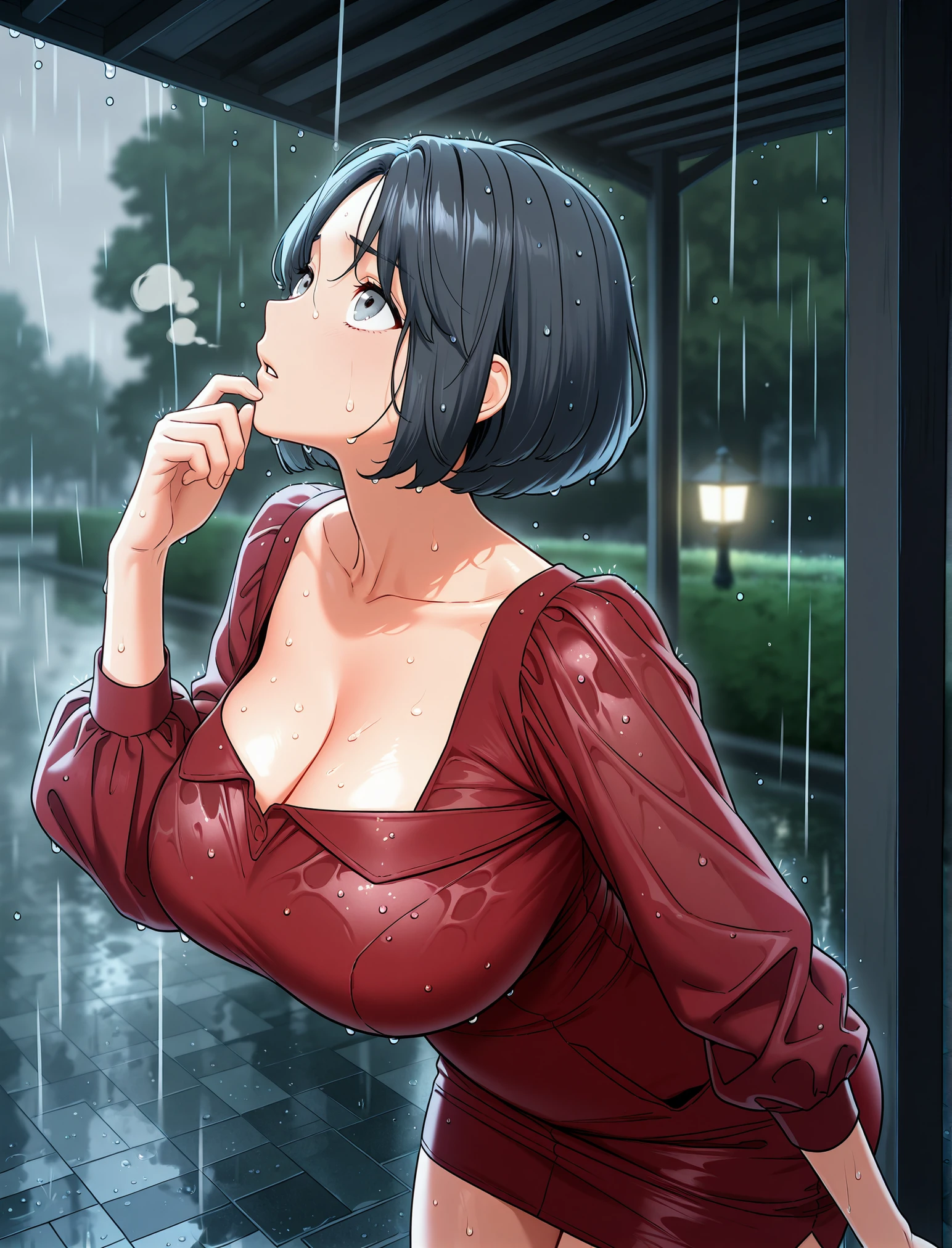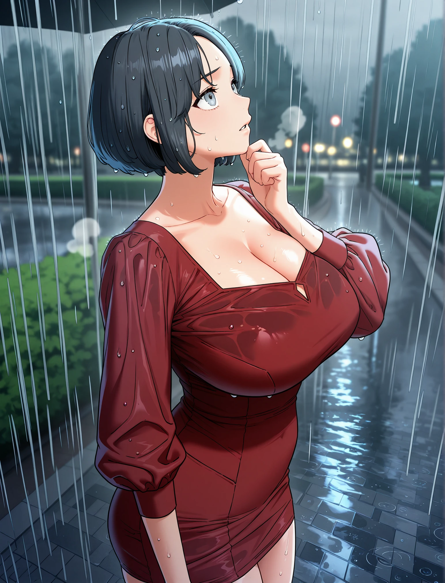 red dress, collarbone, cleavage, puffy long sleeves, short dress