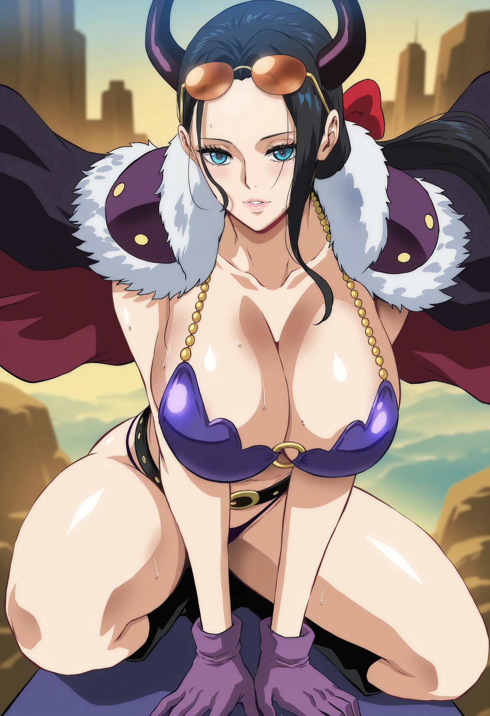 beastpiratedisguise, blue eyes, black hair, long hair, low ponytail, horns, purple gloves, black cape, fur trim, bikini armor, purple bikini, o-ring top, sunglasses, eyewear on head, tinted eyewear, hair bow, red bow, thong, belt,
