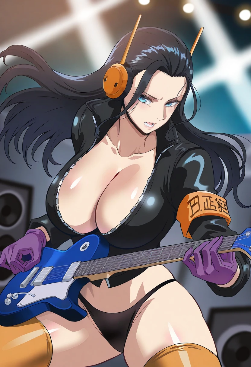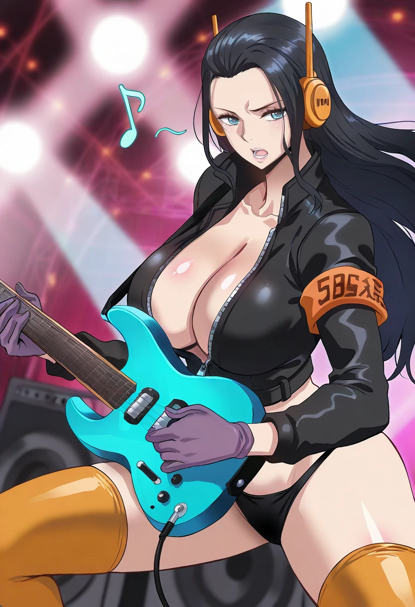 eggheadnr, blue eyes, black hair, long hair, hair slicked back, straight hair, black jacket, orange thighhighs, long sleeves, purple gloves, high collar, no bra, zipper, cropped jacket, black panties, armband, headphones,
