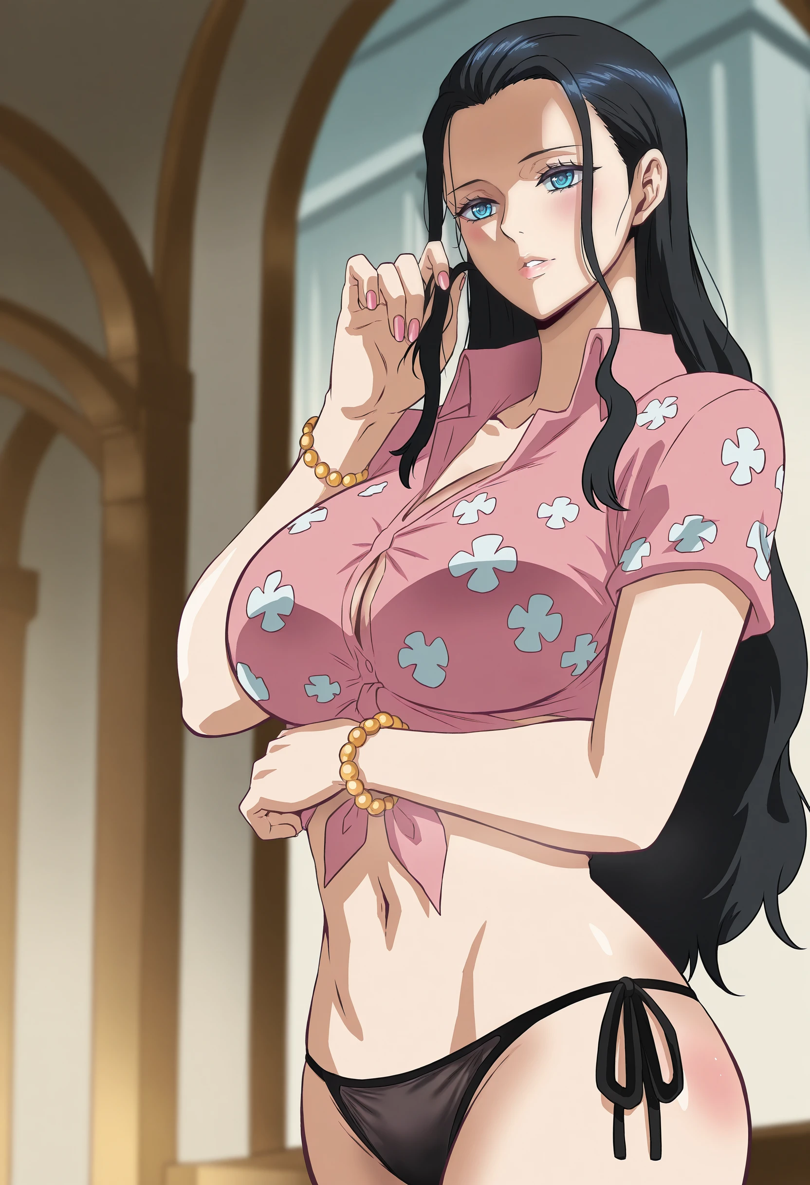goldnr, blue eyes, black hair, long hair, hair slicked back, straight hair, pink shirt, tied shirt, front-tie top, collared shirt, short sleeves, side-tie bikini bottom, black panties, swimsuit, bracelet,
