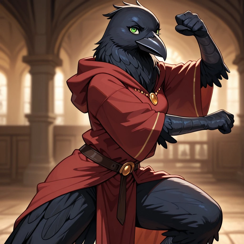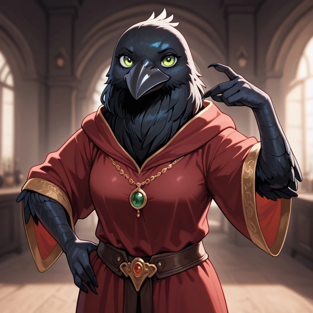 Example prompt: kenku, anthro bird, anthro crow, plumage, tail, talons, 1boy, male focus, grey skin, red sclera
