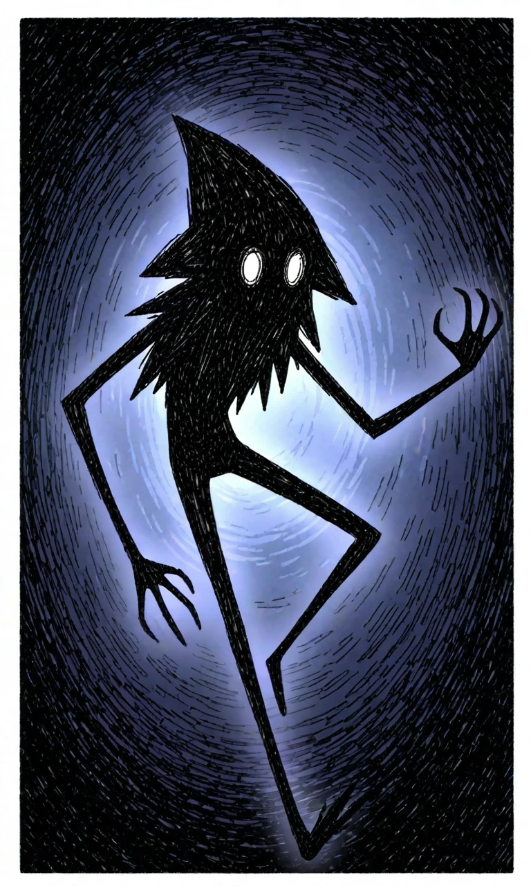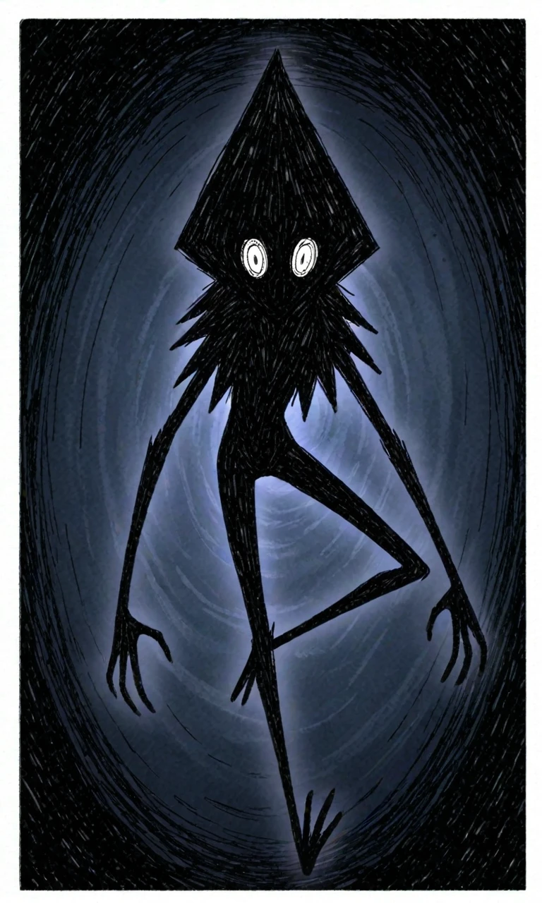 H3r, 1girl, black skin, very tall, slender, lanky build, lanky arms, lanky legs, white oval eyes, mouthless, eerie, horror
