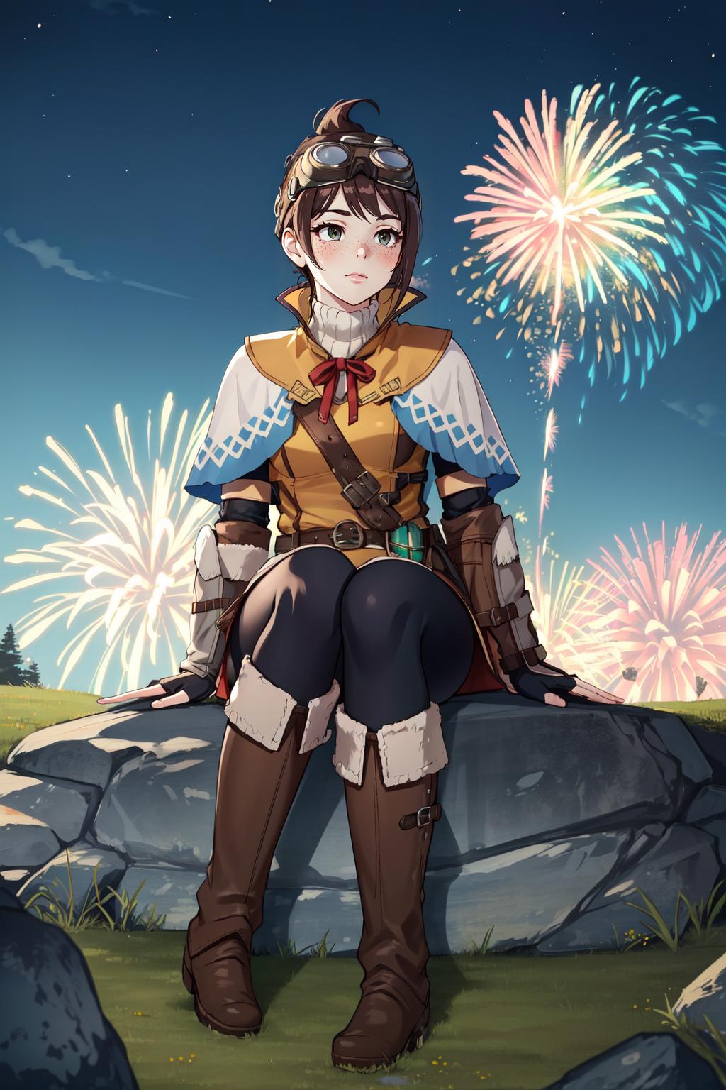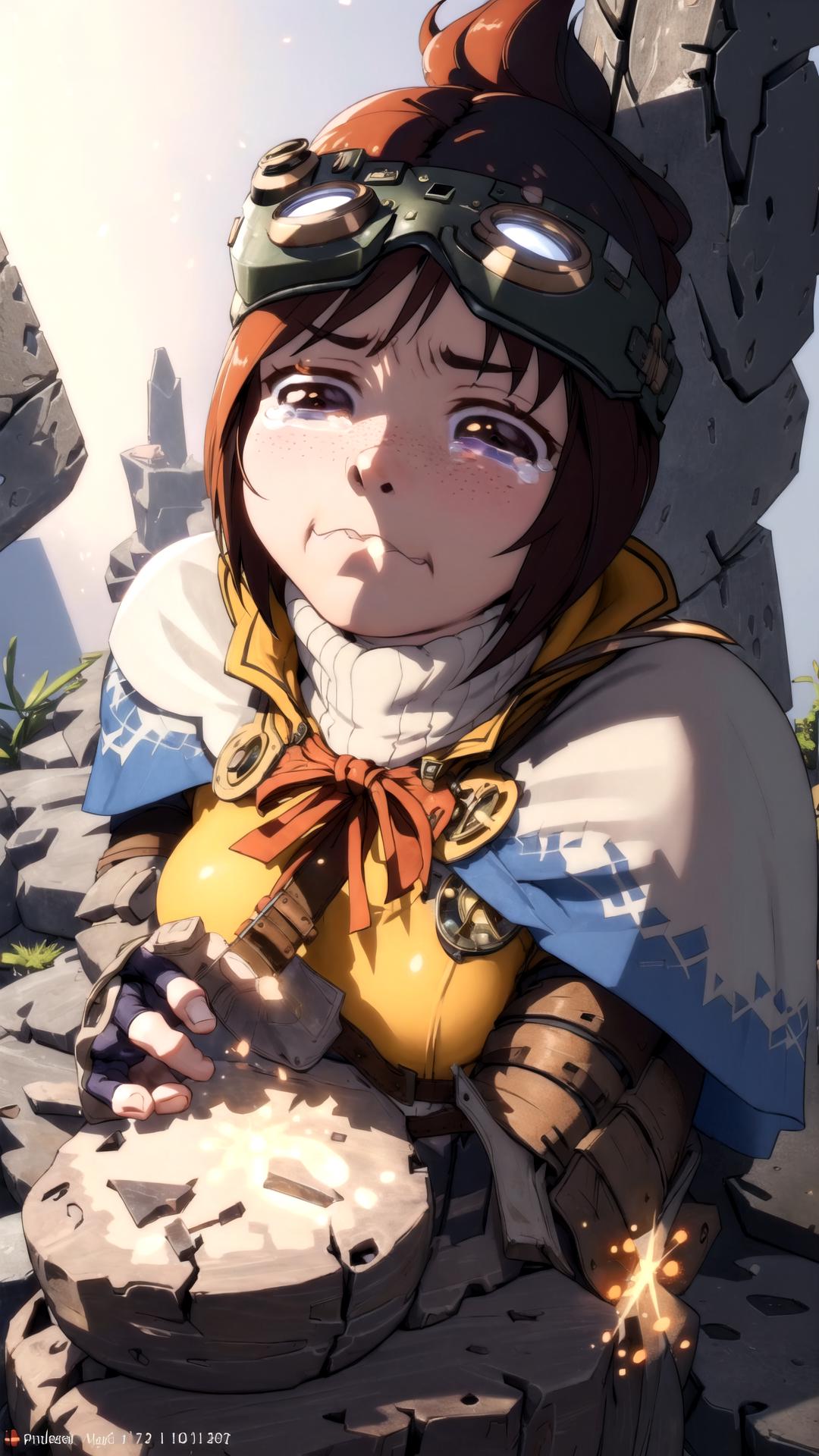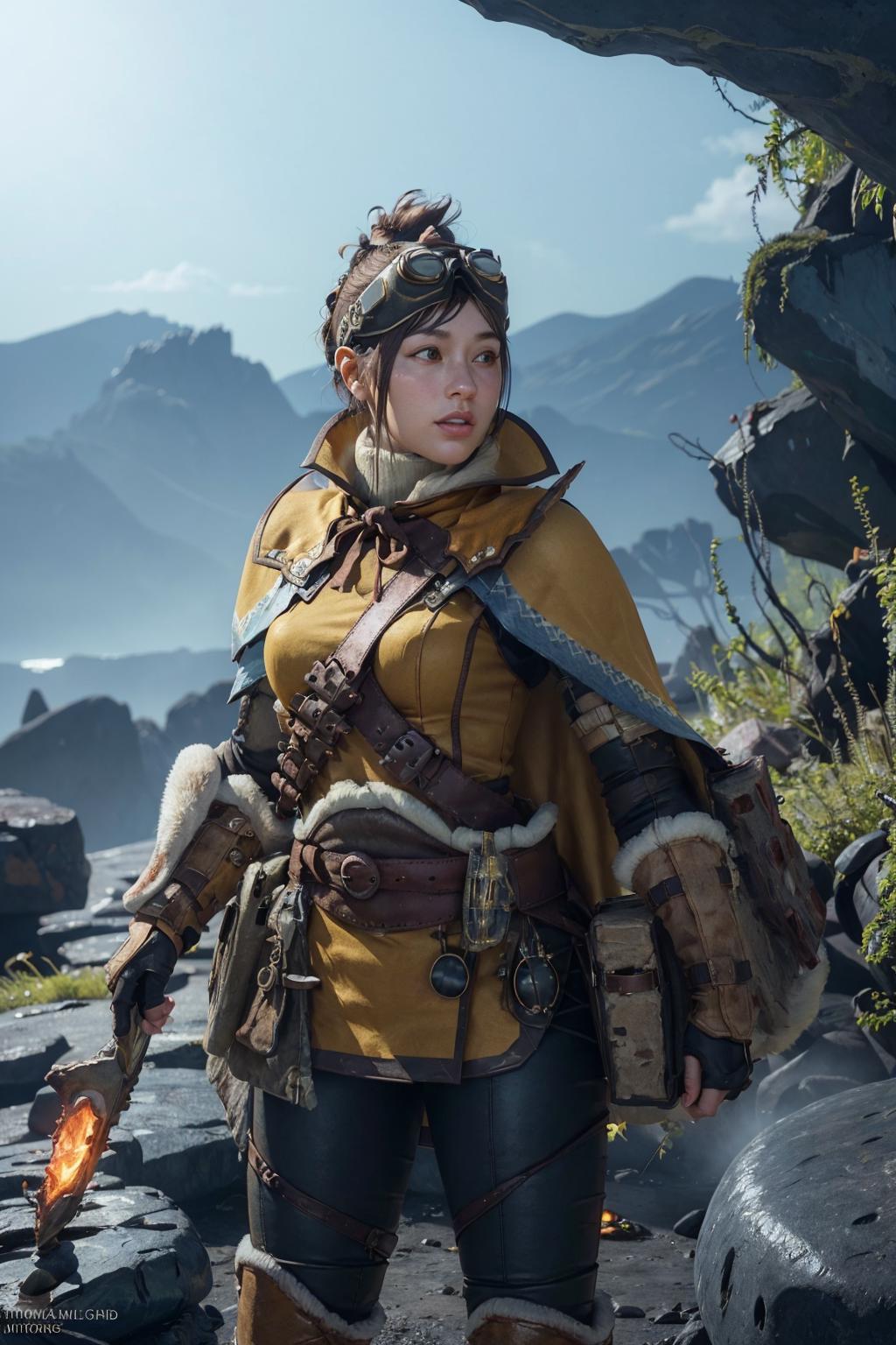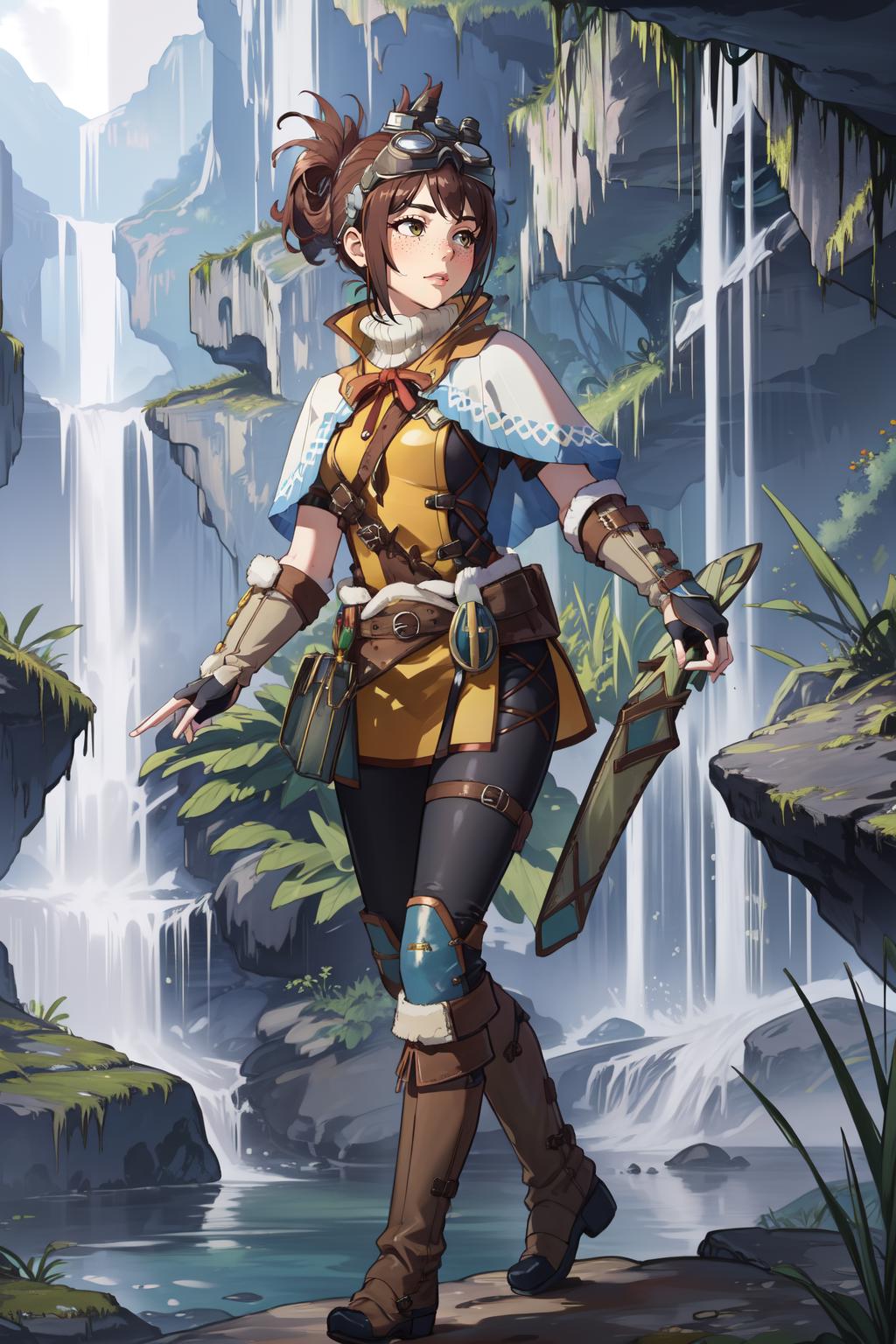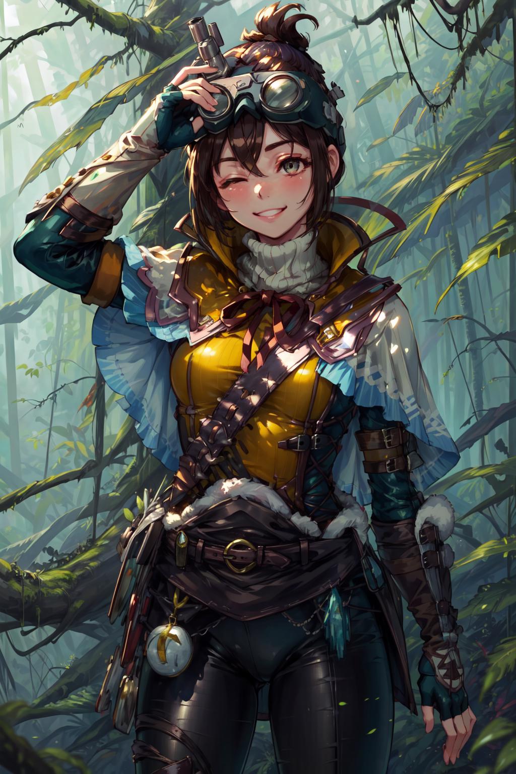 Default Outfit: goggles on head, capelet, boots, fingerless gloves