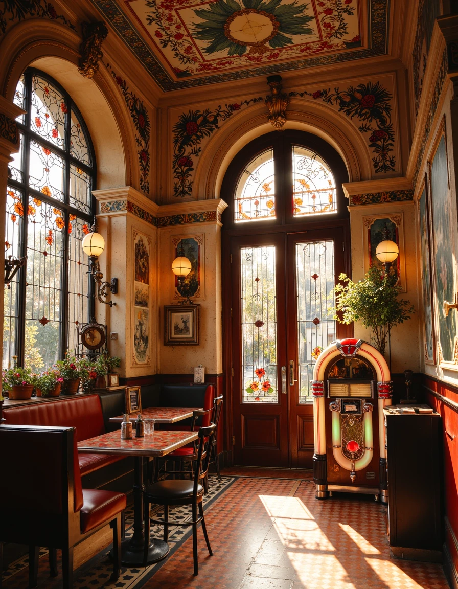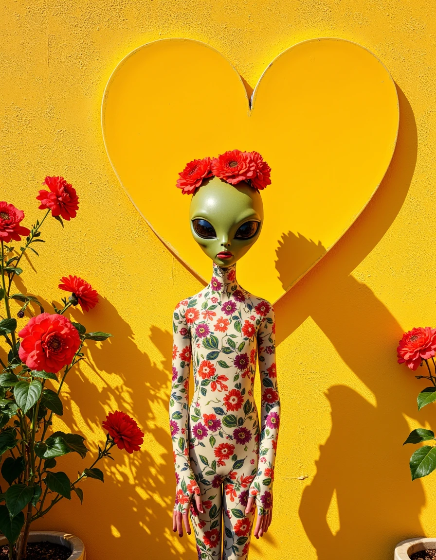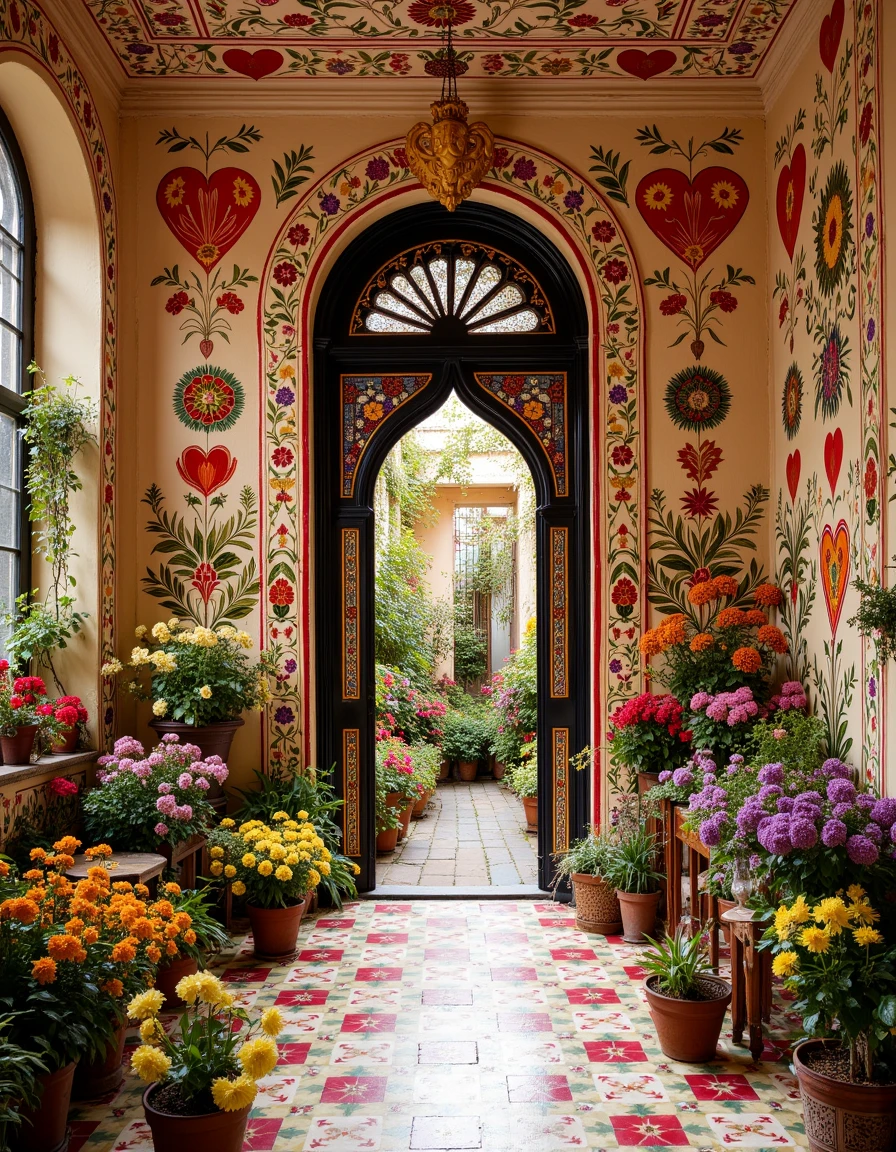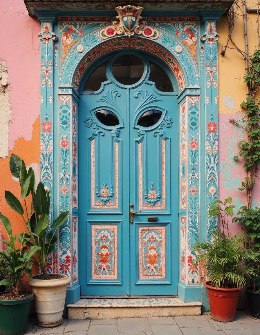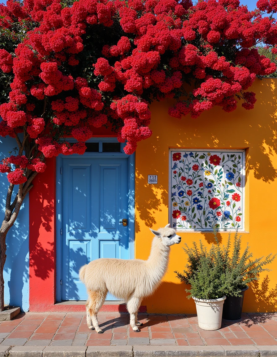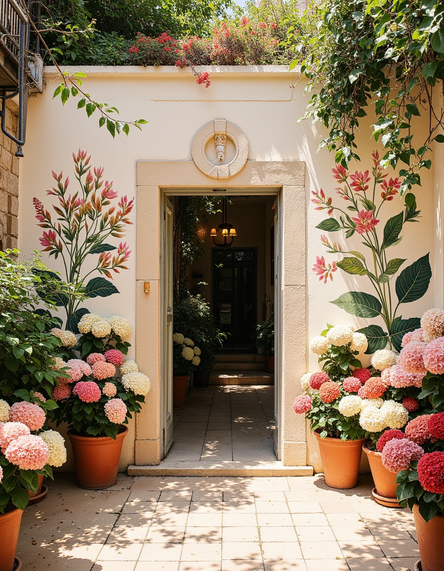 a photo of a quaint house adorned with vibrant murals of large flowers in shades of red, pink, blue, and yellow cascading around green windows and doors, set against a soft beige facade, surrounded by lush potted plants on a cobblestone patio under a clear blue sky in the style of thierry-lechanteur