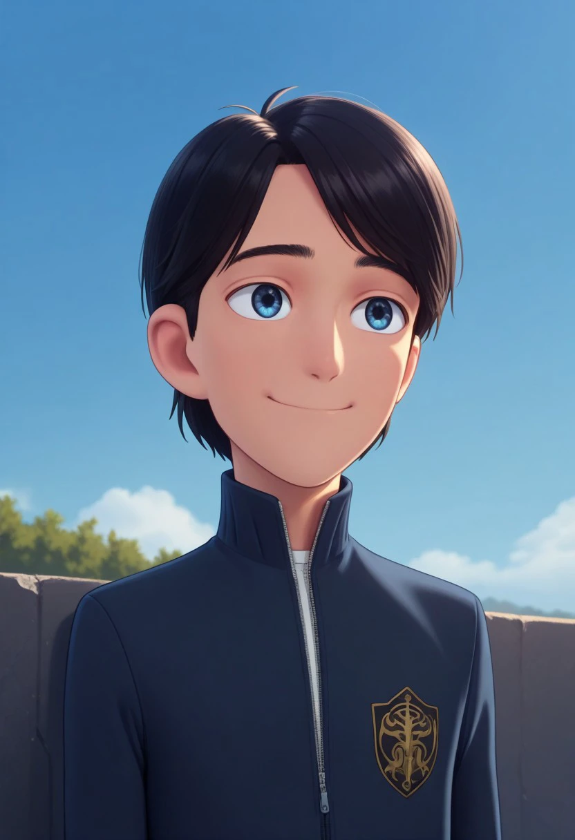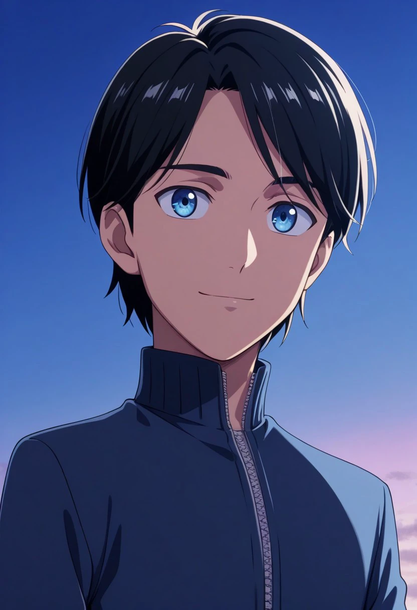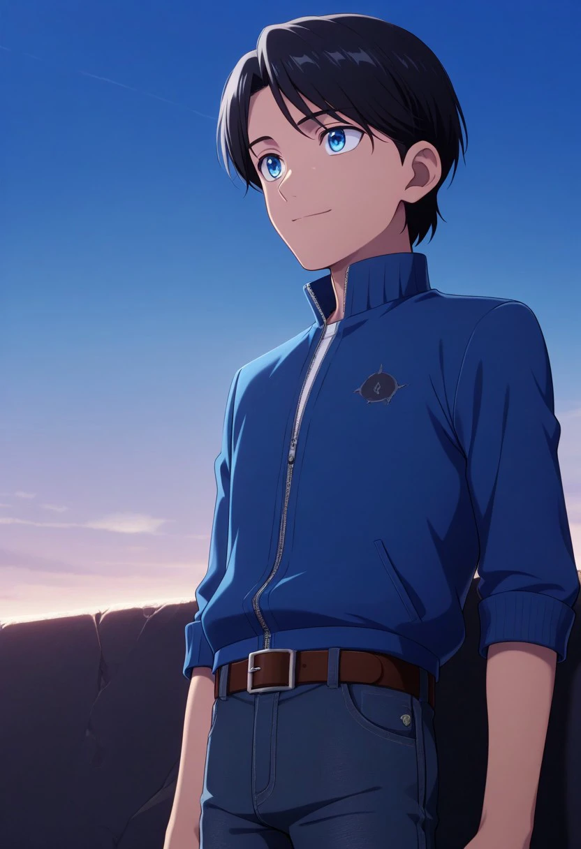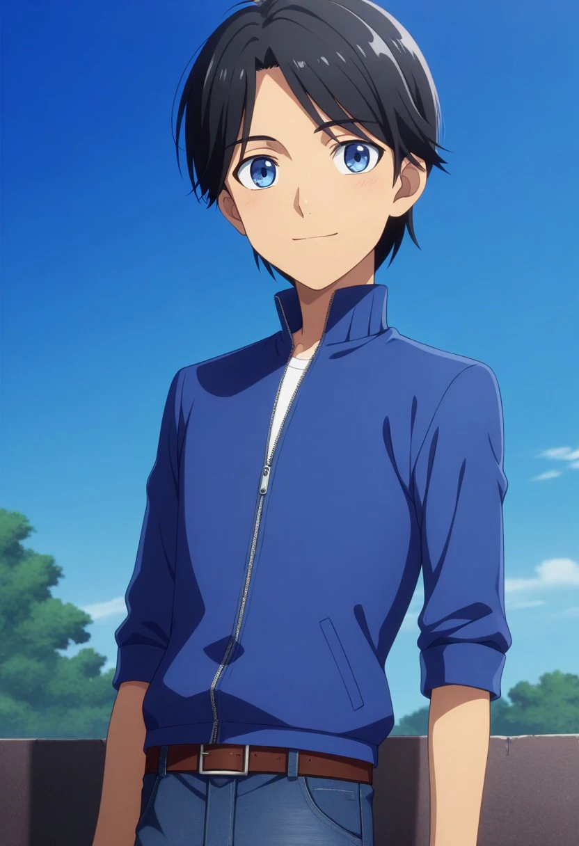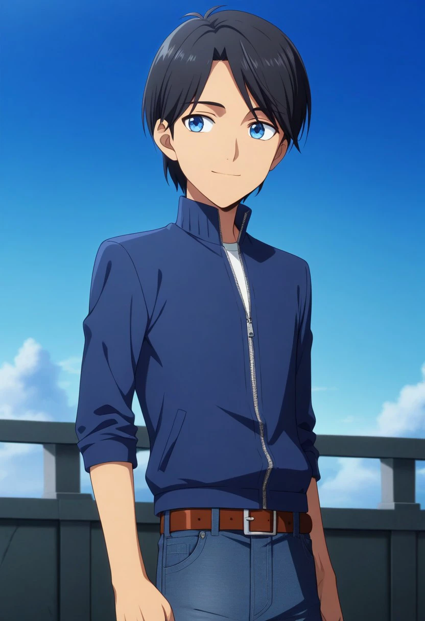 jimth, 1boy, male focus, solo, blue eyes, black hair, short hair, parted bangs, jacket, blue jacket, rolled up sleeves, zipper, belt, jeans, denim, sneakers,
