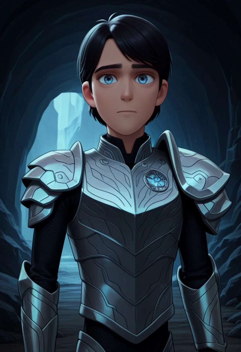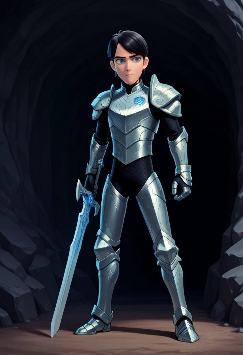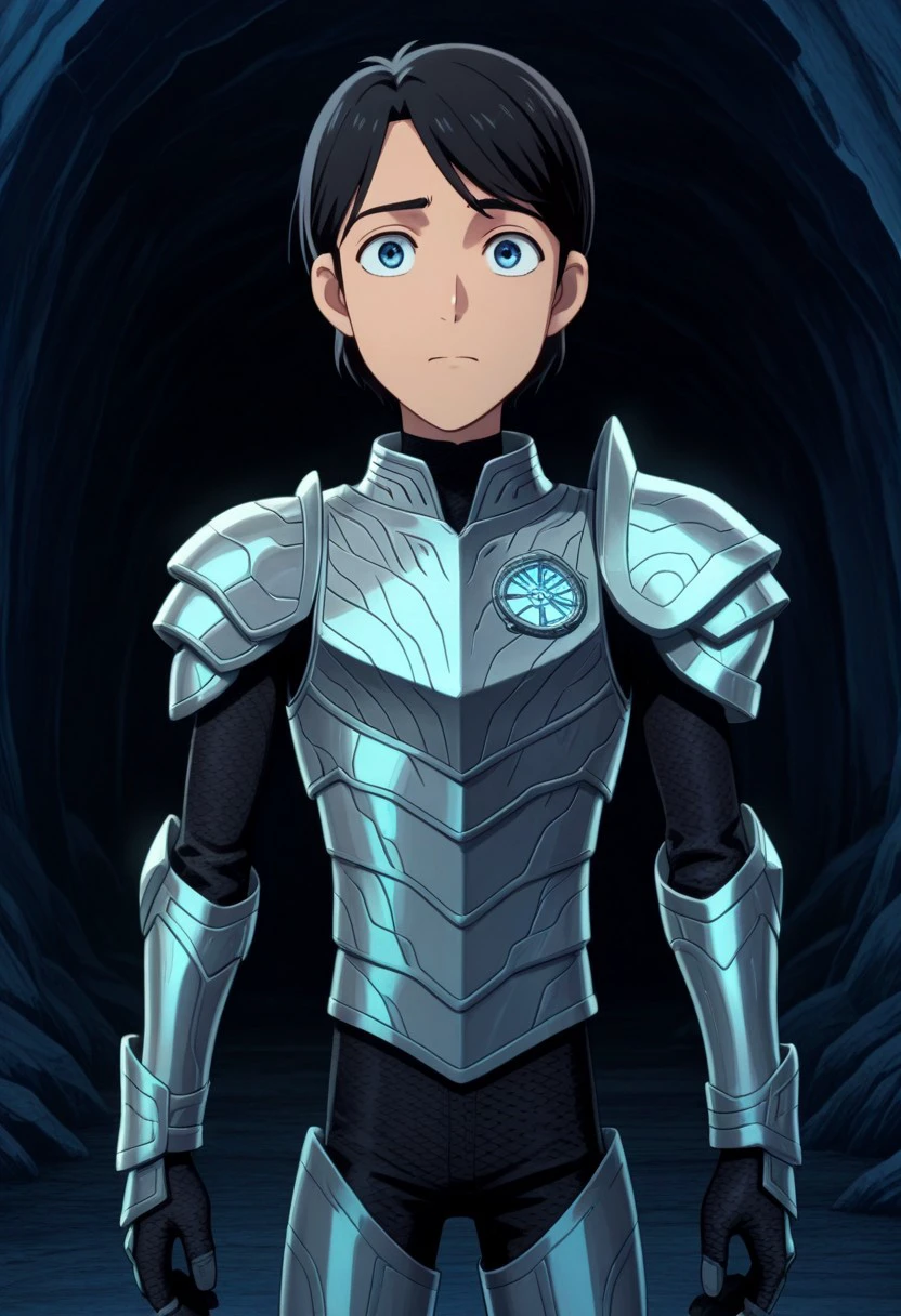 jimth, 1boy, male focus, solo, blue eyes, black hair, short hair, parted bangs, full armor, silver armor,