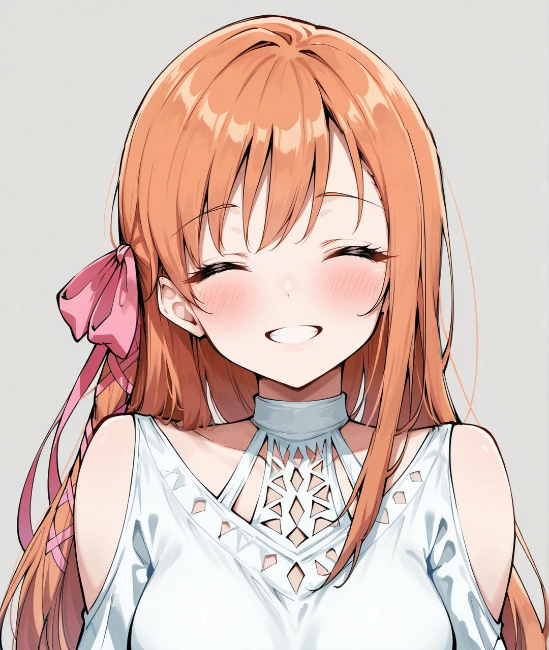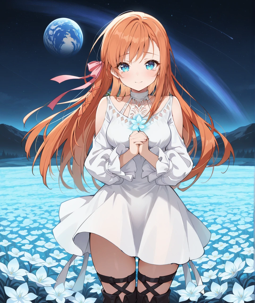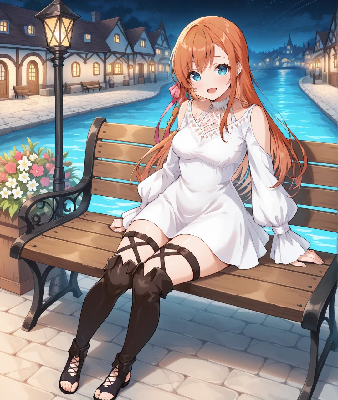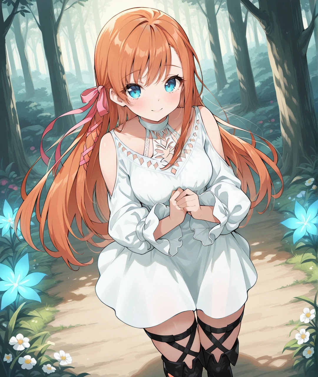 Ryne Tags: RyneBase, blue eyes, orange hair, long hair, braid, pink hair ribbon, white choker, collarbone, medium breasts, white dress, short dress, shoulder cutout, clothing cutout, puffy long sleeves, sleeves past wrists, black footwear, thigh strap, thigh boots, sandals, toeless footwear,