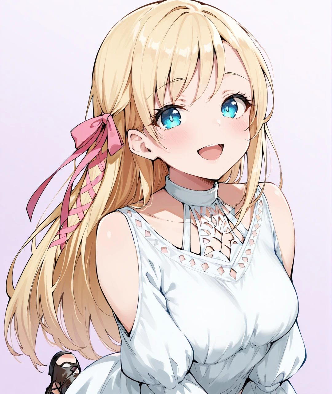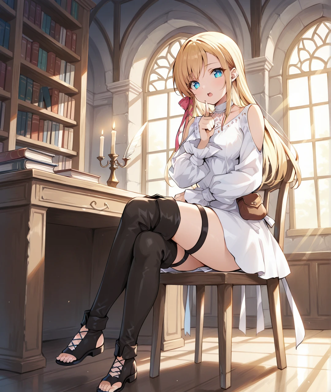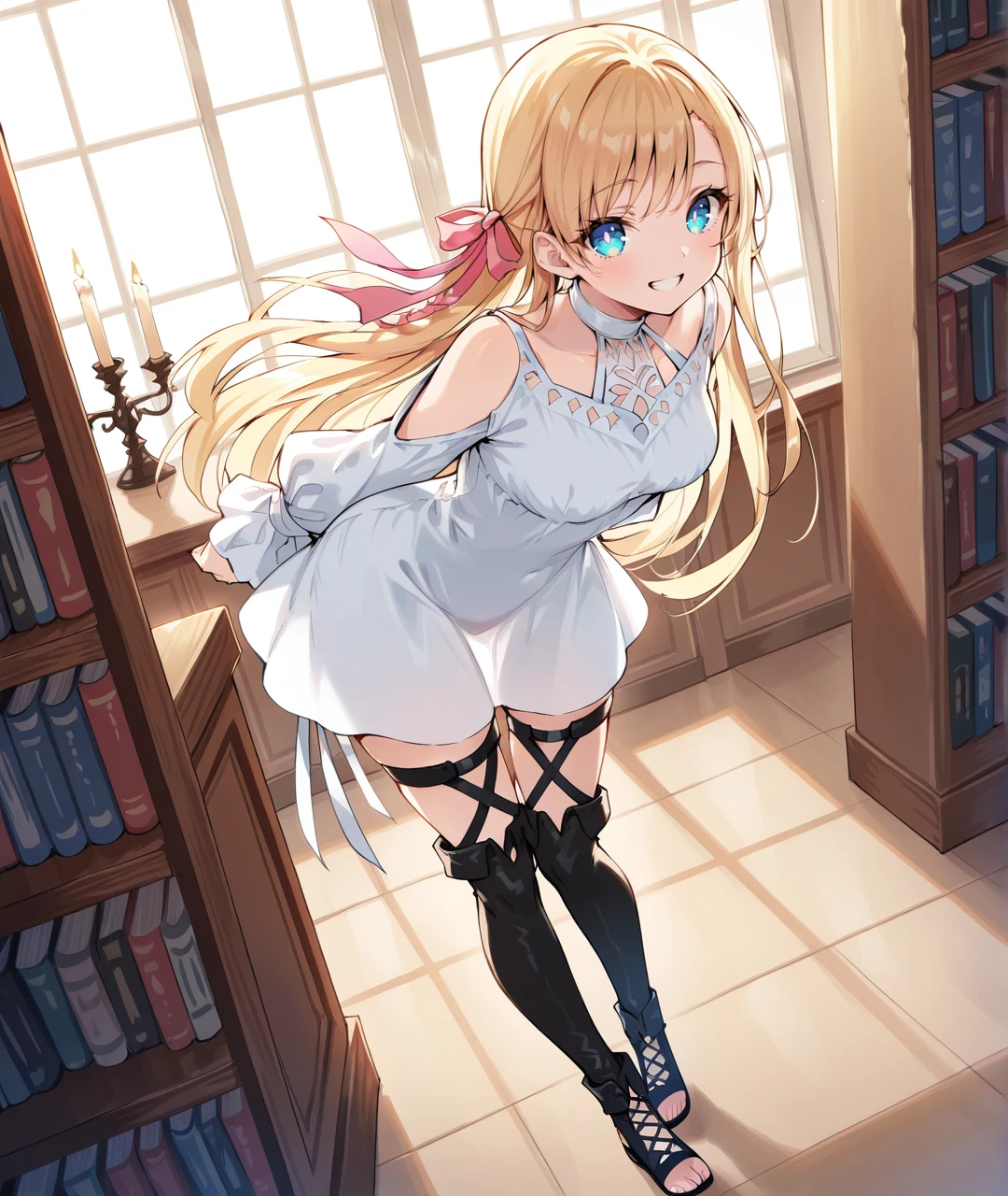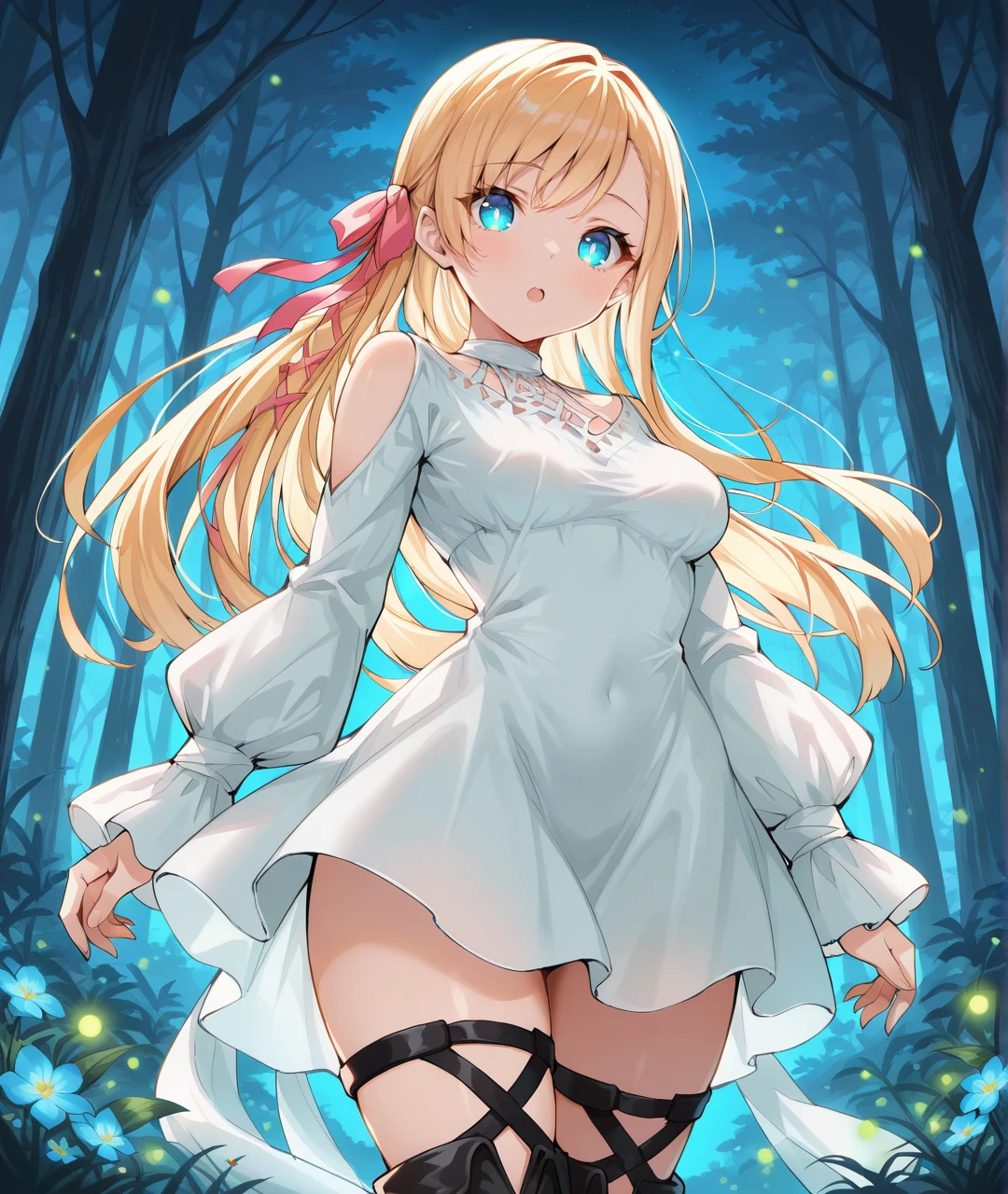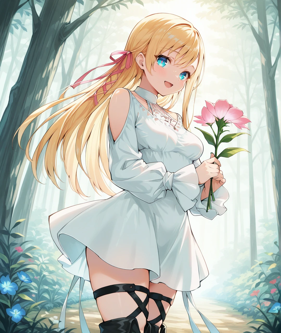 Ryne Oracle of Light Tags: RyneBase, blue eyes, glowing eyes, blonde hair, long hair, braid, pink hair ribbon, white choker, collarbone, medium breasts, white dress, short dress, shoulder cutout, clothing cutout, puffy long sleeves, sleeves past wrists, black footwear, thigh strap, thigh boots, sandals, toeless footwear,