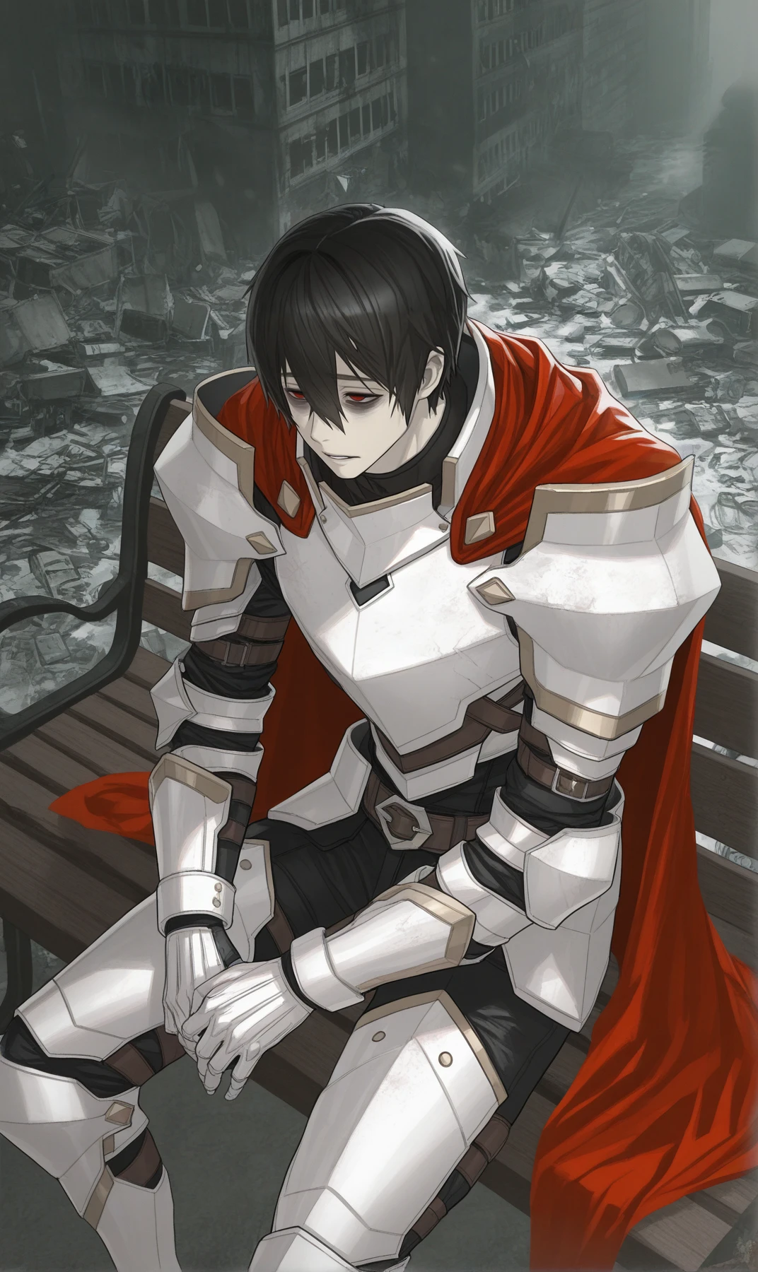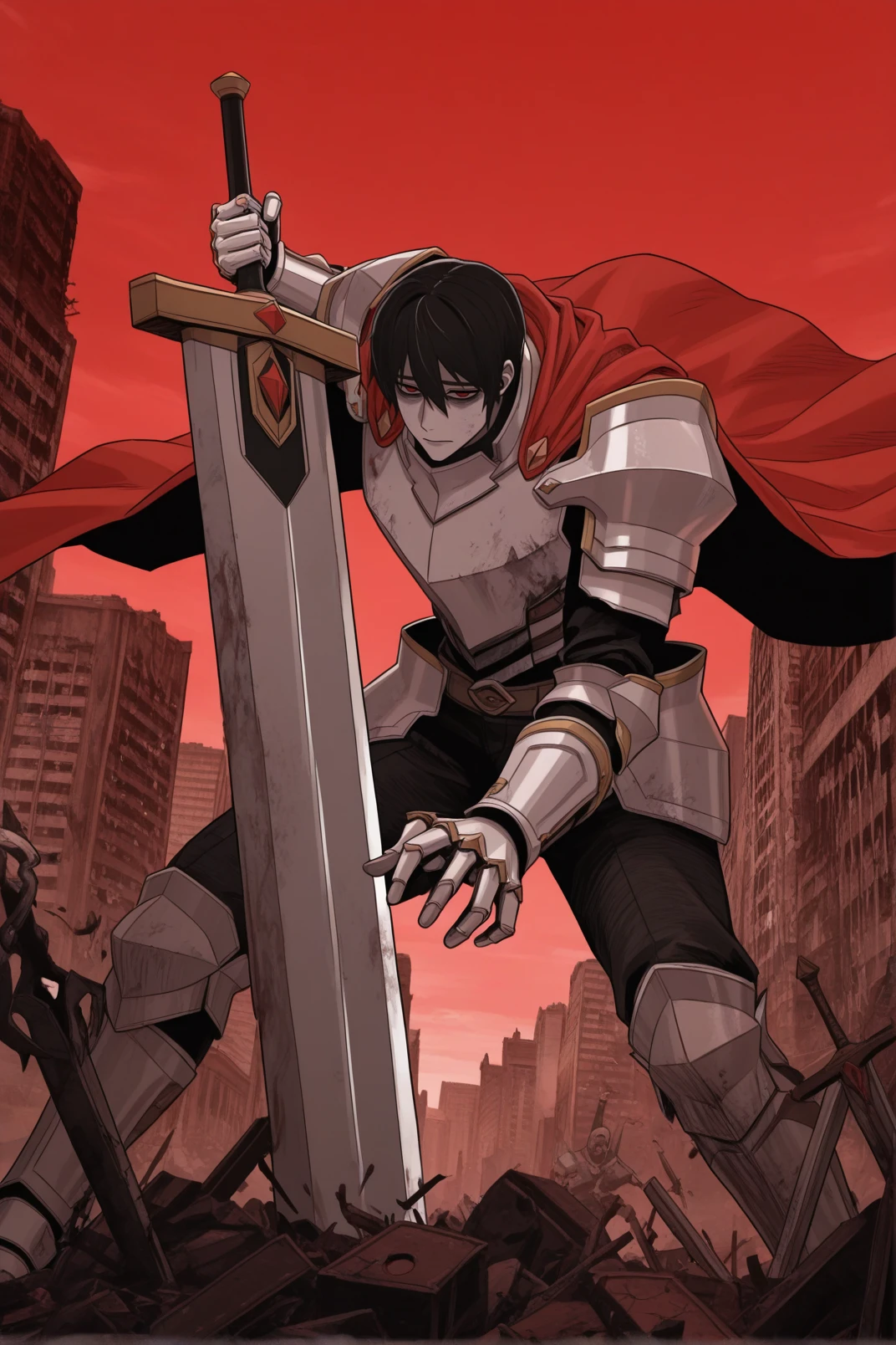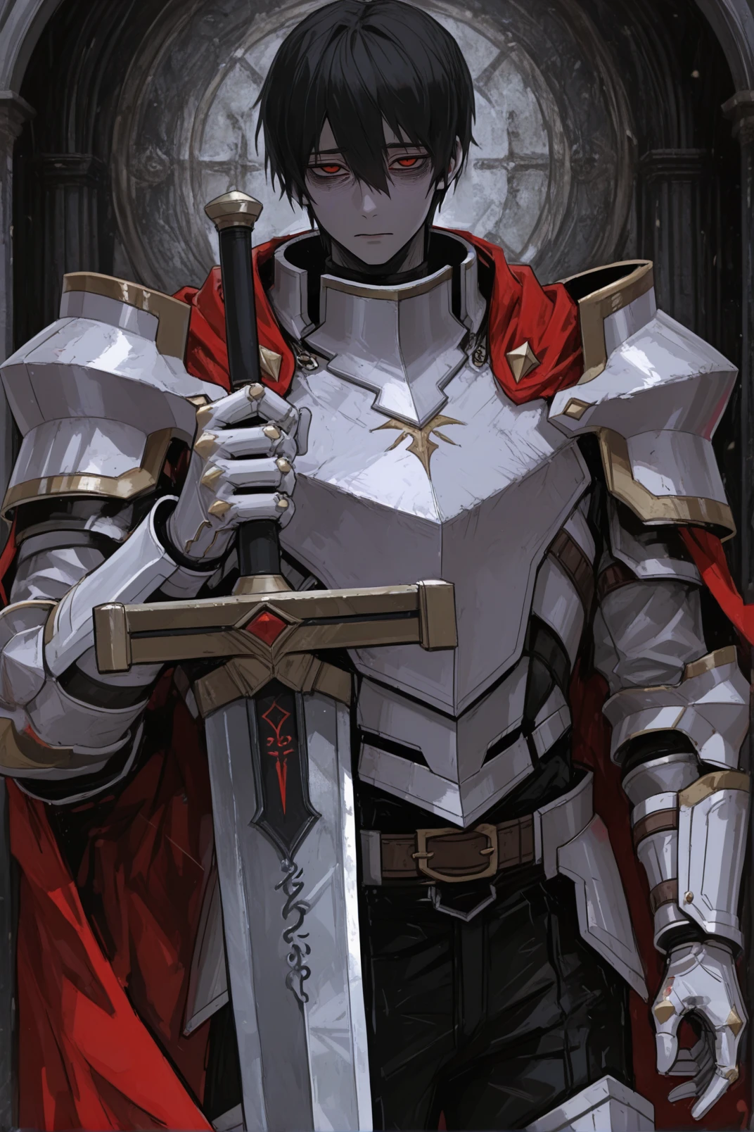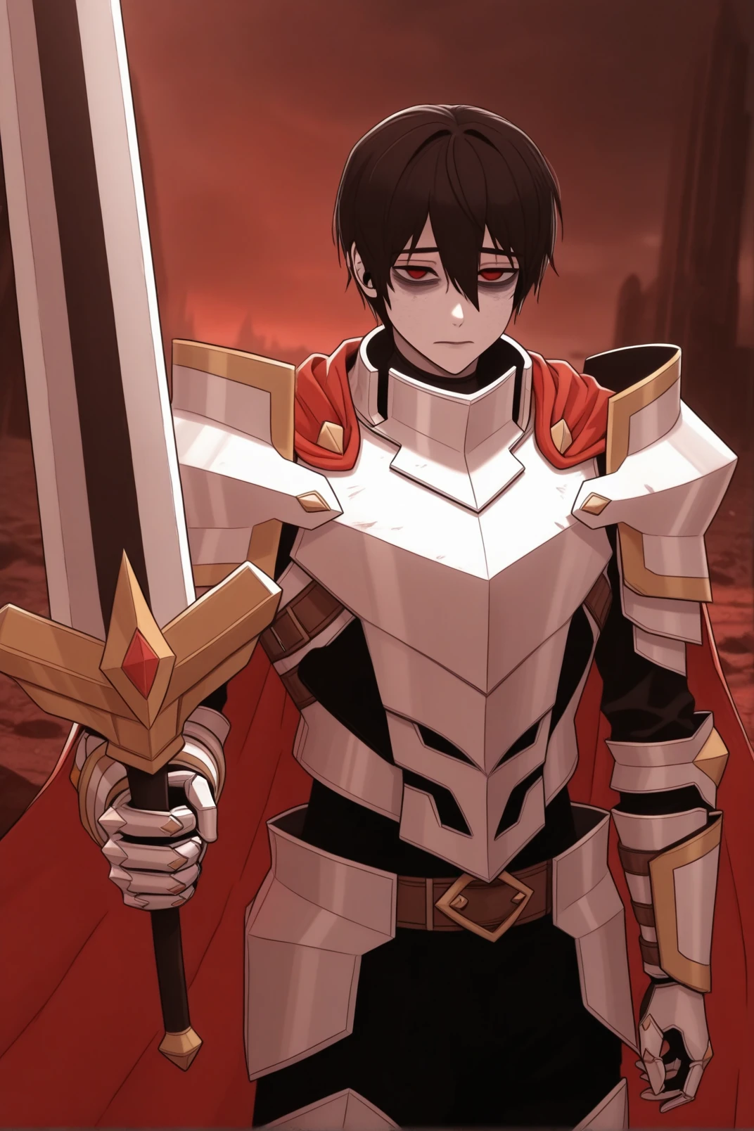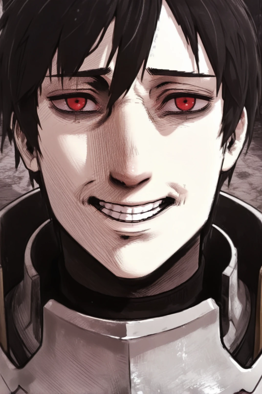 For better appearance add "armor, red cape, red eyes, black hair, pauldrons, bags under eyes, shoulder armor, "