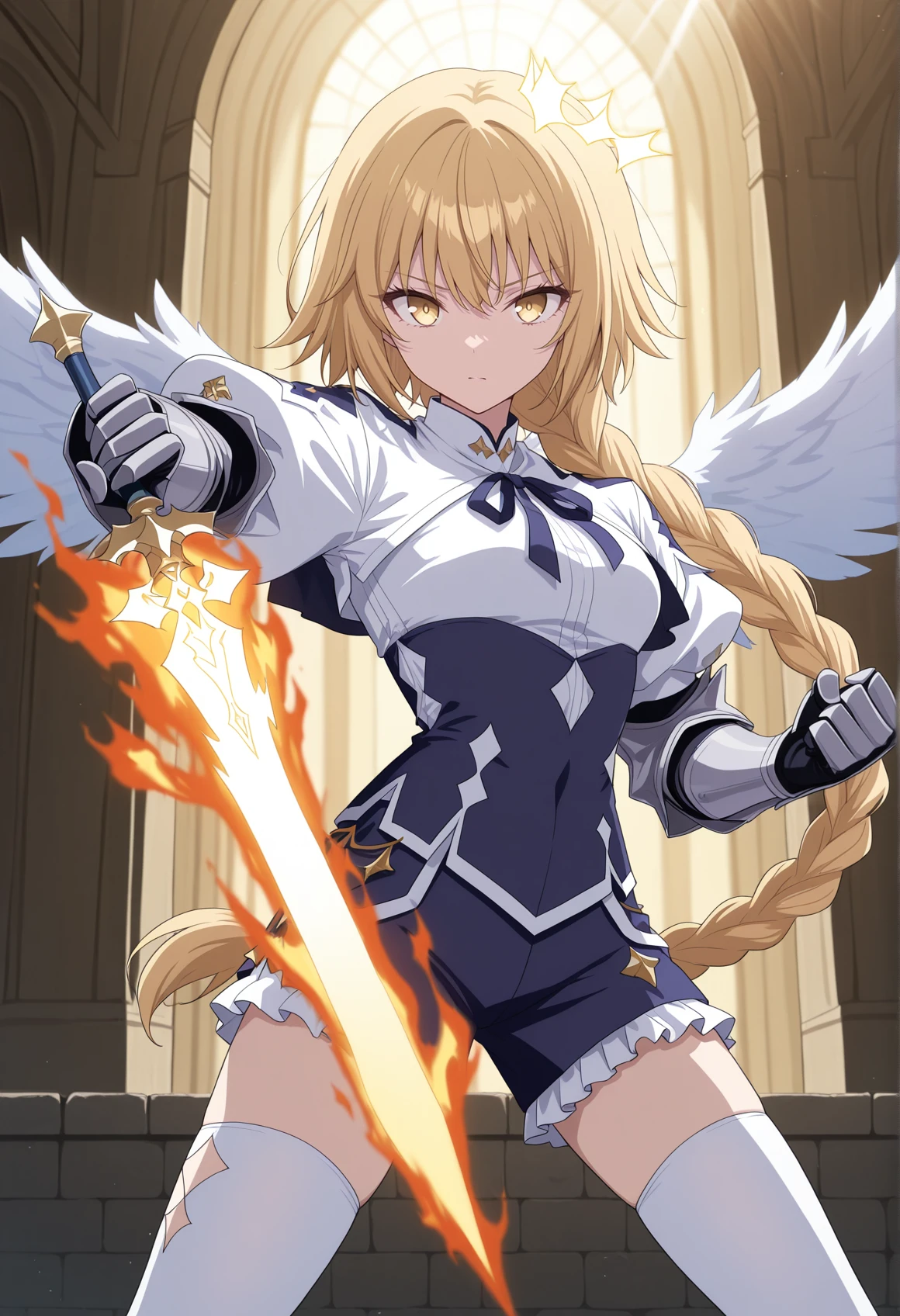 blonde hair, braid, yellow eyes, crown, white shirt, puffy sleeves, capelet, lace trim, gauntlets, blue vest, shorts, thighhighs