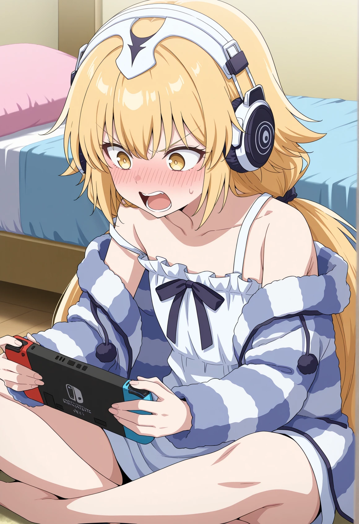 blonde hair, yellow eyes, headphones, camisole, chest ribbon, striped hoodie, off shoulder, low twintails, frilled socks