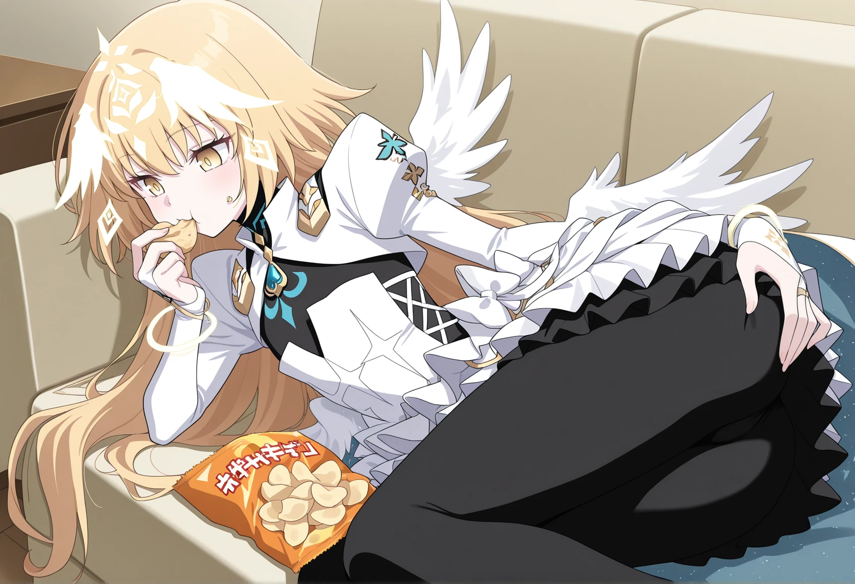 blonde hair, yellow eyes, very long hair, halo, magical girl, short dress, frills, long sleeves, bridal gauntlets, extra wings, skirt ribbon, black pantyhose
