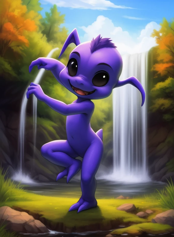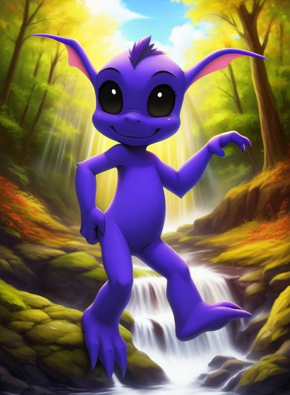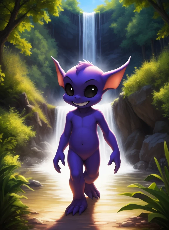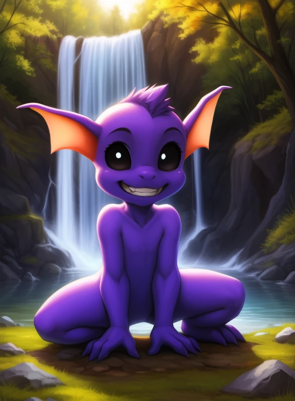 GremlinAmeDraJakLon, gremlin, black eyes, black sclera, purple skin, chibi, small body,