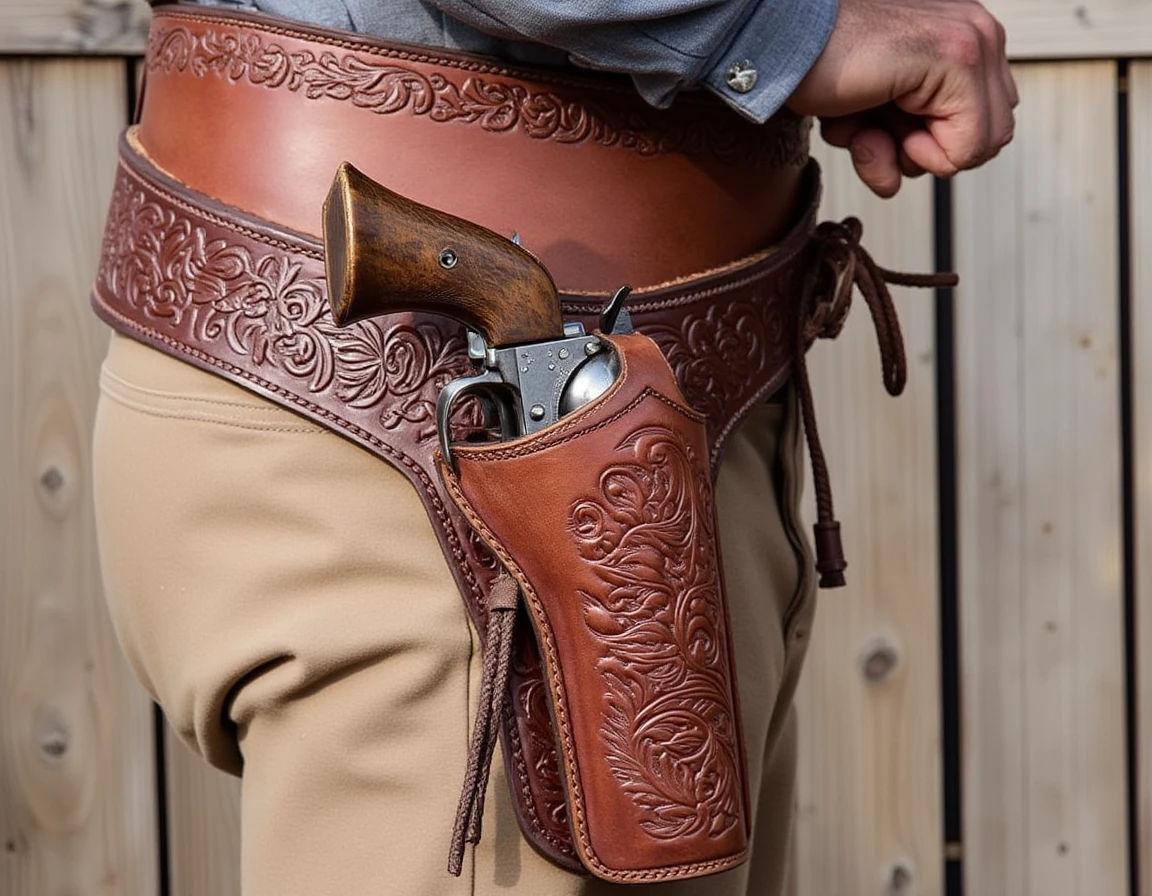 peacemaker, revolver, aiming, shooting, wooden handle, mother of pearl handle, horn handle, holster, revolver in holster, holstered weapon, revolver in holster, dual wielding, cocking revolver, smoke, muzzle flash, long barrel, very long barrel