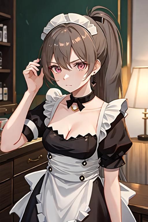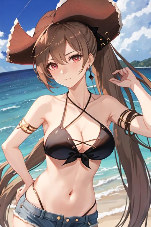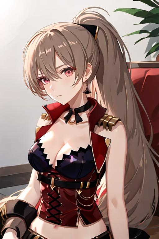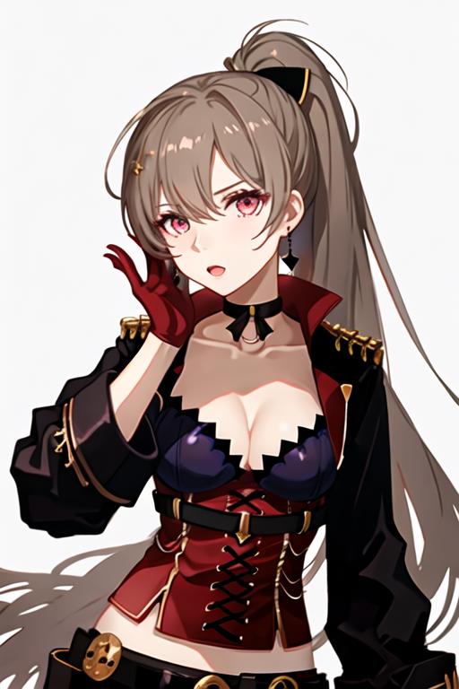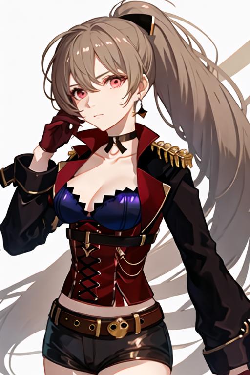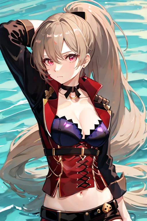 The trigger word is jean_bart_azurlane, and the recommended tags are best quality, masterpiece, highres, solo, {jean_bart_azurlane:1.15}, long_hair, brown_hair, hair_between_eyes, breasts, red_eyes, jewelry, earrings, ponytail, high_ponytail, bangs, collarbone, closed_mouth, medium_breasts, sidelocks, cleavage, very_long_hair, upper_body.