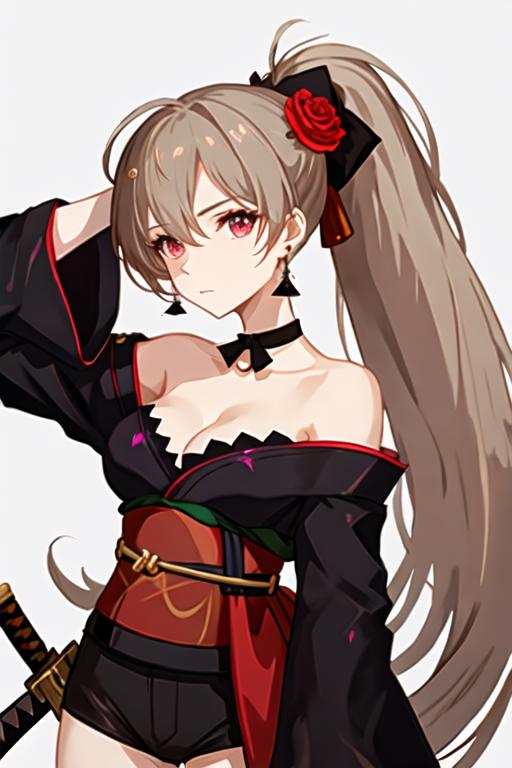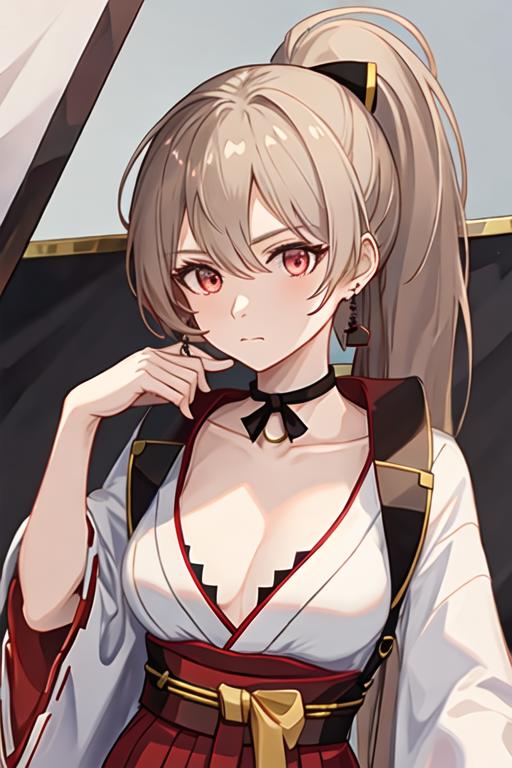 long_hair, brown_hair, hair_between_eyes, breasts, red_eyes, jewelry, earrings, ponytail, high_ponytail, bangs, collarbone, closed_mouth, medium_breasts, sidelocks, cleavage, very_long_hair