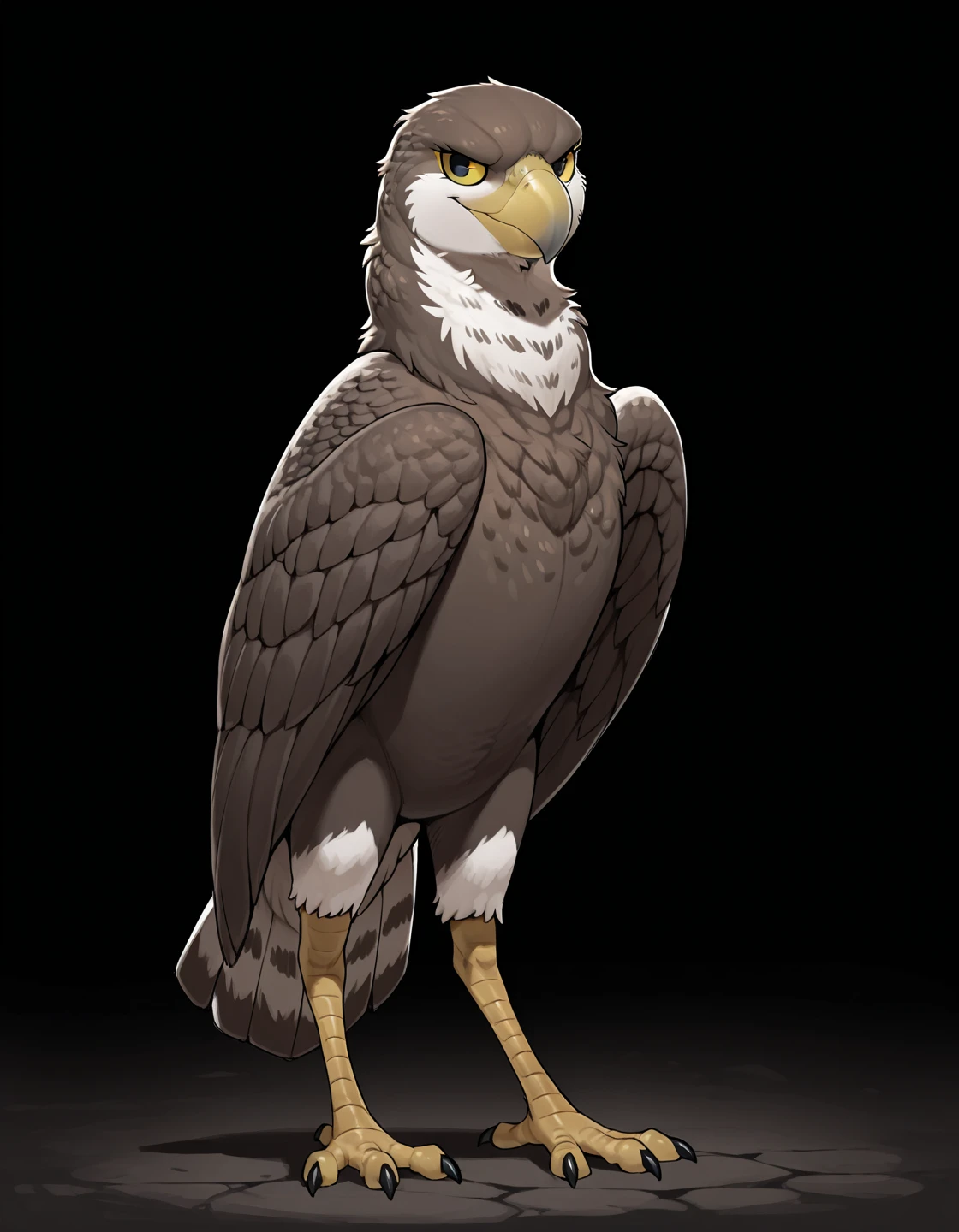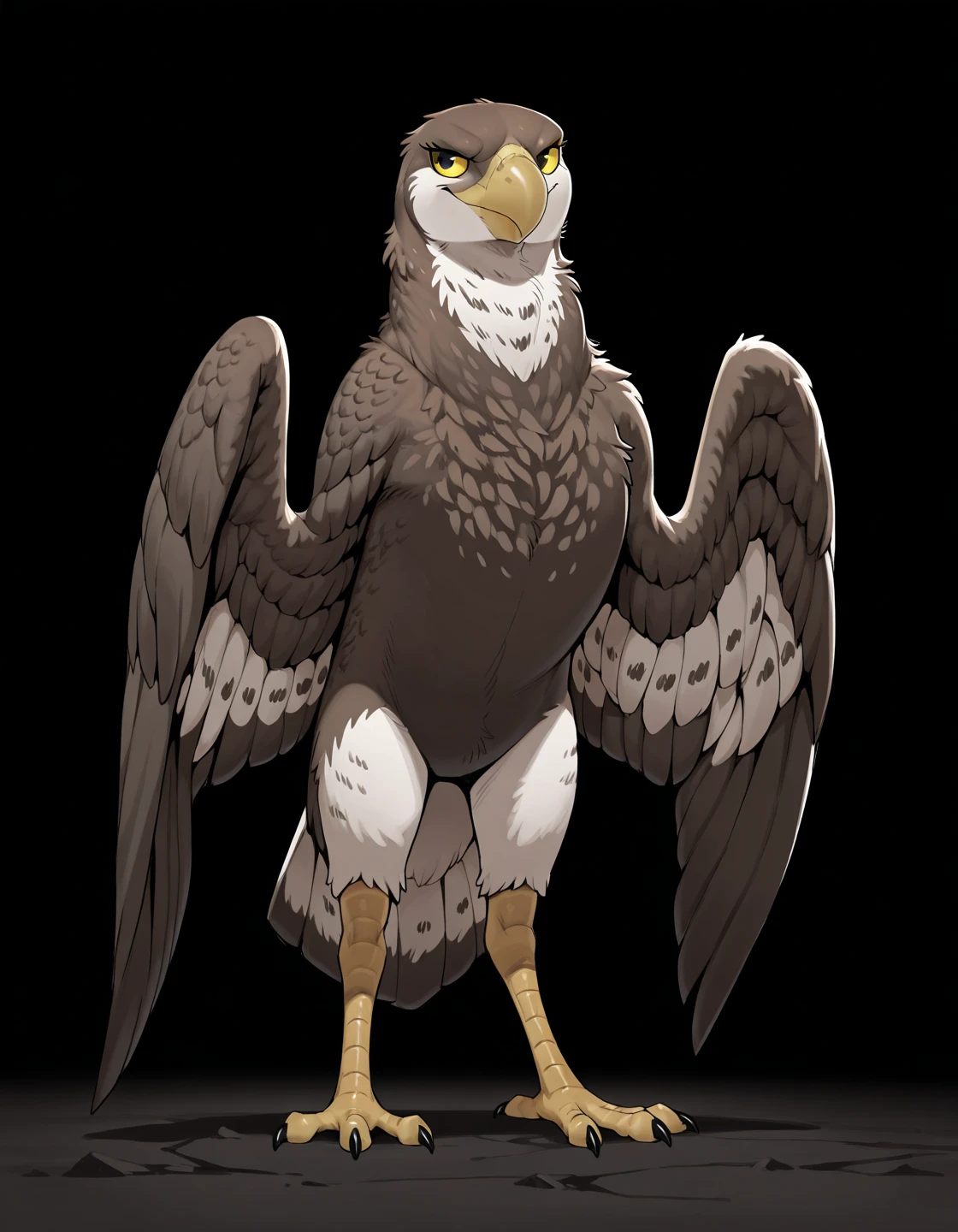 Add " feral, avian, bird, feral bird, beak, buzzard, accipitriform, wings, feathered wings, claws, avian feet, avian head, white body, brown body, brown details, white main body, two tone body, black eyes, yellow sclera" for better results