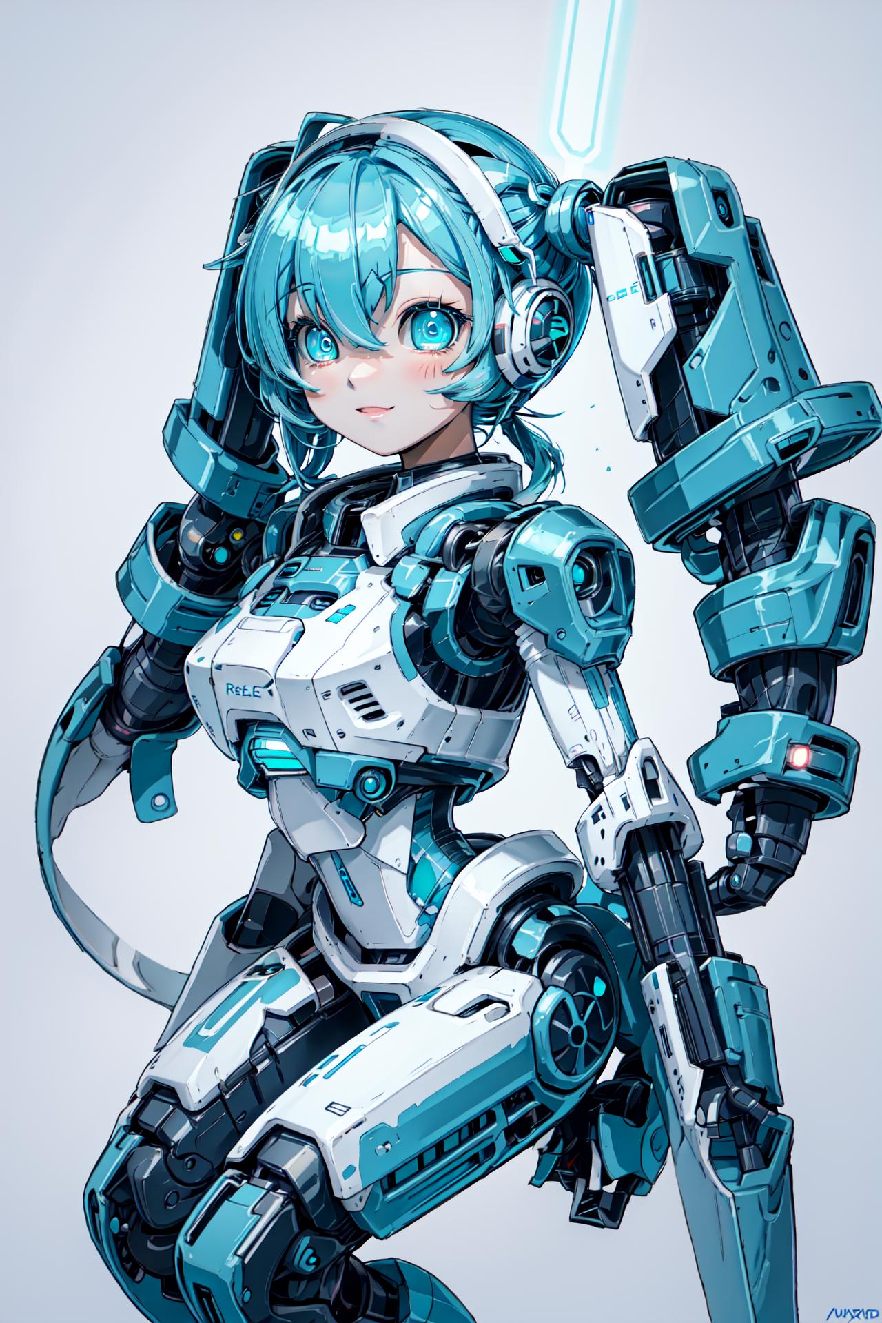smooth steel robot, blue marking, serial number, cylinder on the shoulders, thick forearm