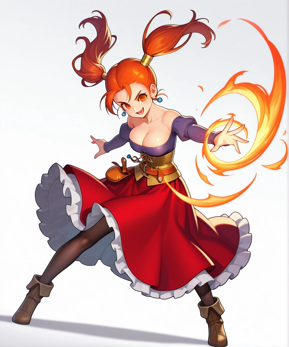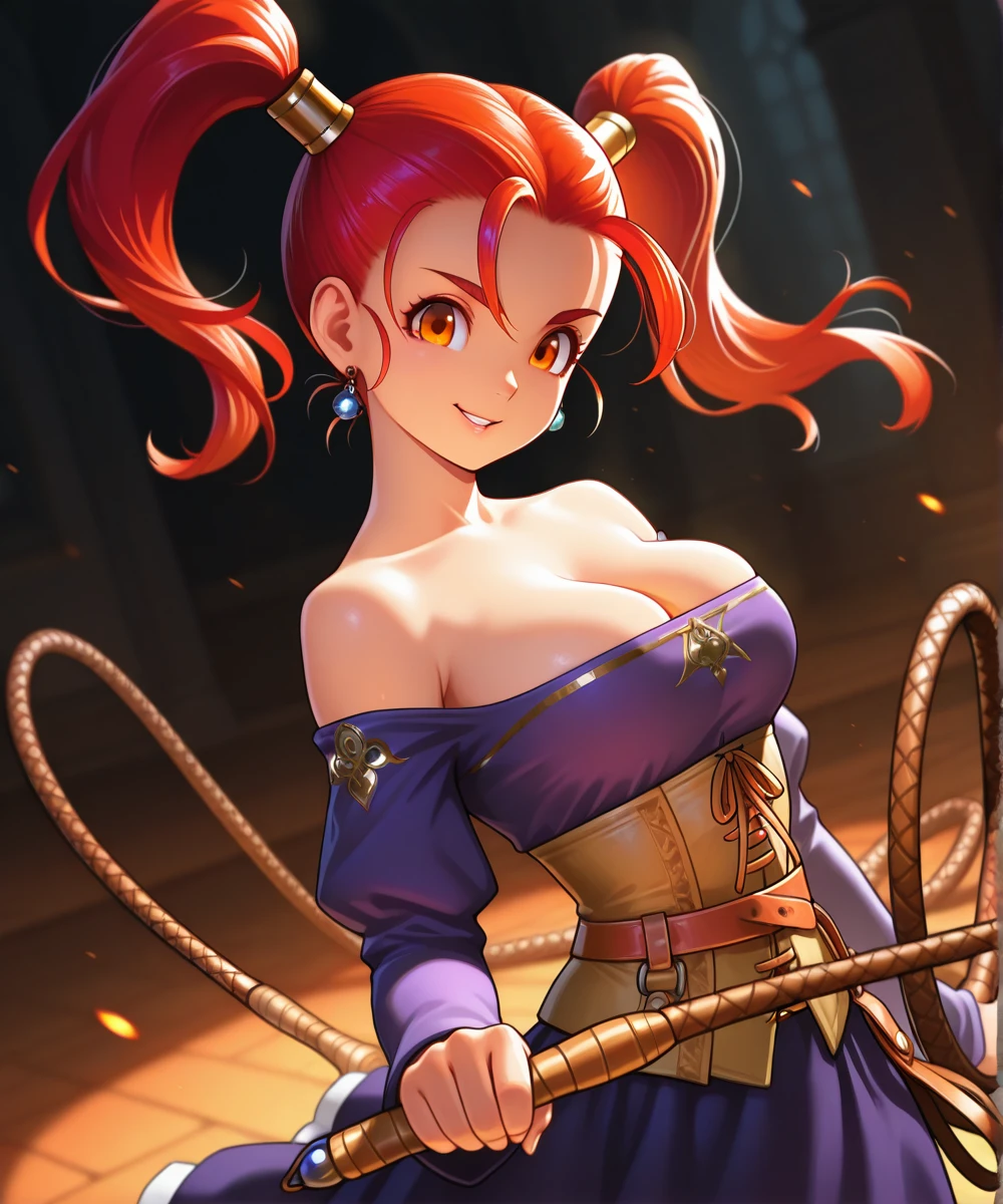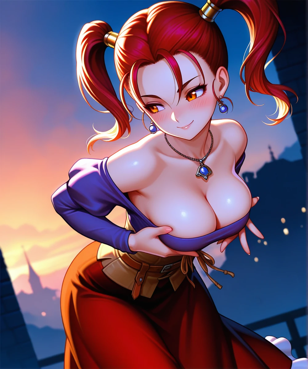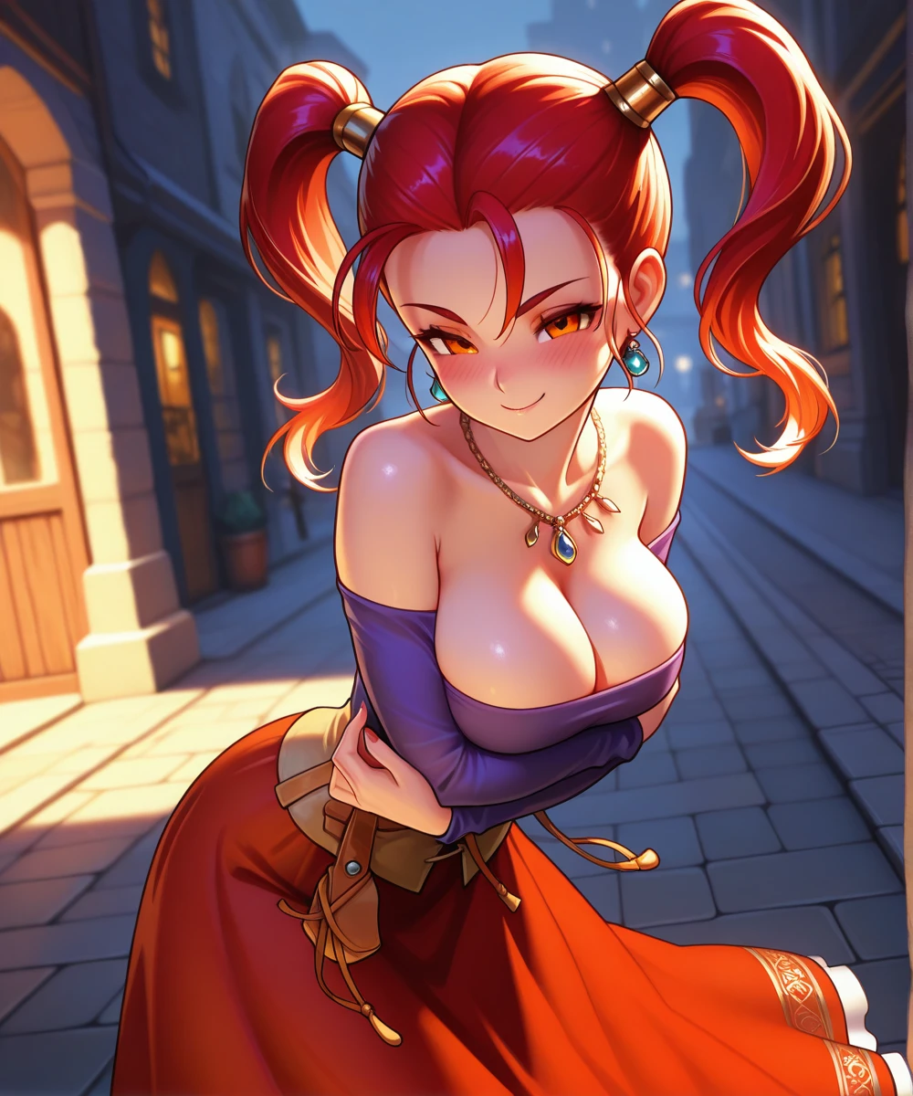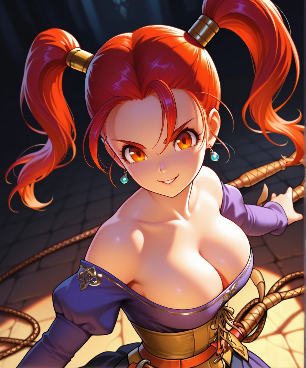 orange eyes, long hair, red hair, twintails, medium breasts
