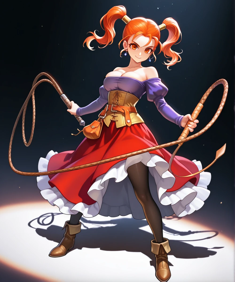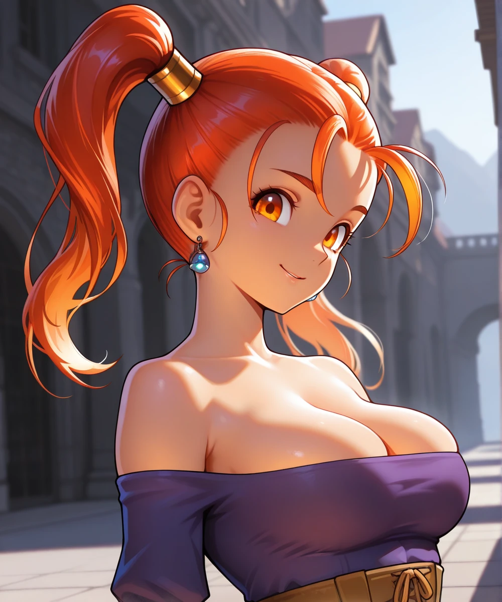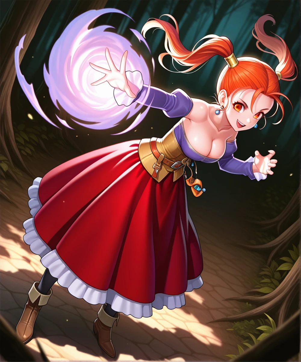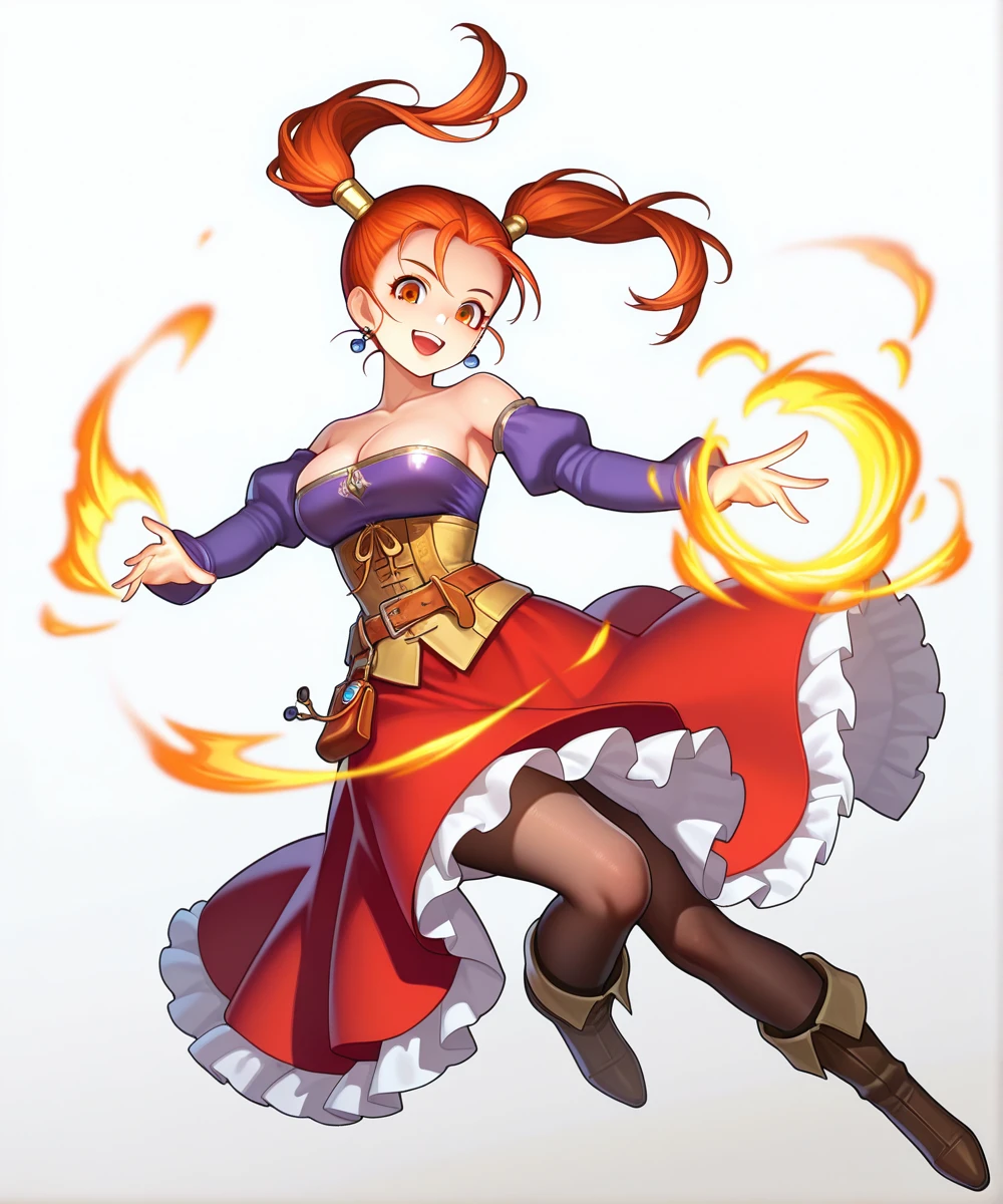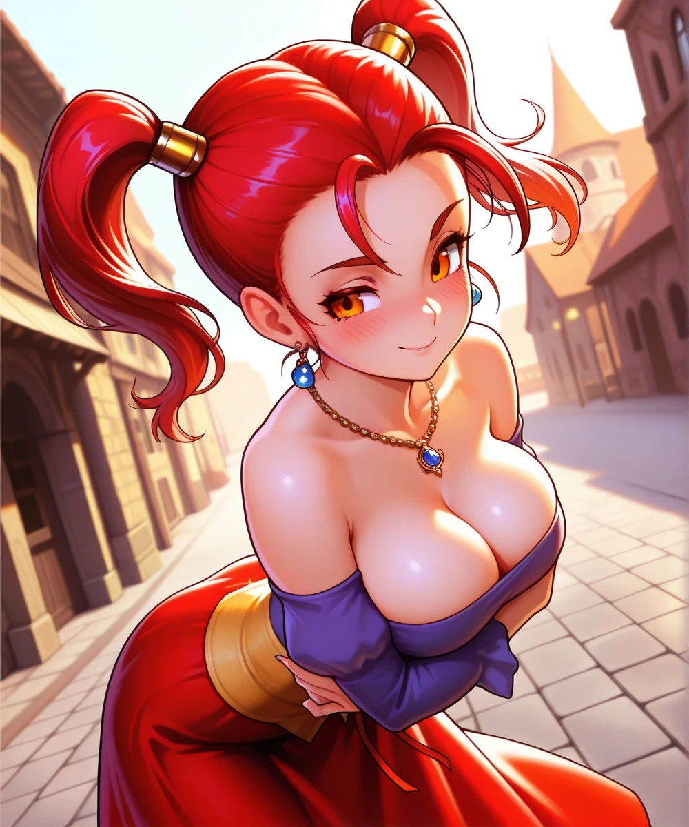 outfit: strapless dress, corset, purple shirt, belt pouch, bare shoulders, cleavage, jewelry, puffy sleeves, pantyhose, earrings, red skirt
